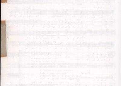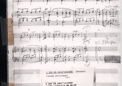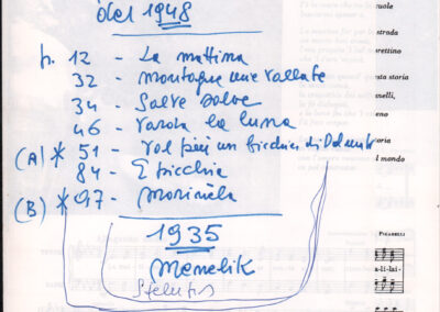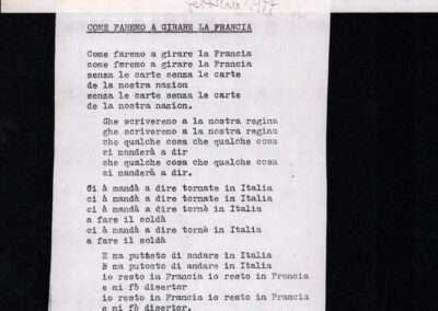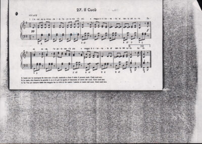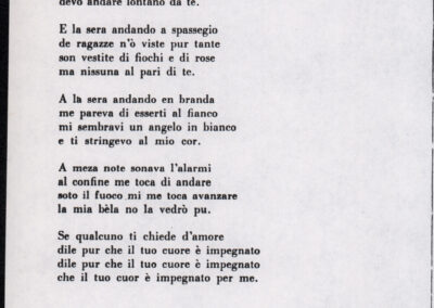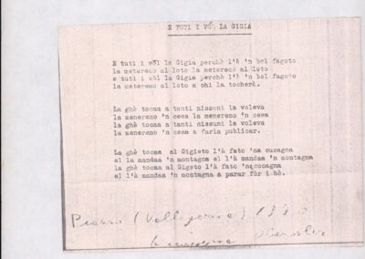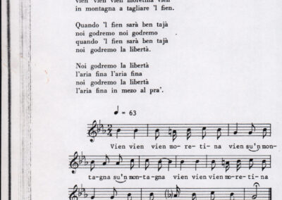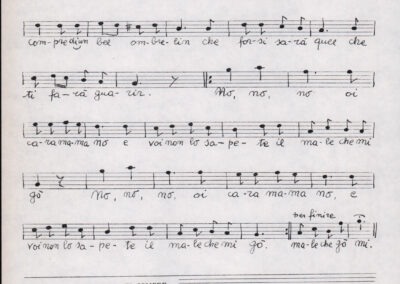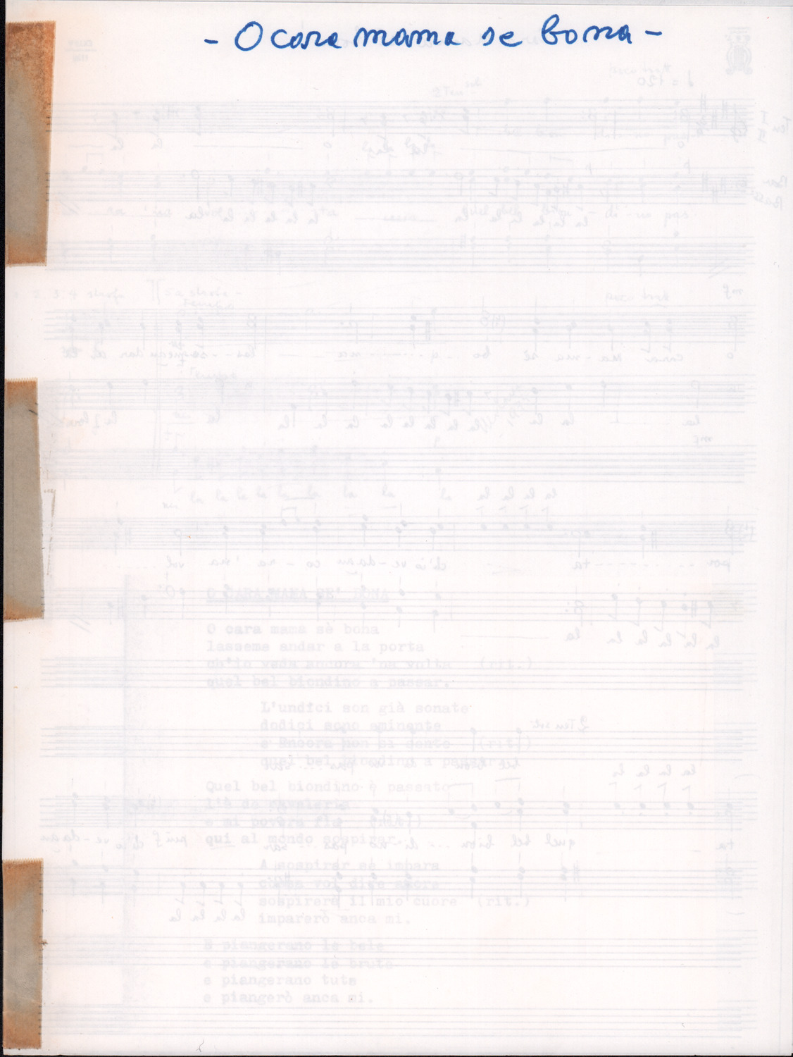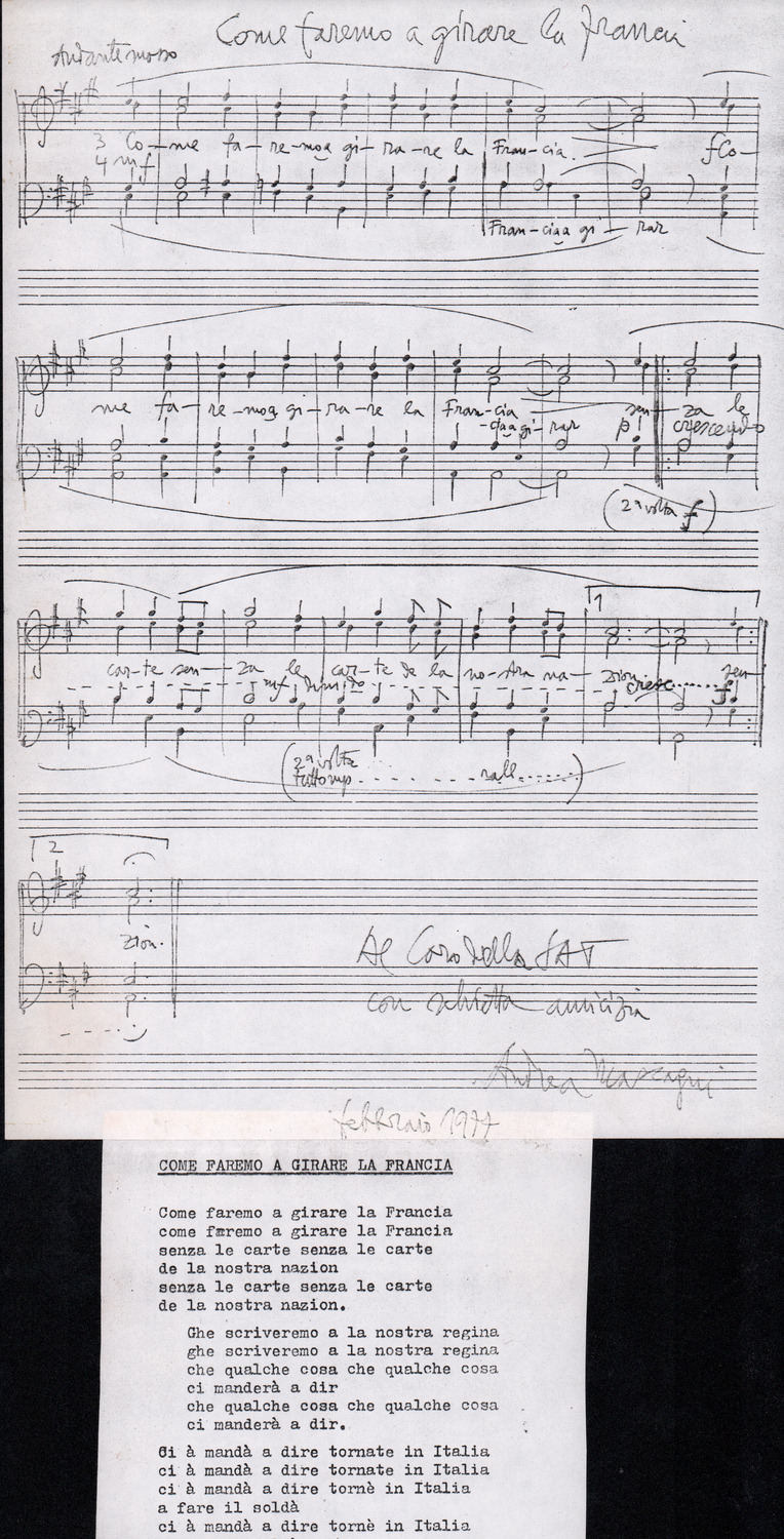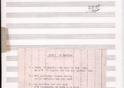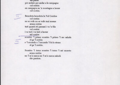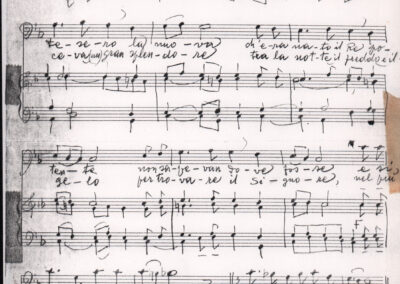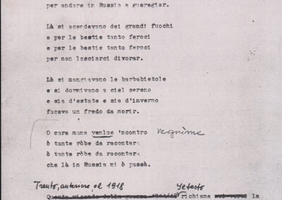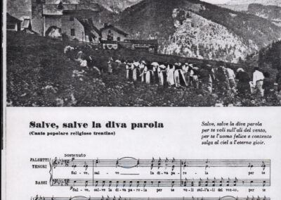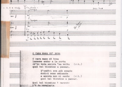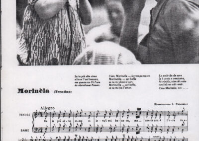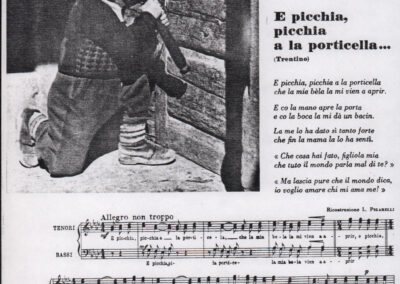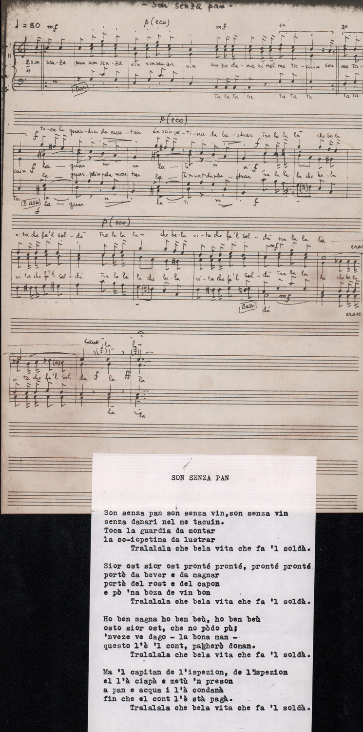 C.4.1.1 - Partiture e testi dei canti I tre Re dell’Oriente, ‘ndormenzete popin, Adeste fideles, Stelutis alpinis, Canto del boschiero, O sanctissima, Cossa gavé voi pare, Dove è la la Gisela, Son senza pan, Senti ‘l martelo, Il cucù, Iande mironai, My Bonnie, El caretér, O cara mama sé bona, Siamo partiti, Varda i mori che bate le ore, Se la te domanda, E tuti i vol la Gigia, L’erba rosa, La moretina, Perché ste còlere, Col ceston, La cartolina, Quando saremo giunti, Vien, vien, bionda d’amor, La banda civica, E l’ò tolta a Matarelo, Bondi y bon an, Come faremo a girare la Francia, Vostu che ti compre, Il povero soldato, Vien moretina, Menelik, Belina come te. Fotocopie degli originali manoscritti dagli armonizzatori, con testi dattiloscritti. 76 cc.