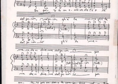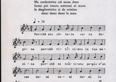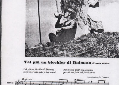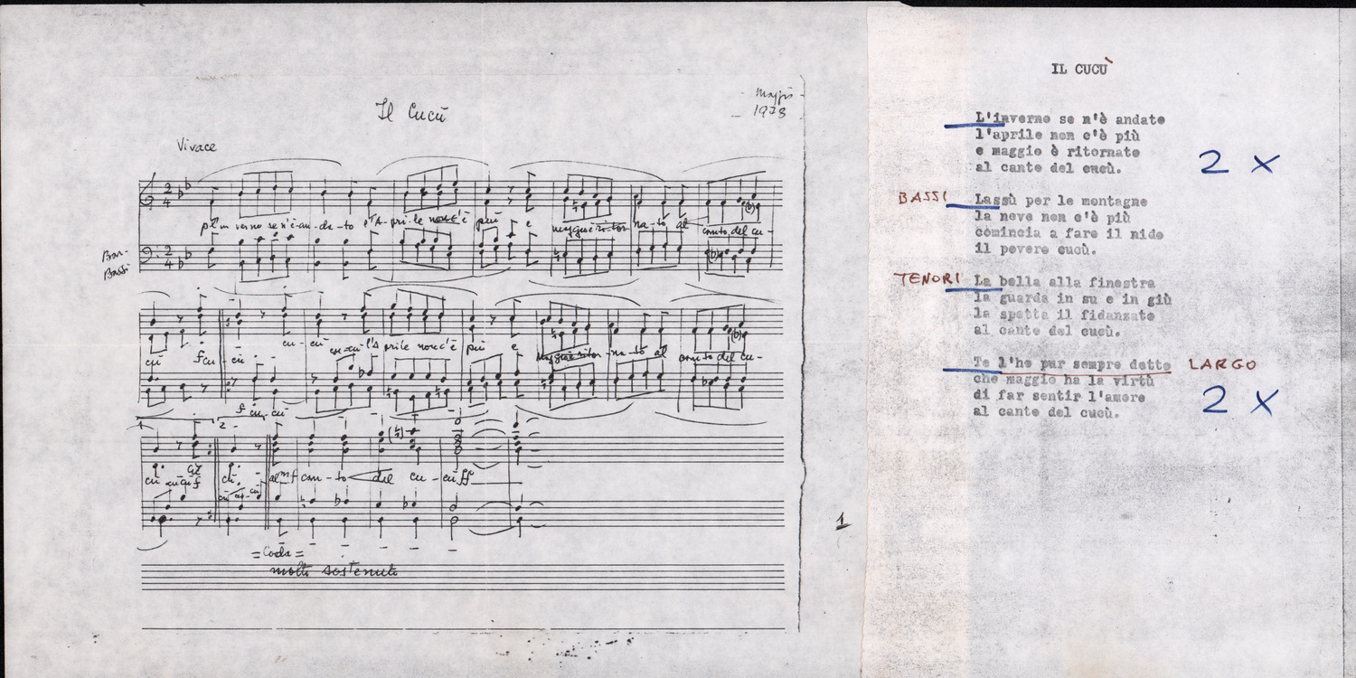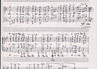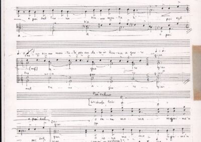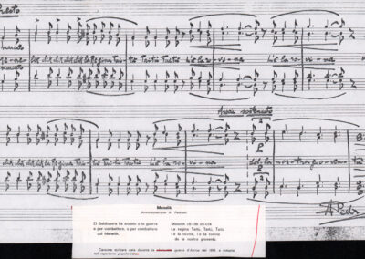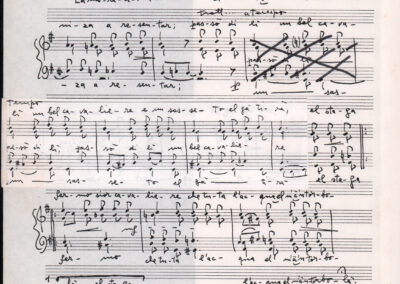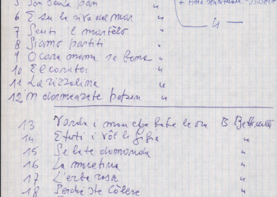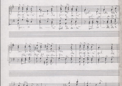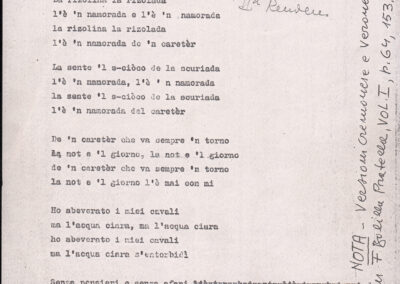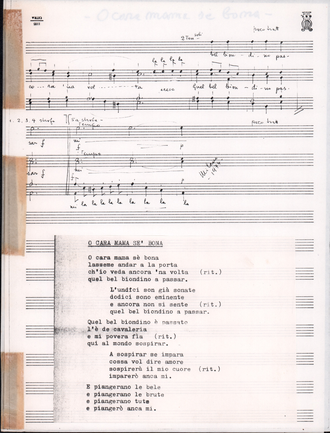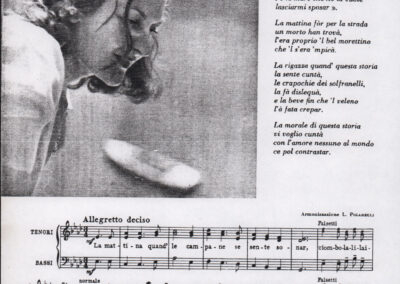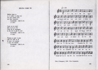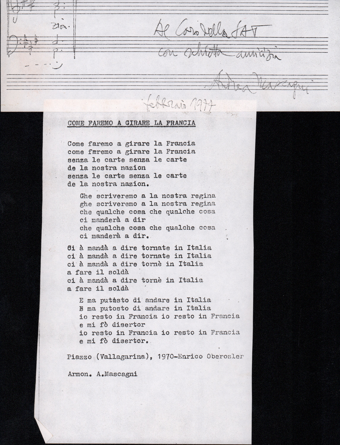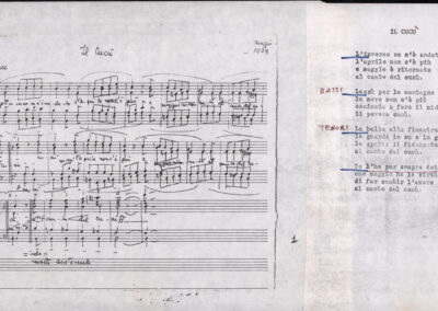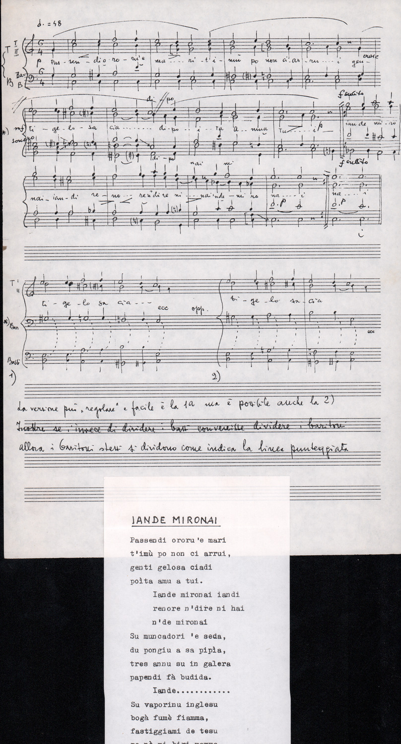 C.4.1.1 - Partiture e testi dei canti I tre Re dell’Oriente, ‘ndormenzete popin, Adeste fideles, Stelutis alpinis, Canto del boschiero, O sanctissima, Cossa gavé voi pare, Dove è la la Gisela, Son senza pan, Senti ‘l martelo, Il cucù, Iande mironai, My Bonnie, El caretér, O cara mama sé bona, Siamo partiti, Varda i mori che bate le ore, Se la te domanda, E tuti i vol la Gigia, L’erba rosa, La moretina, Perché ste còlere, Col ceston, La cartolina, Quando saremo giunti, Vien, vien, bionda d’amor, La banda civica, E l’ò tolta a Matarelo, Bondi y bon an, Come faremo a girare la Francia, Vostu che ti compre, Il povero soldato, Vien moretina, Menelik, Belina come te. Fotocopie degli originali manoscritti dagli armonizzatori, con testi dattiloscritti. 76 cc.