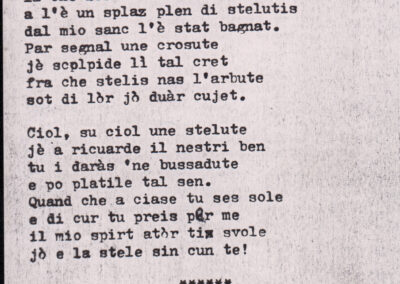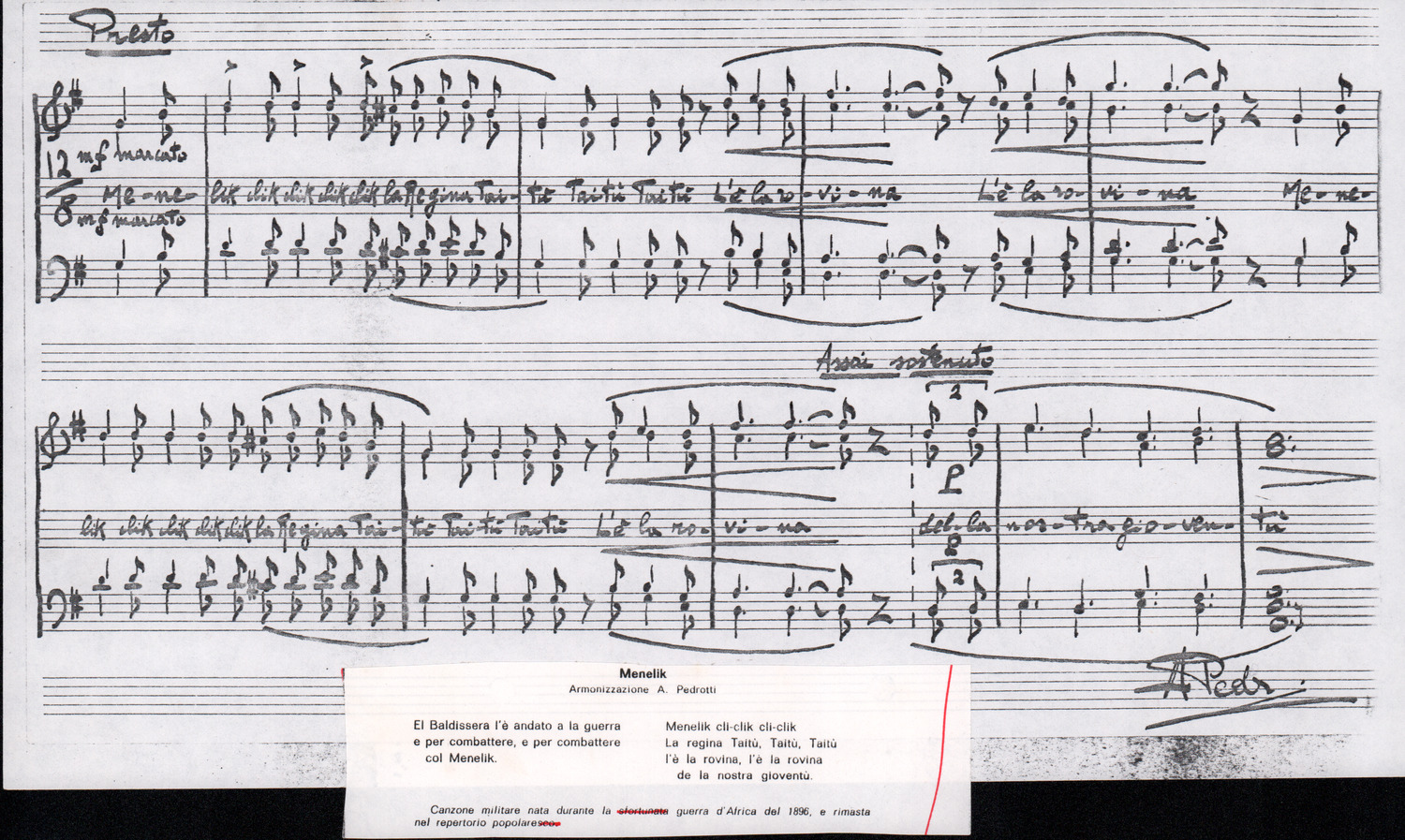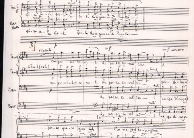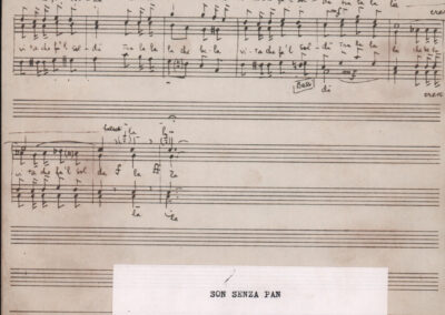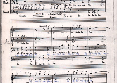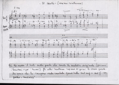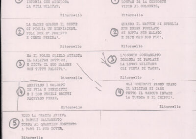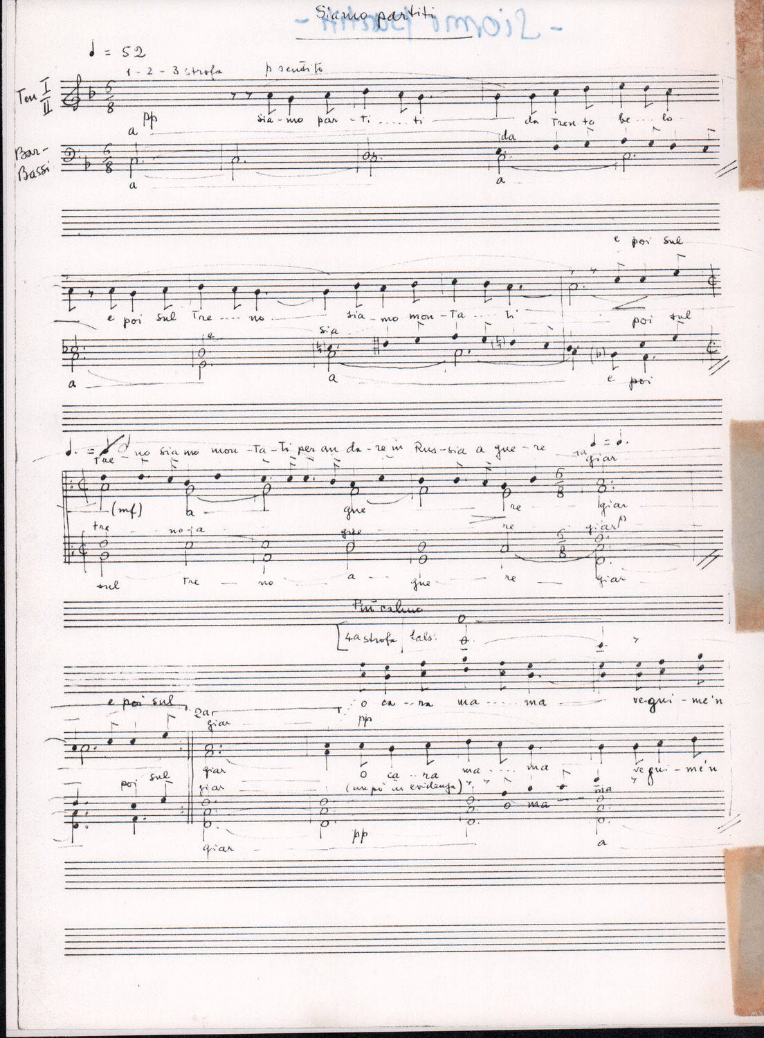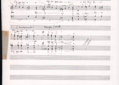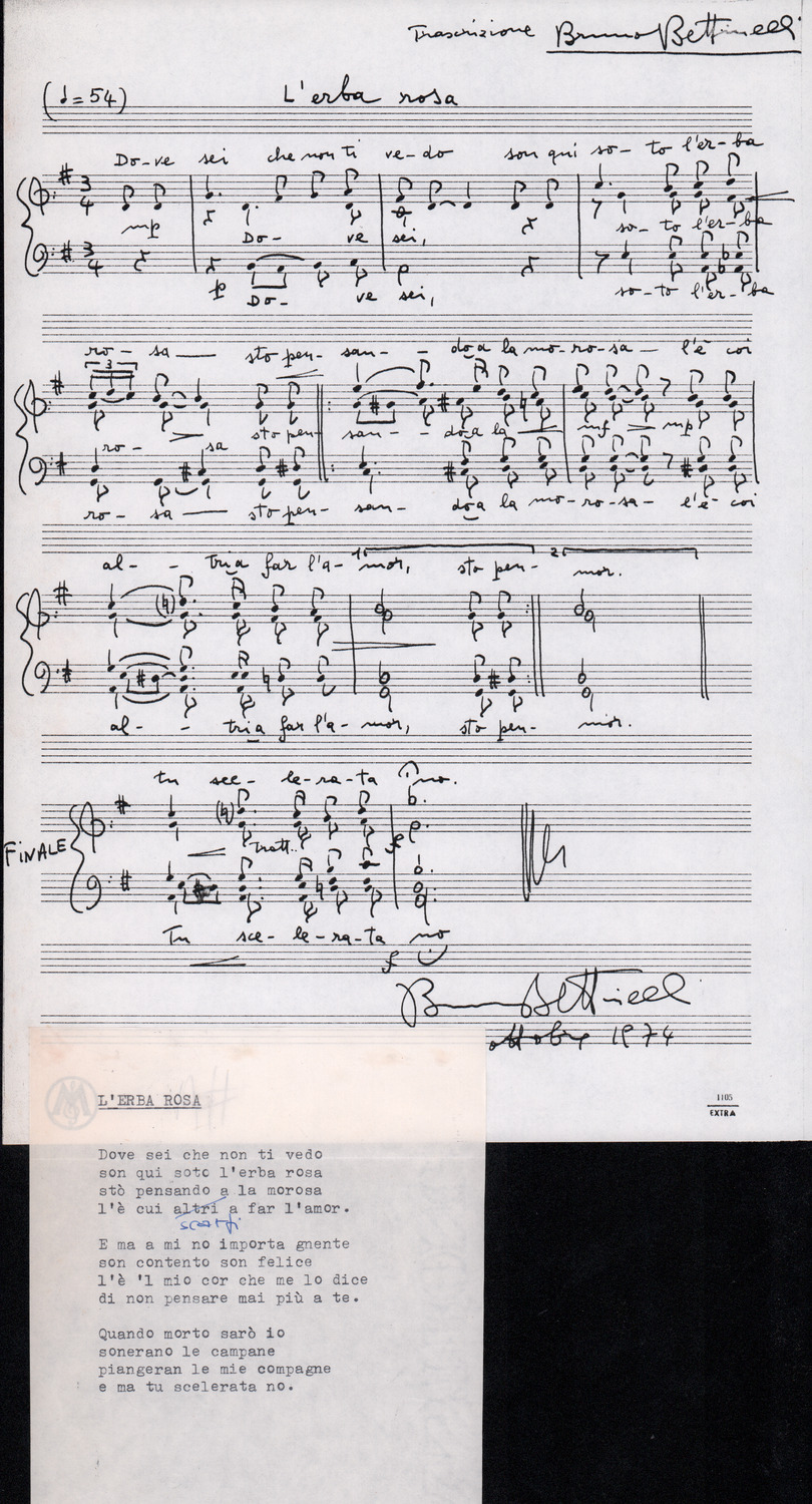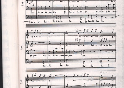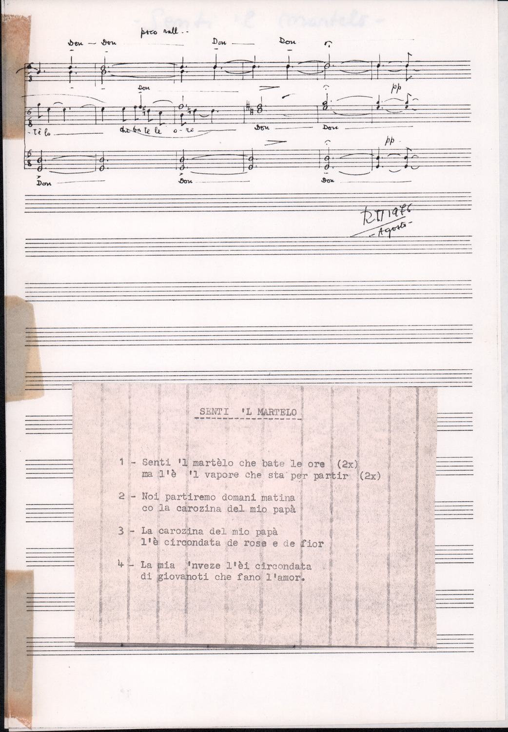 C.4.1.1 - Partiture e testi dei canti I tre Re dell’Oriente, ‘ndormenzete popin, Adeste fideles, Stelutis alpinis, Canto del boschiero, O sanctissima, Cossa gavé voi pare, Dove è la la Gisela, Son senza pan, Senti ‘l martelo, Il cucù, Iande mironai, My Bonnie, El caretér, O cara mama sé bona, Siamo partiti, Varda i mori che bate le ore, Se la te domanda, E tuti i vol la Gigia, L’erba rosa, La moretina, Perché ste còlere, Col ceston, La cartolina, Quando saremo giunti, Vien, vien, bionda d’amor, La banda civica, E l’ò tolta a Matarelo, Bondi y bon an, Come faremo a girare la Francia, Vostu che ti compre, Il povero soldato, Vien moretina, Menelik, Belina come te. Fotocopie degli originali manoscritti dagli armonizzatori, con testi dattiloscritti. 76 cc.