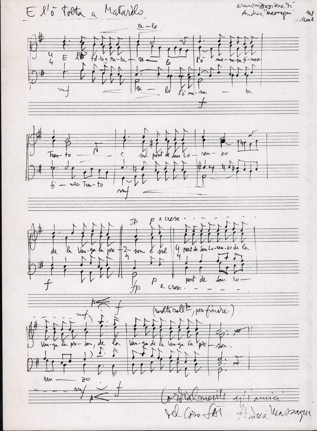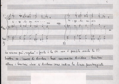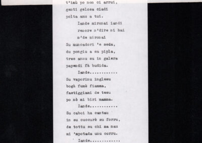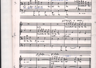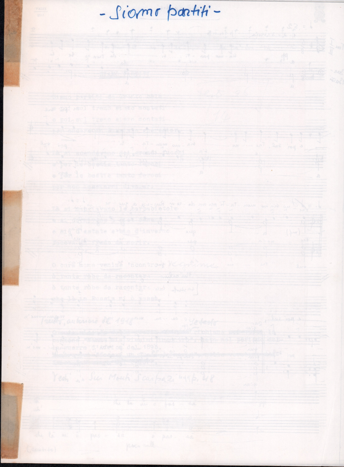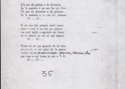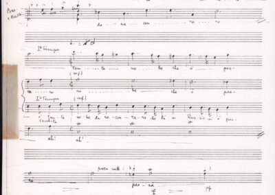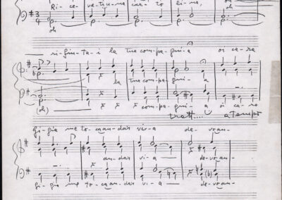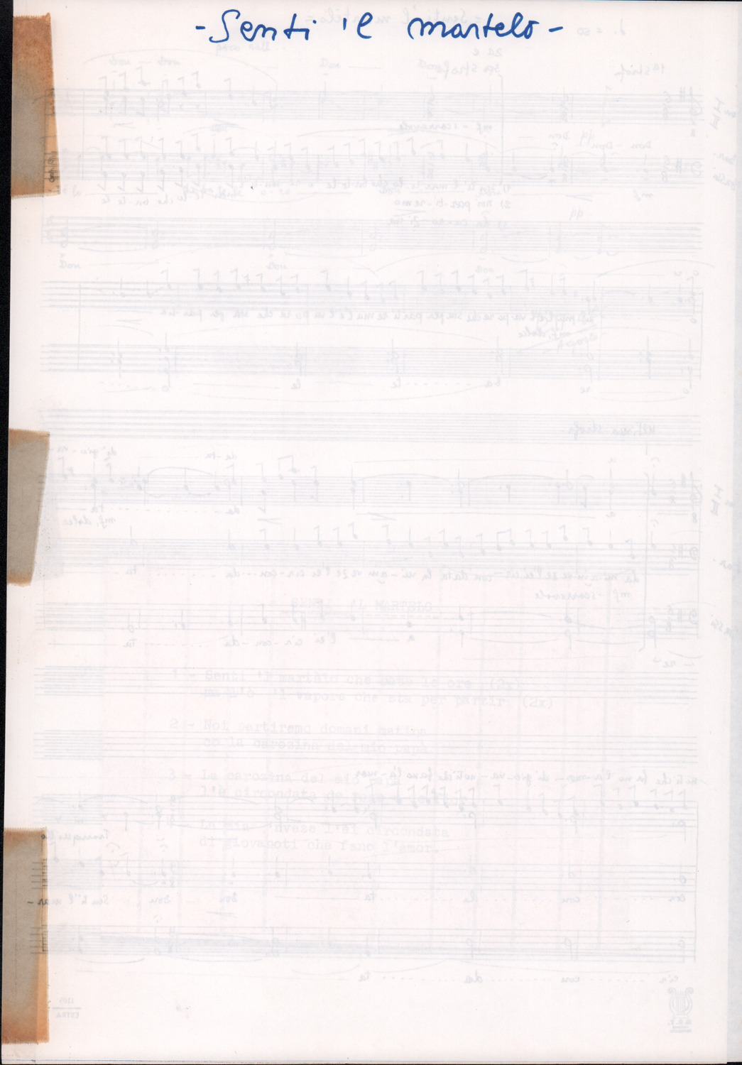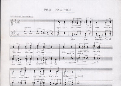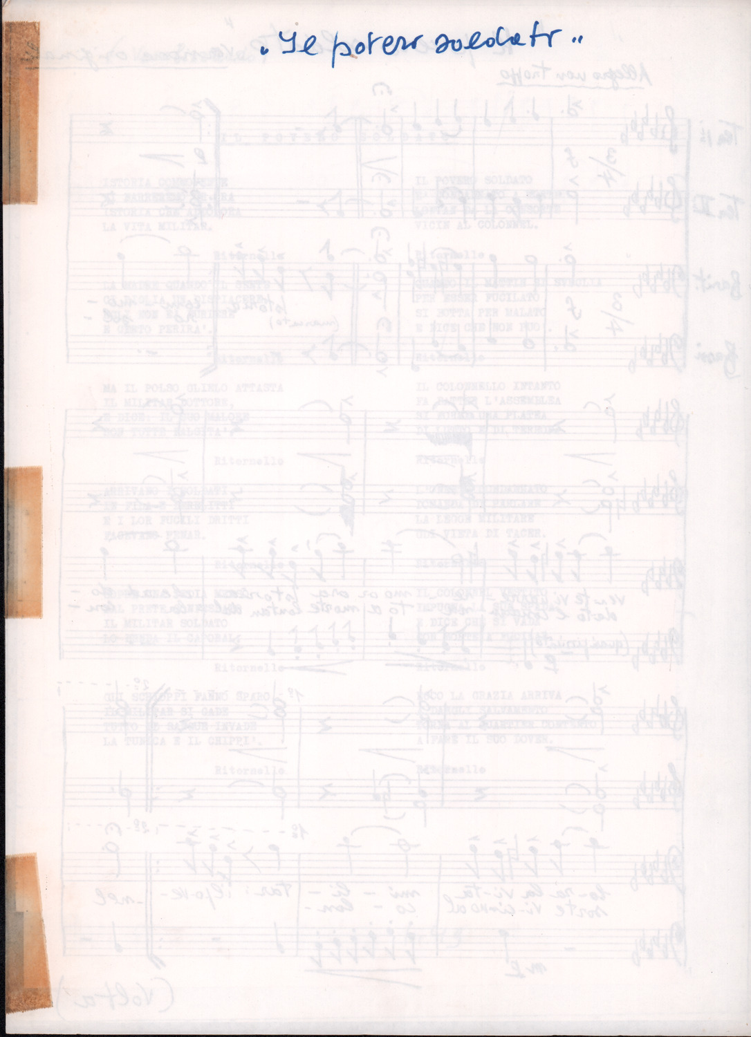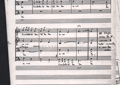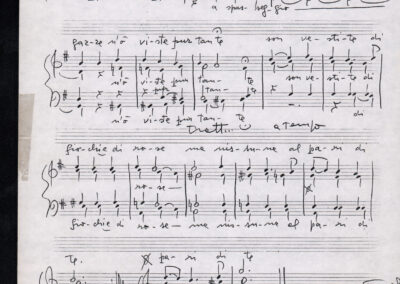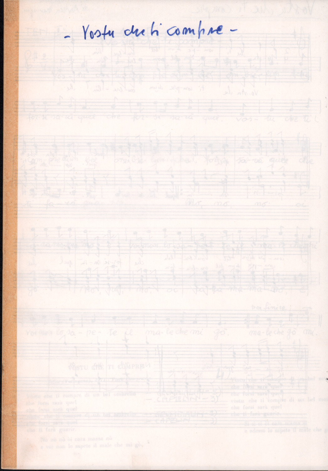 C.4.1.1 - Partiture e testi dei canti I tre Re dell’Oriente, ‘ndormenzete popin, Adeste fideles, Stelutis alpinis, Canto del boschiero, O sanctissima, Cossa gavé voi pare, Dove è la la Gisela, Son senza pan, Senti ‘l martelo, Il cucù, Iande mironai, My Bonnie, El caretér, O cara mama sé bona, Siamo partiti, Varda i mori che bate le ore, Se la te domanda, E tuti i vol la Gigia, L’erba rosa, La moretina, Perché ste còlere, Col ceston, La cartolina, Quando saremo giunti, Vien, vien, bionda d’amor, La banda civica, E l’ò tolta a Matarelo, Bondi y bon an, Come faremo a girare la Francia, Vostu che ti compre, Il povero soldato, Vien moretina, Menelik, Belina come te. Fotocopie degli originali manoscritti dagli armonizzatori, con testi dattiloscritti. 76 cc.