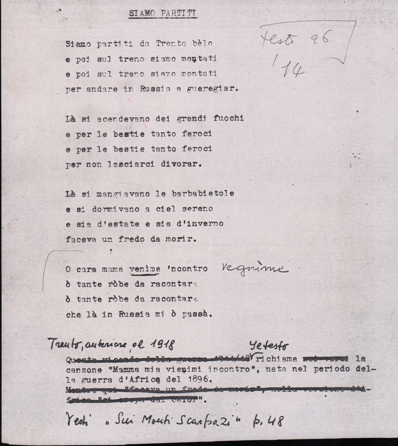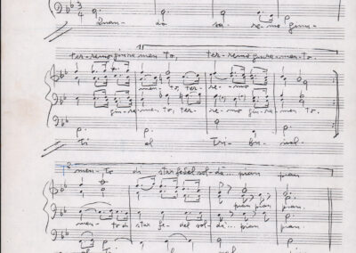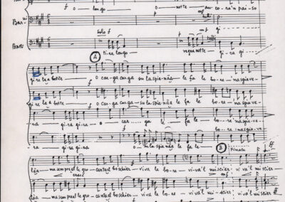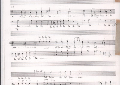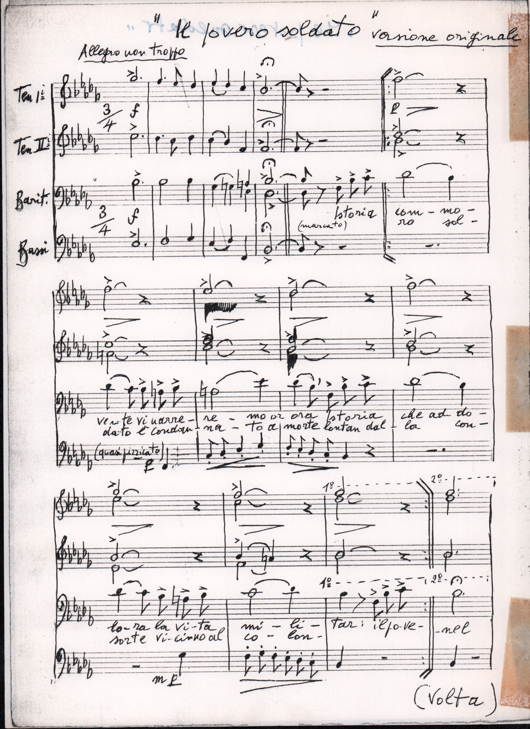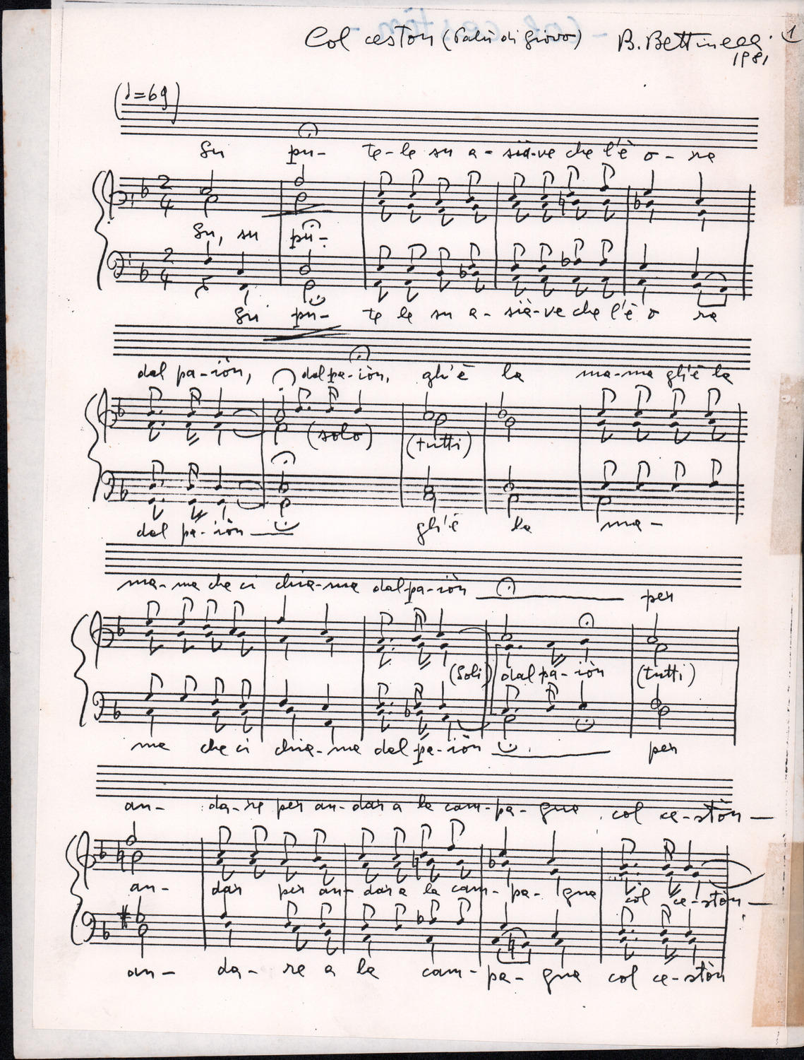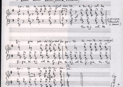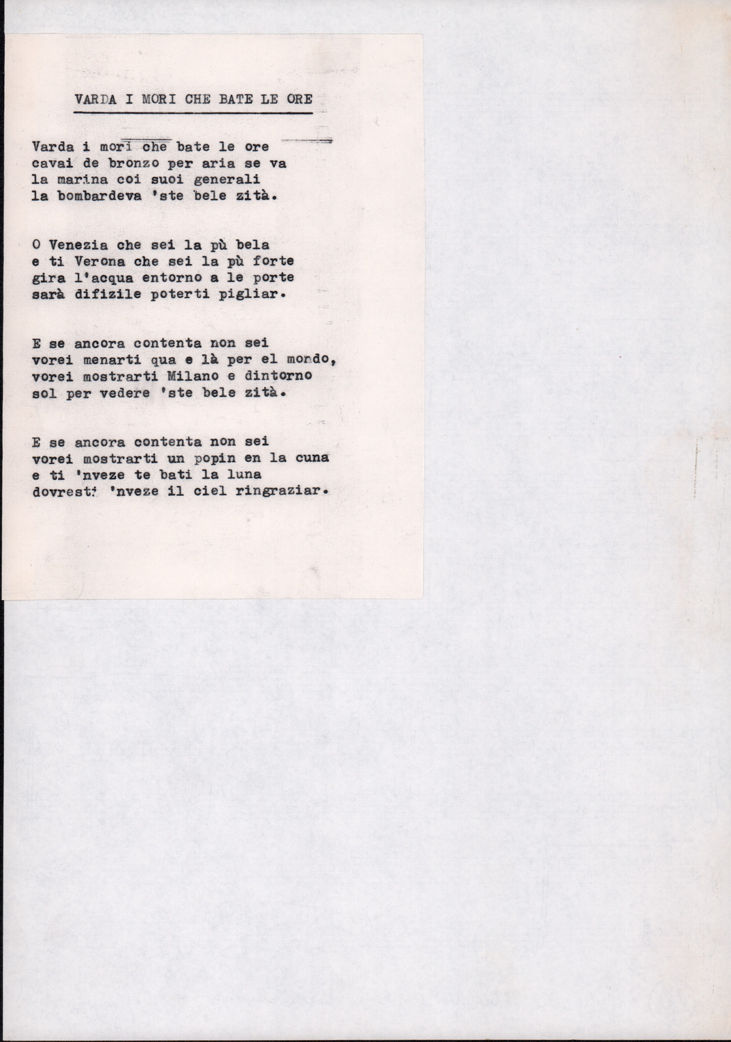 C.4.1.1 - Partiture e testi dei canti I tre Re dell’Oriente, ‘ndormenzete popin, Adeste fideles, Stelutis alpinis, Canto del boschiero, O sanctissima, Cossa gavé voi pare, Dove è la la Gisela, Son senza pan, Senti ‘l martelo, Il cucù, Iande mironai, My Bonnie, El caretér, O cara mama sé bona, Siamo partiti, Varda i mori che bate le ore, Se la te domanda, E tuti i vol la Gigia, L’erba rosa, La moretina, Perché ste còlere, Col ceston, La cartolina, Quando saremo giunti, Vien, vien, bionda d’amor, La banda civica, E l’ò tolta a Matarelo, Bondi y bon an, Come faremo a girare la Francia, Vostu che ti compre, Il povero soldato, Vien moretina, Menelik, Belina come te. Fotocopie degli originali manoscritti dagli armonizzatori, con testi dattiloscritti. 76 cc.