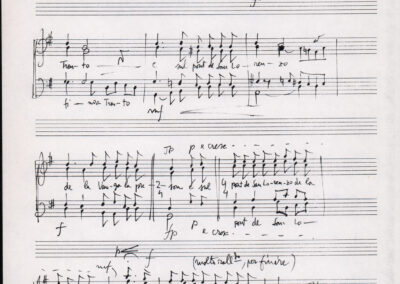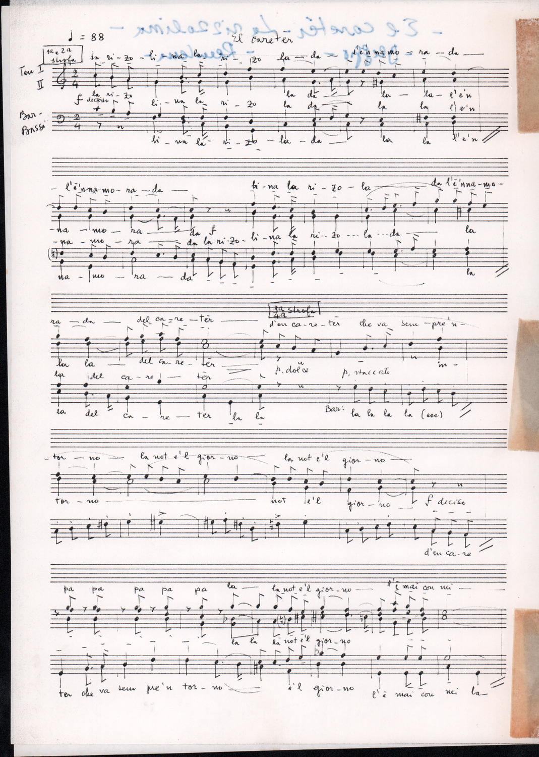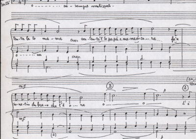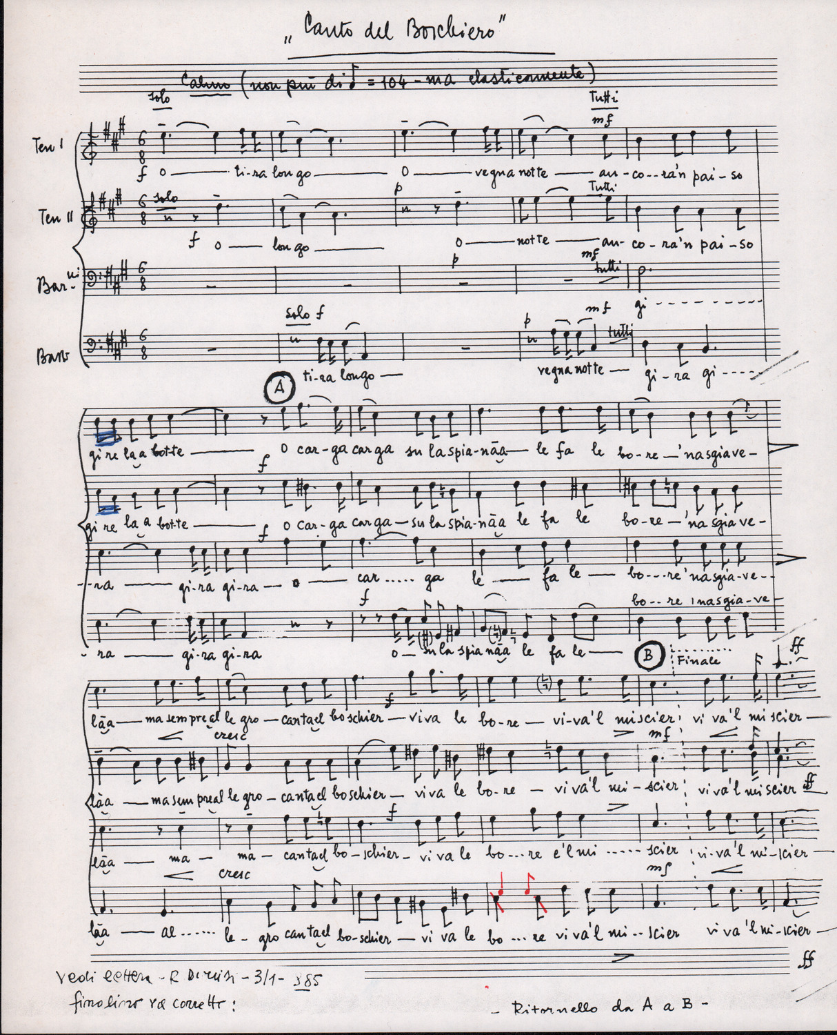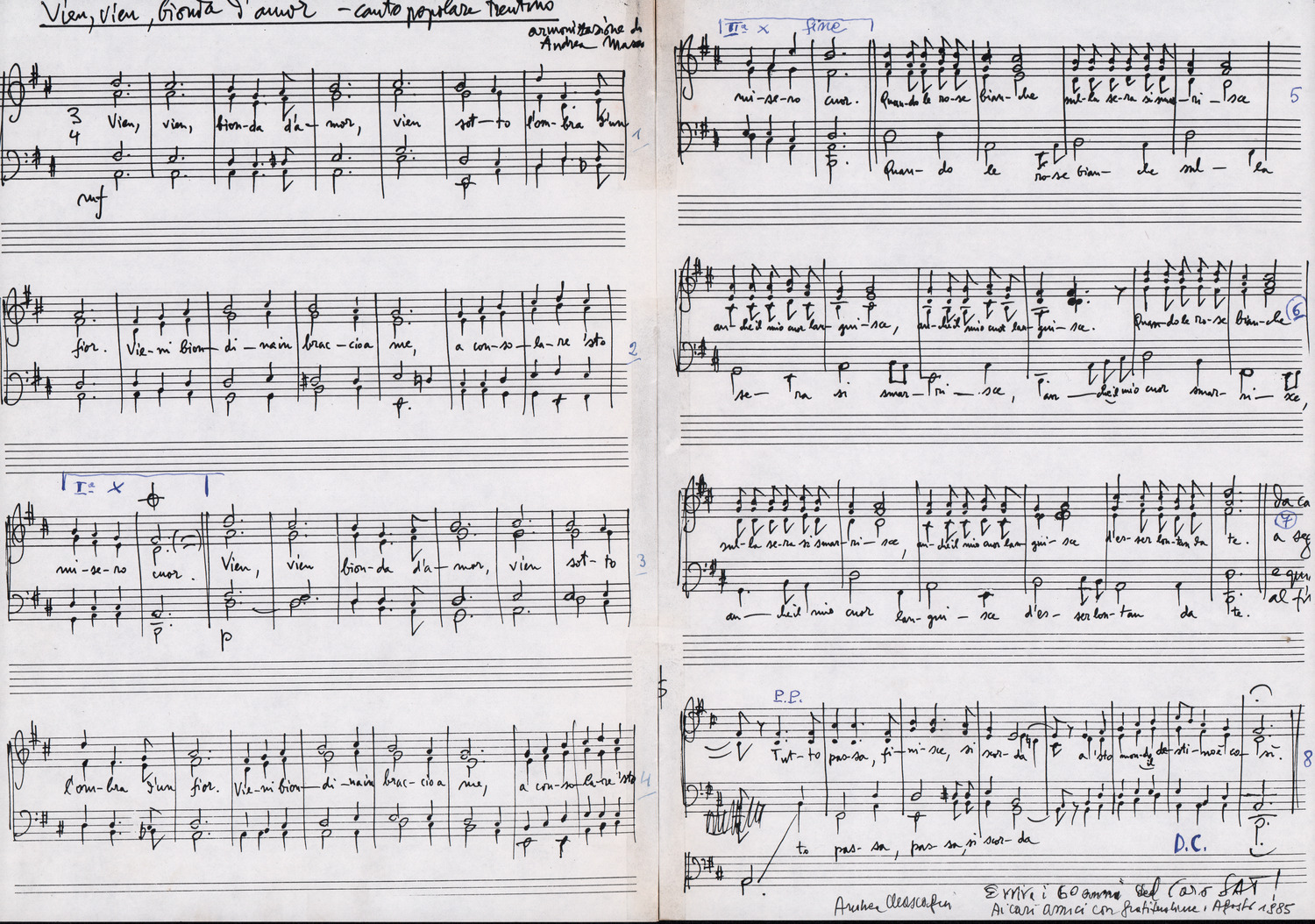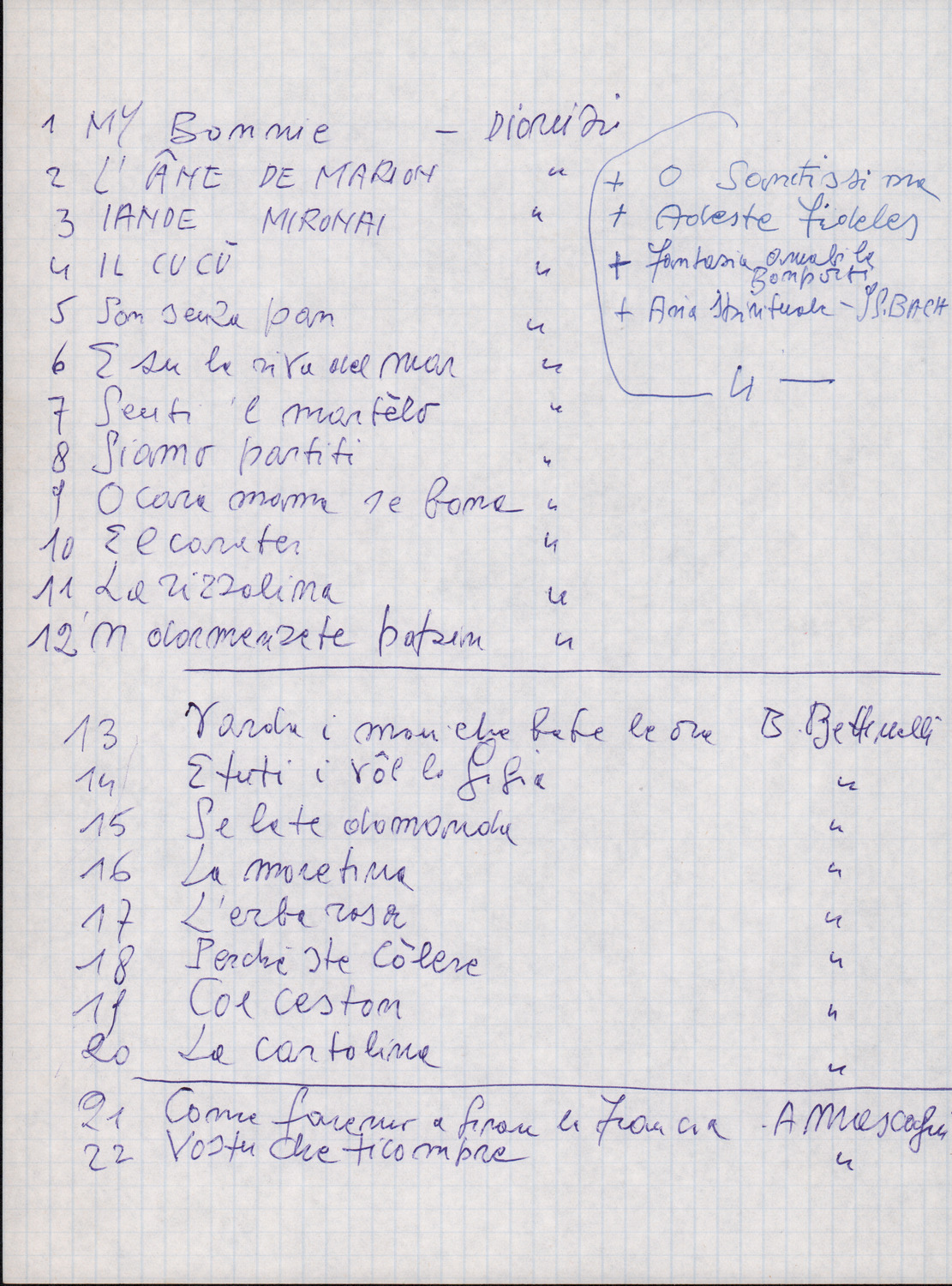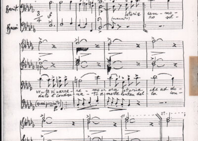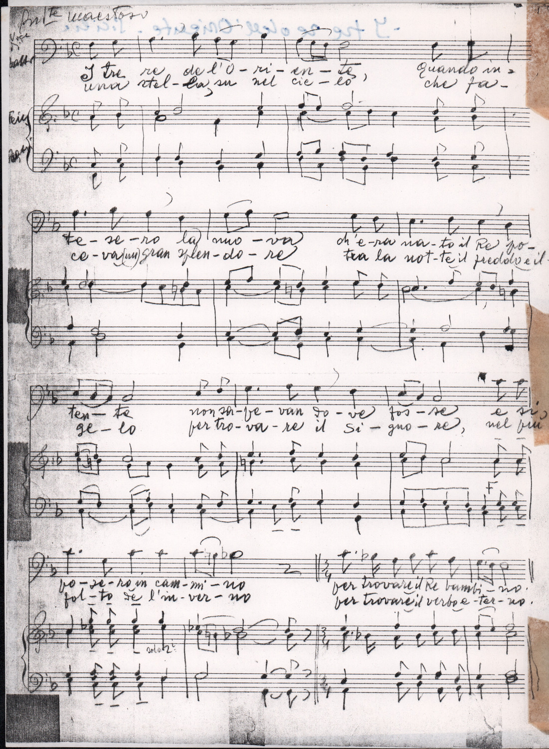 C.4.1.1 - Partiture e testi dei canti I tre Re dell’Oriente, ‘ndormenzete popin, Adeste fideles, Stelutis alpinis, Canto del boschiero, O sanctissima, Cossa gavé voi pare, Dove è la la Gisela, Son senza pan, Senti ‘l martelo, Il cucù, Iande mironai, My Bonnie, El caretér, O cara mama sé bona, Siamo partiti, Varda i mori che bate le ore, Se la te domanda, E tuti i vol la Gigia, L’erba rosa, La moretina, Perché ste còlere, Col ceston, La cartolina, Quando saremo giunti, Vien, vien, bionda d’amor, La banda civica, E l’ò tolta a Matarelo, Bondi y bon an, Come faremo a girare la Francia, Vostu che ti compre, Il povero soldato, Vien moretina, Menelik, Belina come te. Fotocopie degli originali manoscritti dagli armonizzatori, con testi dattiloscritti. 76 cc.