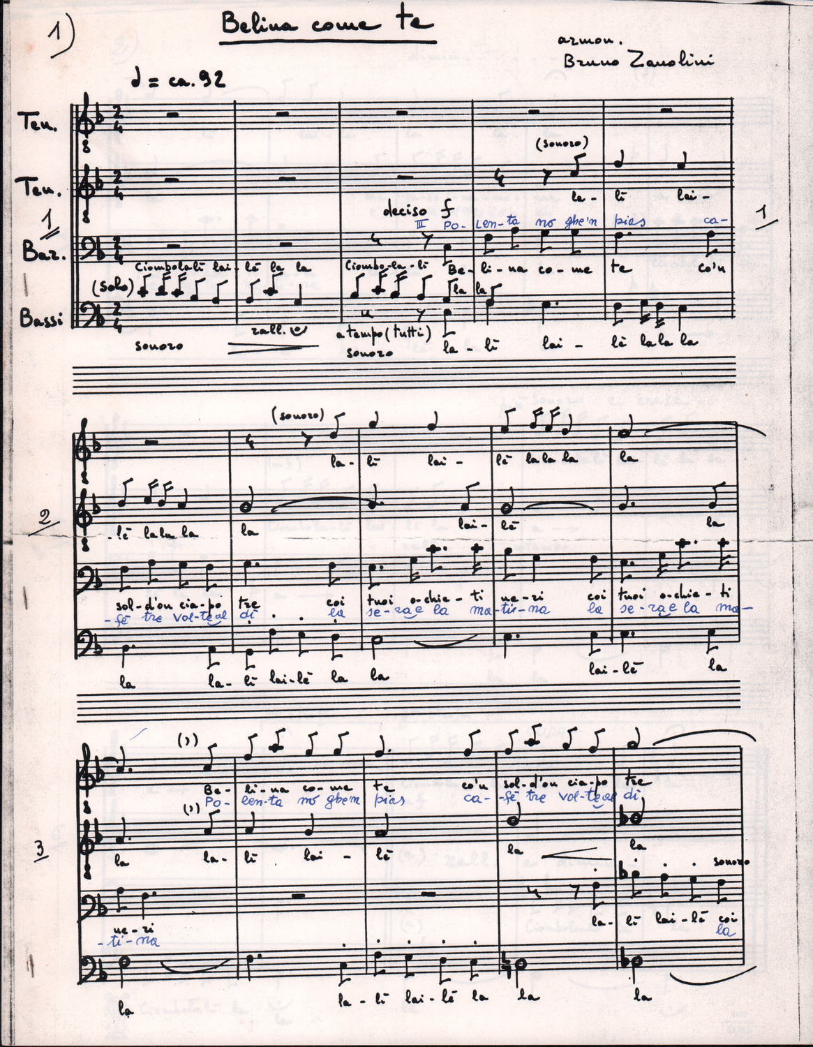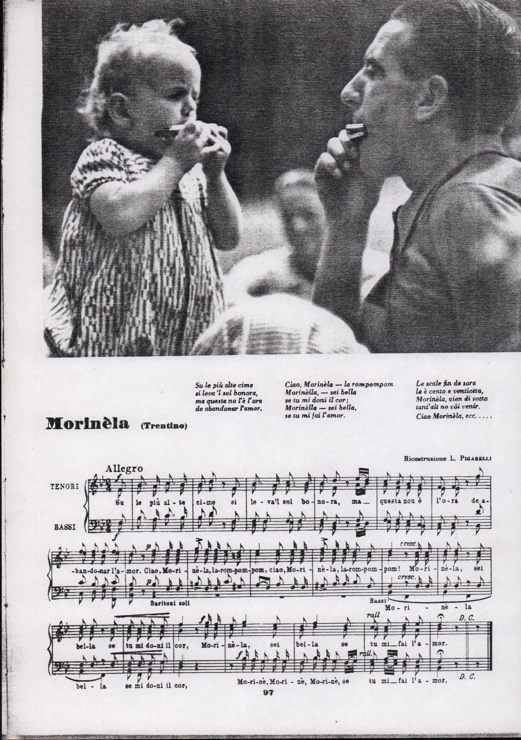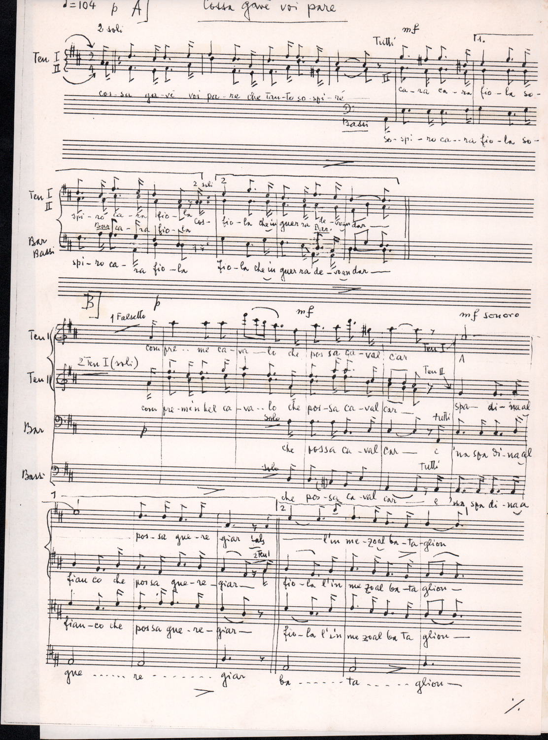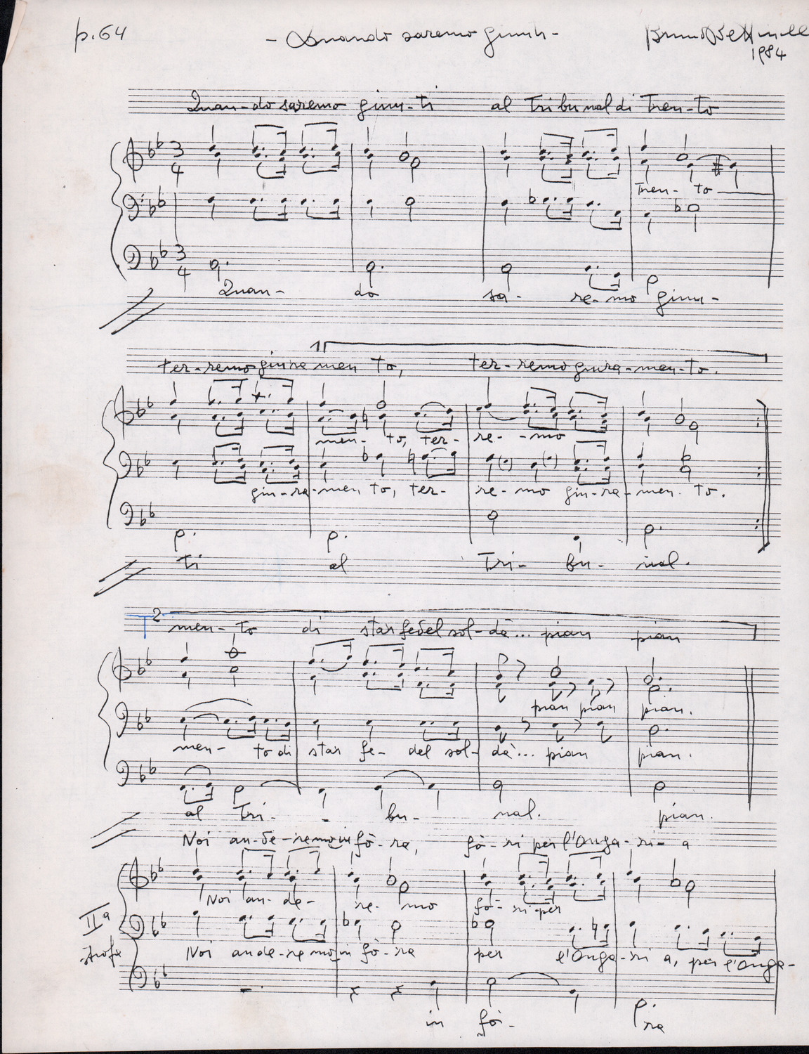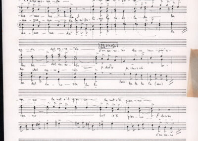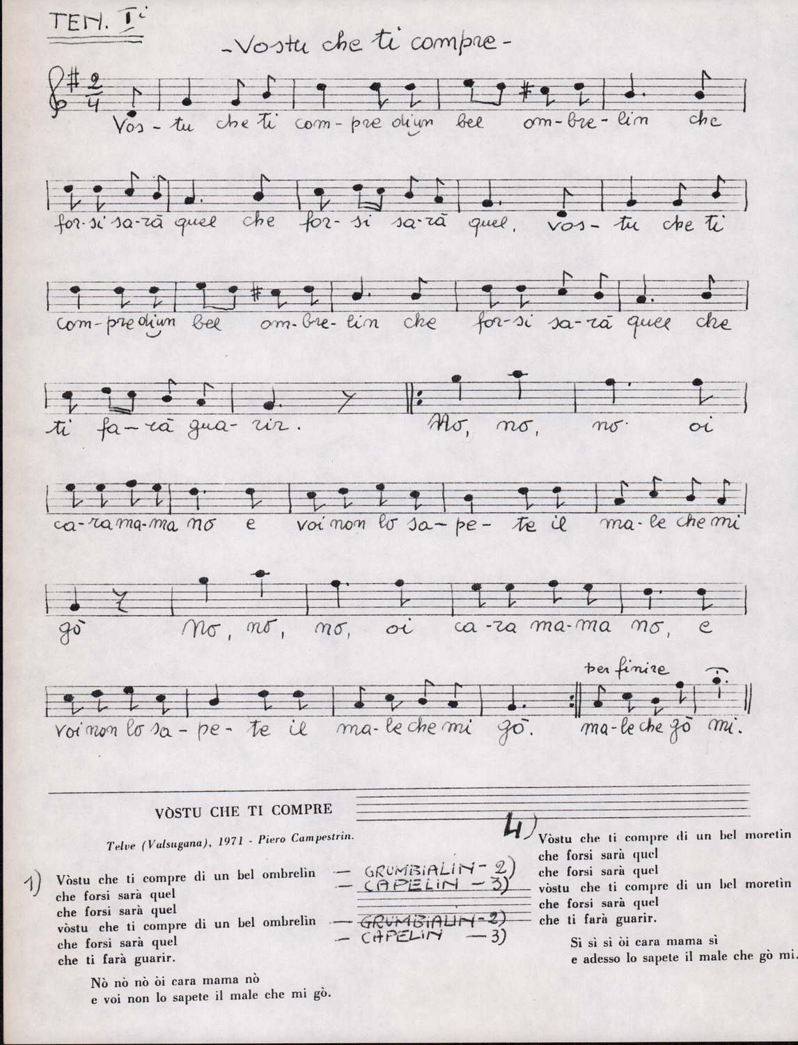 C.4.1.1 - Partiture e testi dei canti I tre Re dell’Oriente, ‘ndormenzete popin, Adeste fideles, Stelutis alpinis, Canto del boschiero, O sanctissima, Cossa gavé voi pare, Dove è la la Gisela, Son senza pan, Senti ‘l martelo, Il cucù, Iande mironai, My Bonnie, El caretér, O cara mama sé bona, Siamo partiti, Varda i mori che bate le ore, Se la te domanda, E tuti i vol la Gigia, L’erba rosa, La moretina, Perché ste còlere, Col ceston, La cartolina, Quando saremo giunti, Vien, vien, bionda d’amor, La banda civica, E l’ò tolta a Matarelo, Bondi y bon an, Come faremo a girare la Francia, Vostu che ti compre, Il povero soldato, Vien moretina, Menelik, Belina come te. Fotocopie degli originali manoscritti dagli armonizzatori, con testi dattiloscritti. 76 cc.