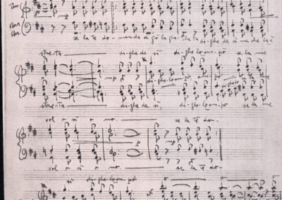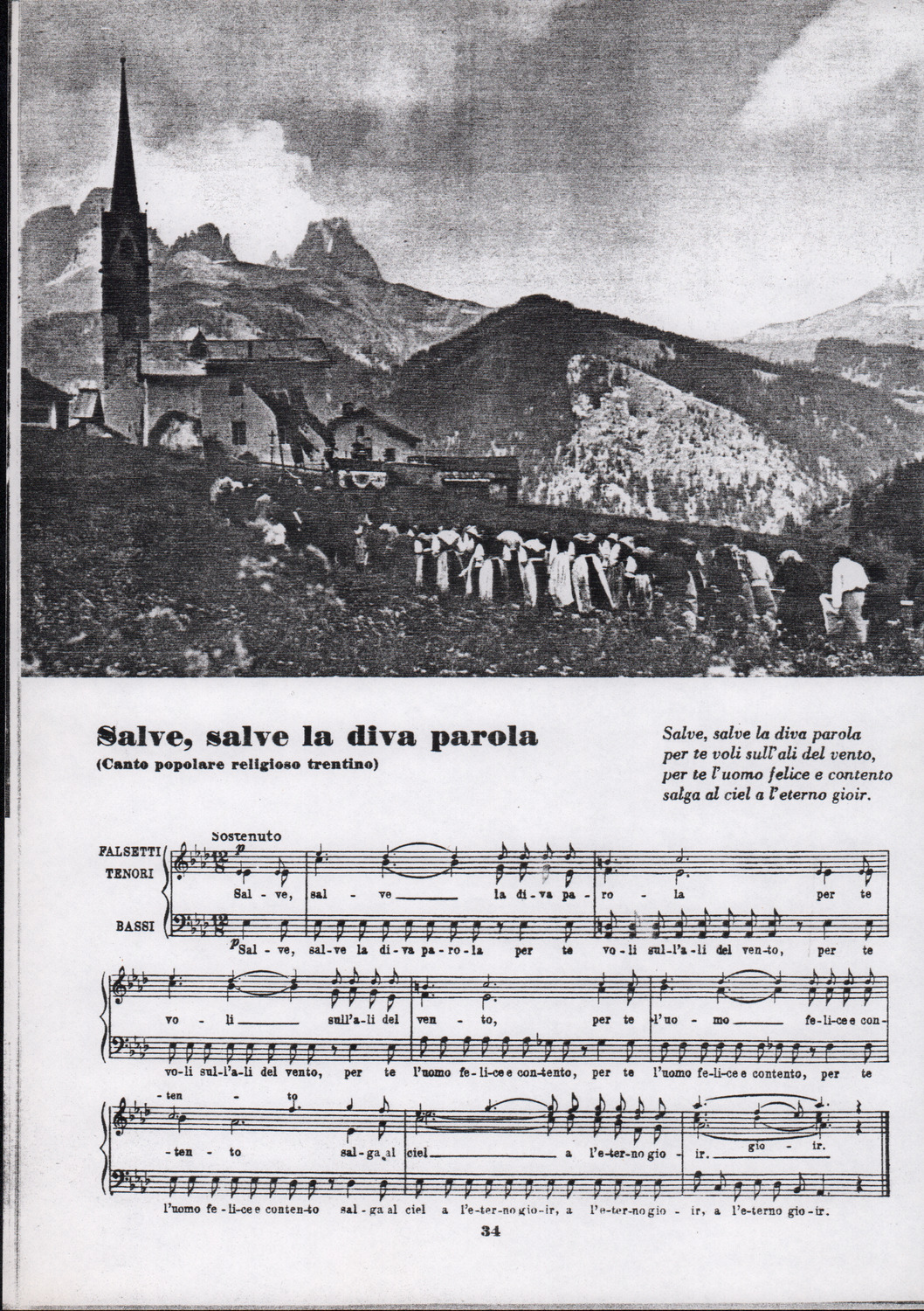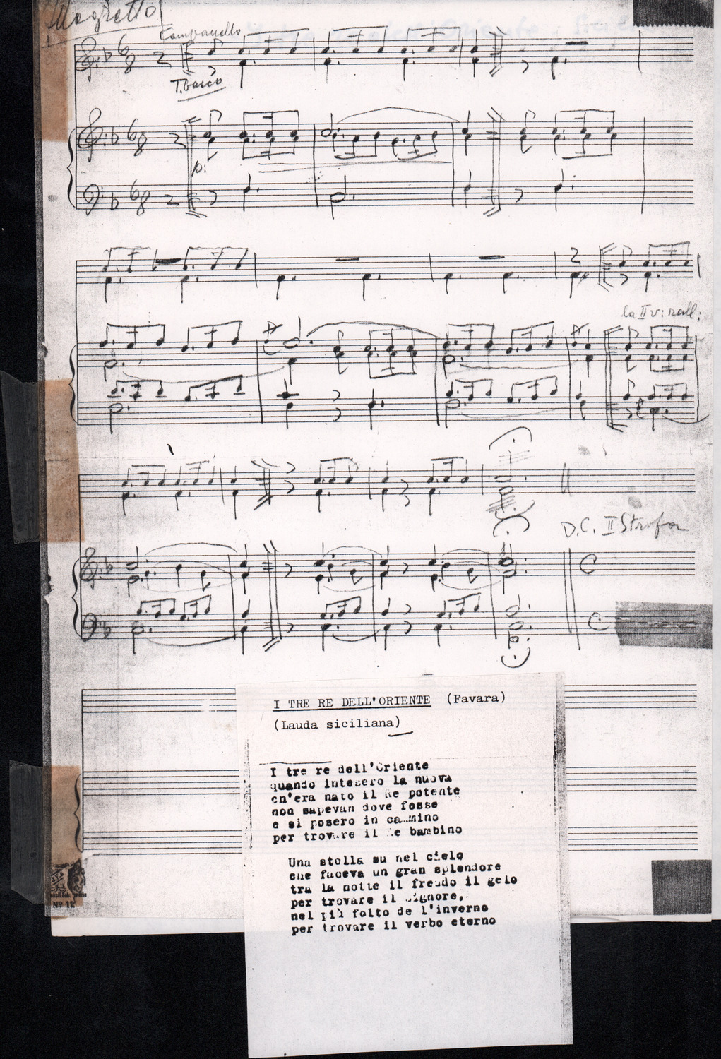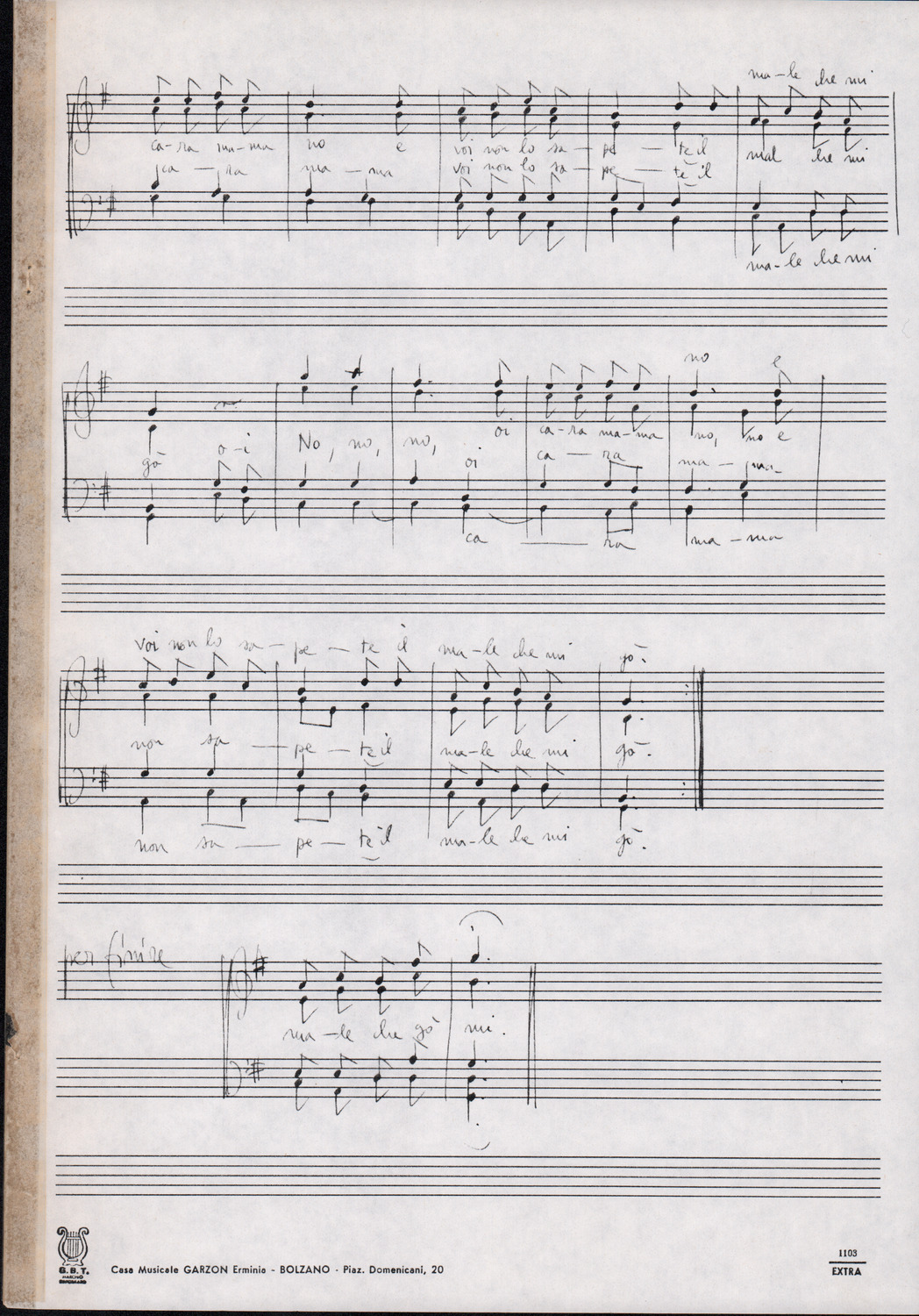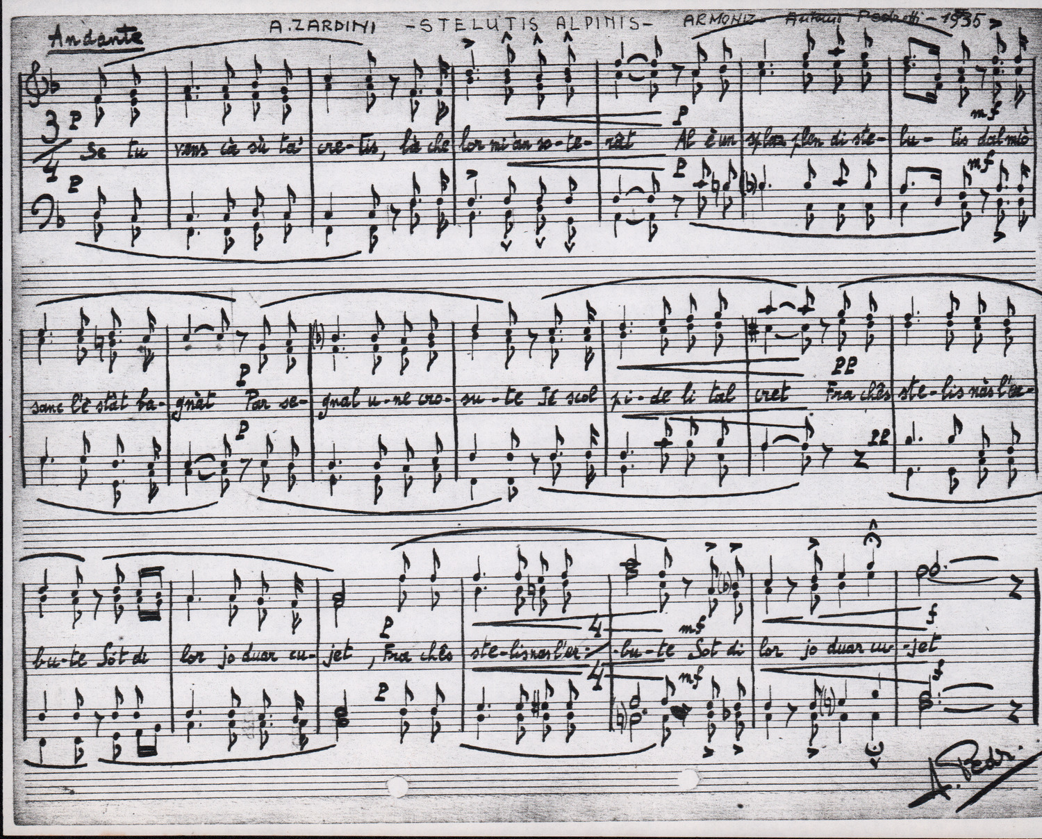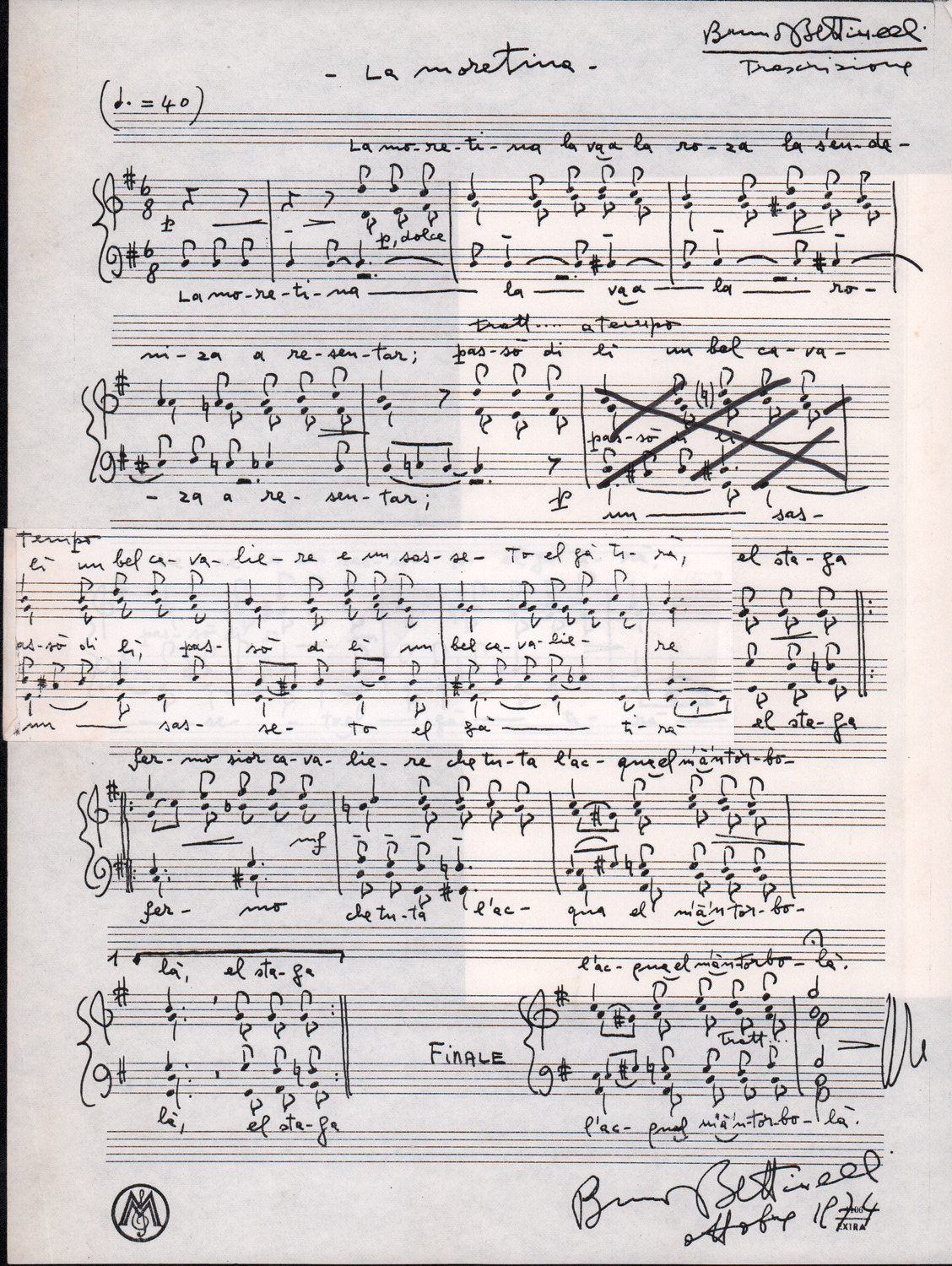 C.4.1.1 - Partiture e testi dei canti I tre Re dell’Oriente, ‘ndormenzete popin, Adeste fideles, Stelutis alpinis, Canto del boschiero, O sanctissima, Cossa gavé voi pare, Dove è la la Gisela, Son senza pan, Senti ‘l martelo, Il cucù, Iande mironai, My Bonnie, El caretér, O cara mama sé bona, Siamo partiti, Varda i mori che bate le ore, Se la te domanda, E tuti i vol la Gigia, L’erba rosa, La moretina, Perché ste còlere, Col ceston, La cartolina, Quando saremo giunti, Vien, vien, bionda d’amor, La banda civica, E l’ò tolta a Matarelo, Bondi y bon an, Come faremo a girare la Francia, Vostu che ti compre, Il povero soldato, Vien moretina, Menelik, Belina come te. Fotocopie degli originali manoscritti dagli armonizzatori, con testi dattiloscritti. 76 cc.