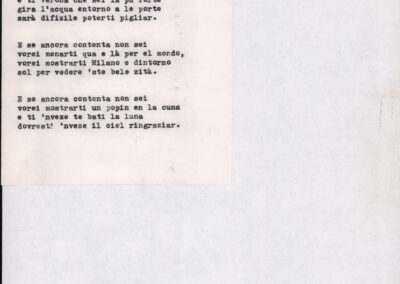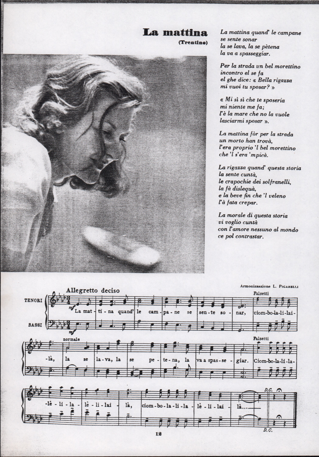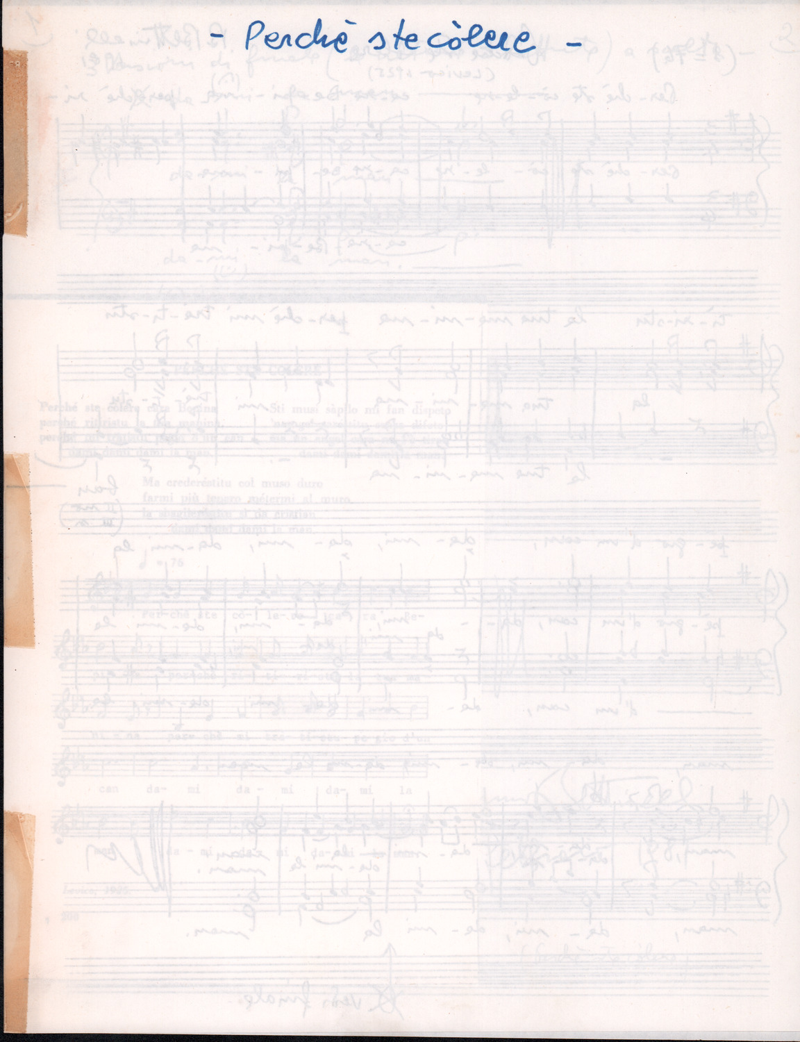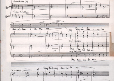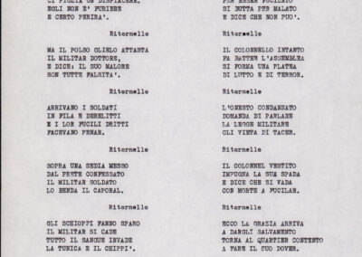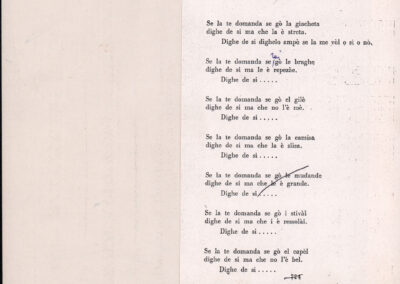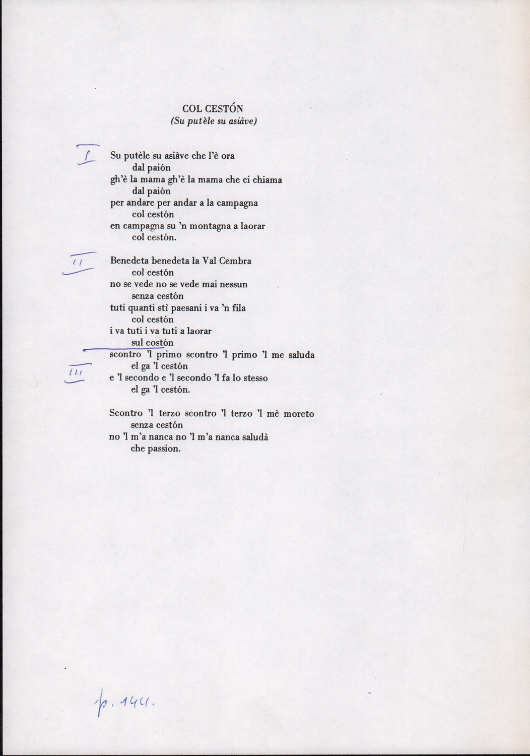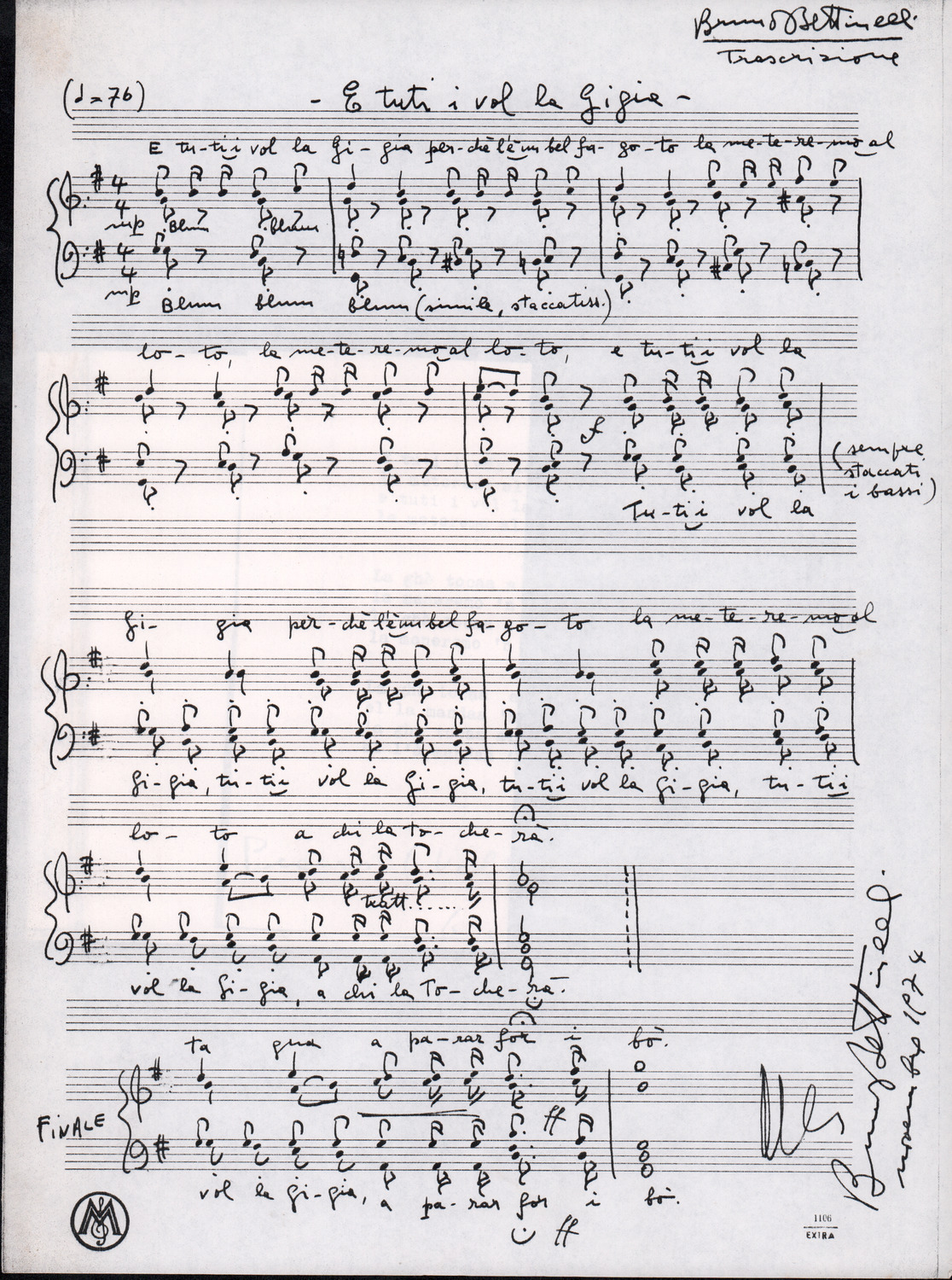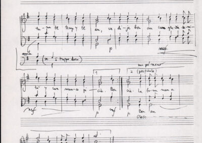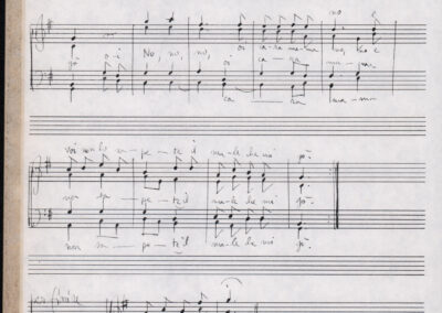C.4.1.1 - Partiture e testi dei canti I tre Re dell’Oriente, ‘ndormenzete popin, Adeste fideles, Stelutis alpinis, Canto del boschiero, O sanctissima, Cossa gavé voi pare, Dove è la la Gisela, Son senza pan, Senti ‘l martelo, Il cucù, Iande mironai, My Bonnie, El caretér, O cara mama sé bona, Siamo partiti, Varda i mori che bate le ore, Se la te domanda, E tuti i vol la Gigia, L’erba rosa, La moretina, Perché ste còlere, Col ceston, La cartolina, Quando saremo giunti, Vien, vien, bionda d’amor, La banda civica, E l’ò tolta a Matarelo, Bondi y bon an, Come faremo a girare la Francia, Vostu che ti compre, Il povero soldato, Vien moretina, Menelik, Belina come te. Fotocopie degli originali manoscritti dagli armonizzatori, con testi dattiloscritti. 76 cc.