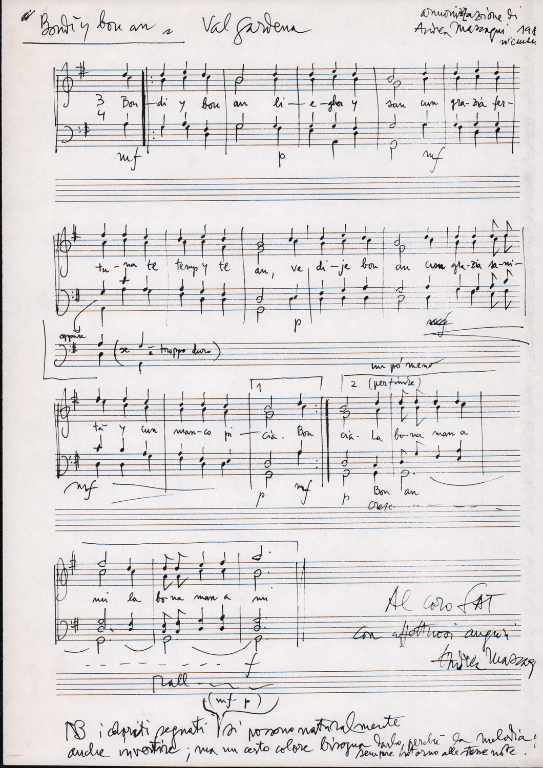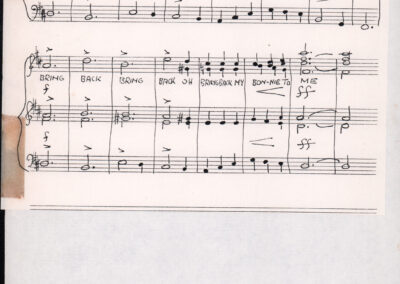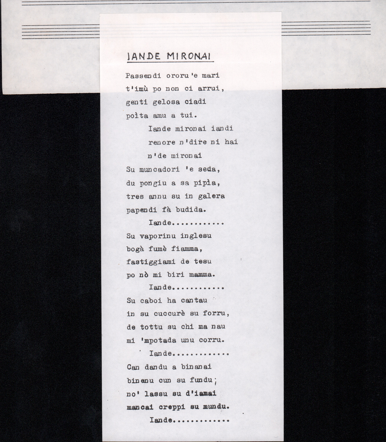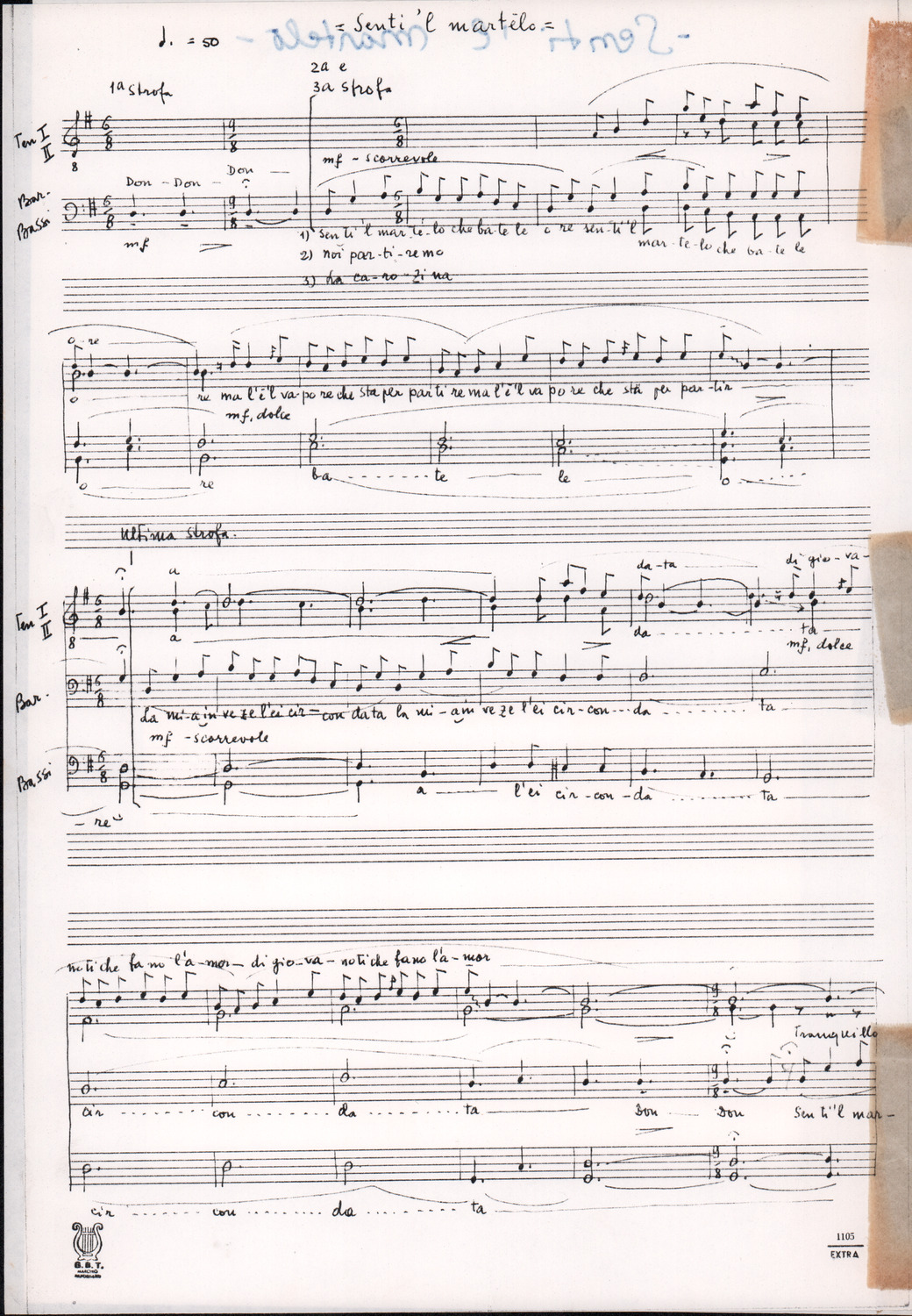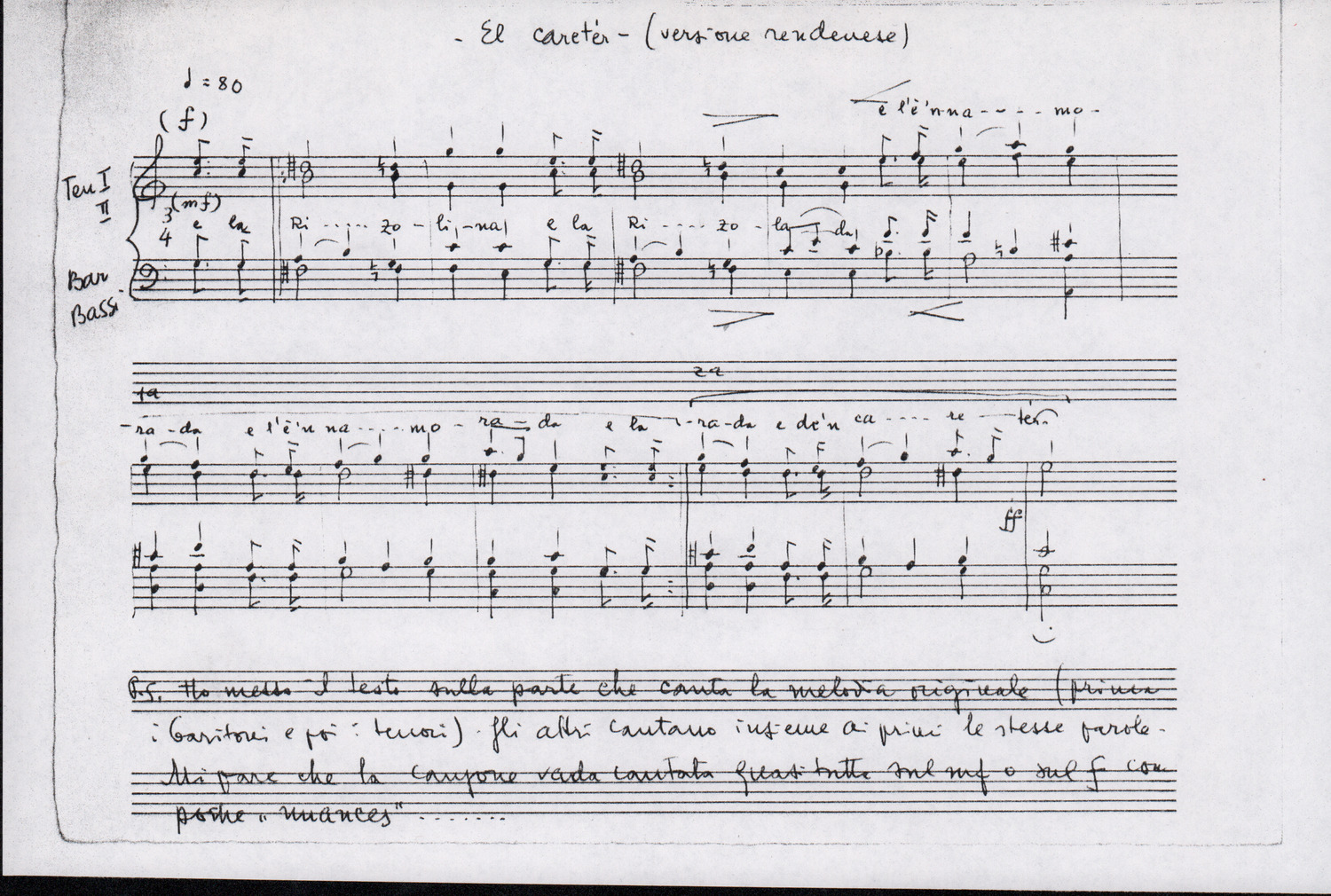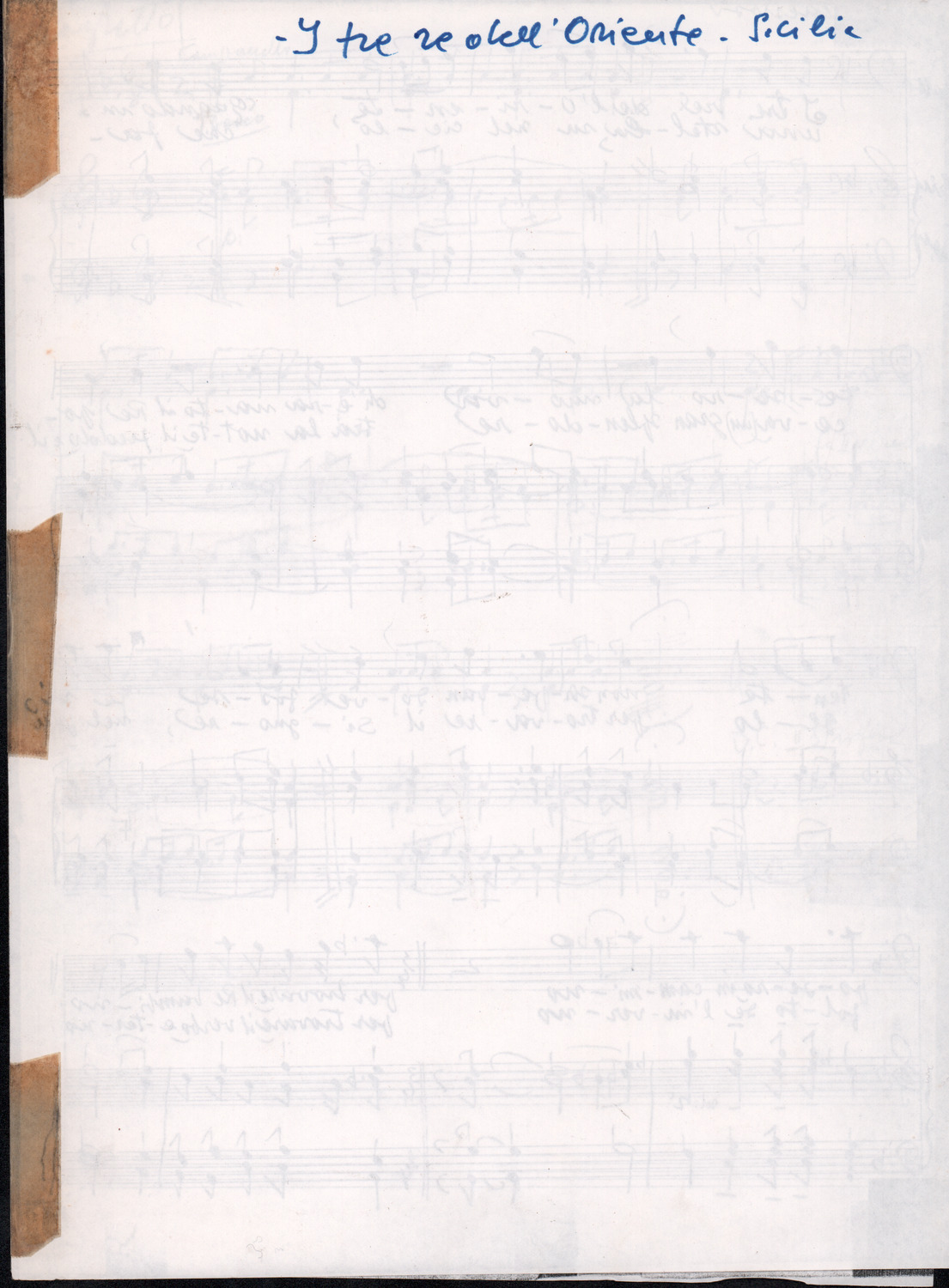 C.4.1.1 - Partiture e testi dei canti I tre Re dell’Oriente, ‘ndormenzete popin, Adeste fideles, Stelutis alpinis, Canto del boschiero, O sanctissima, Cossa gavé voi pare, Dove è la la Gisela, Son senza pan, Senti ‘l martelo, Il cucù, Iande mironai, My Bonnie, El caretér, O cara mama sé bona, Siamo partiti, Varda i mori che bate le ore, Se la te domanda, E tuti i vol la Gigia, L’erba rosa, La moretina, Perché ste còlere, Col ceston, La cartolina, Quando saremo giunti, Vien, vien, bionda d’amor, La banda civica, E l’ò tolta a Matarelo, Bondi y bon an, Come faremo a girare la Francia, Vostu che ti compre, Il povero soldato, Vien moretina, Menelik, Belina come te. Fotocopie degli originali manoscritti dagli armonizzatori, con testi dattiloscritti. 76 cc.