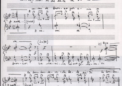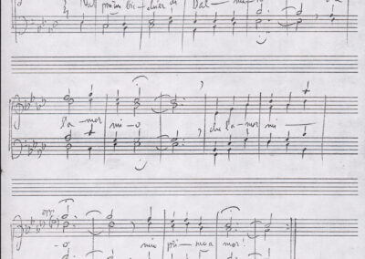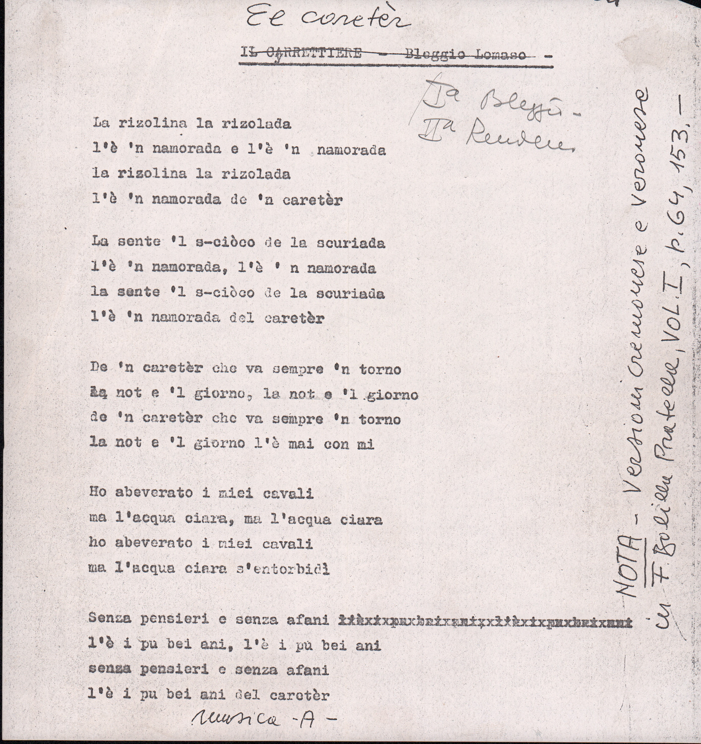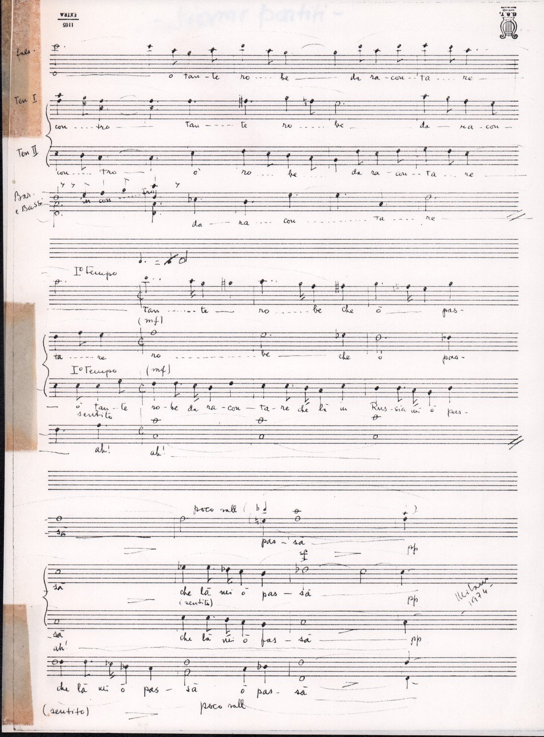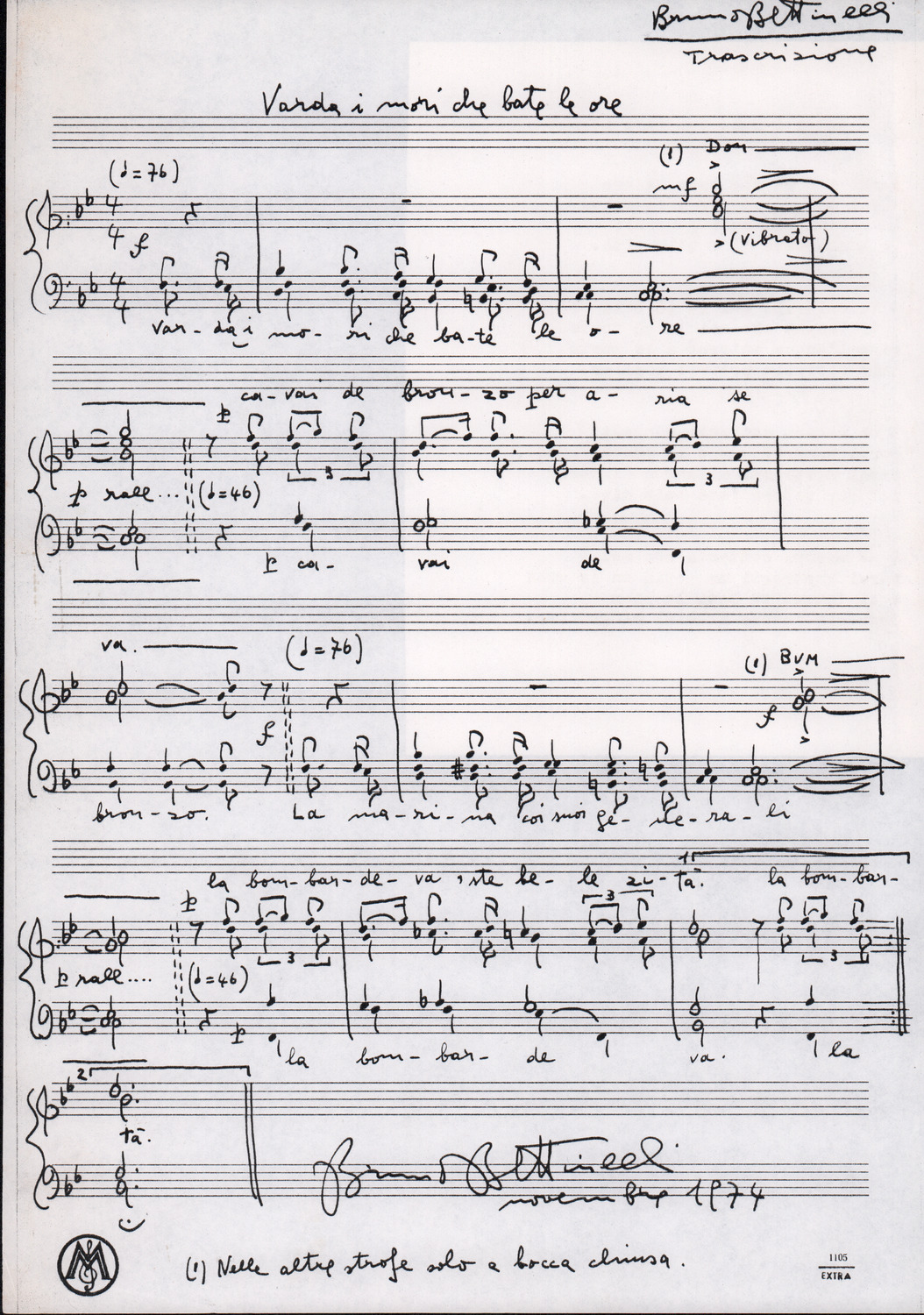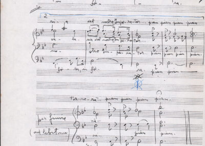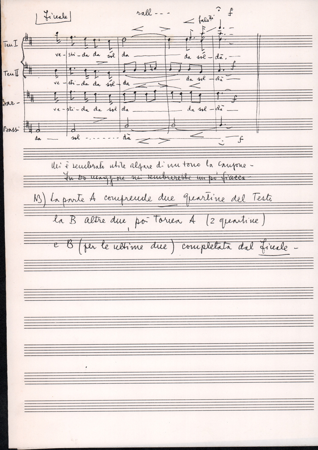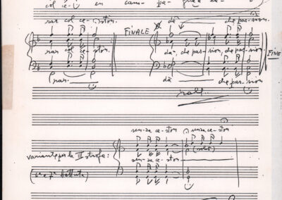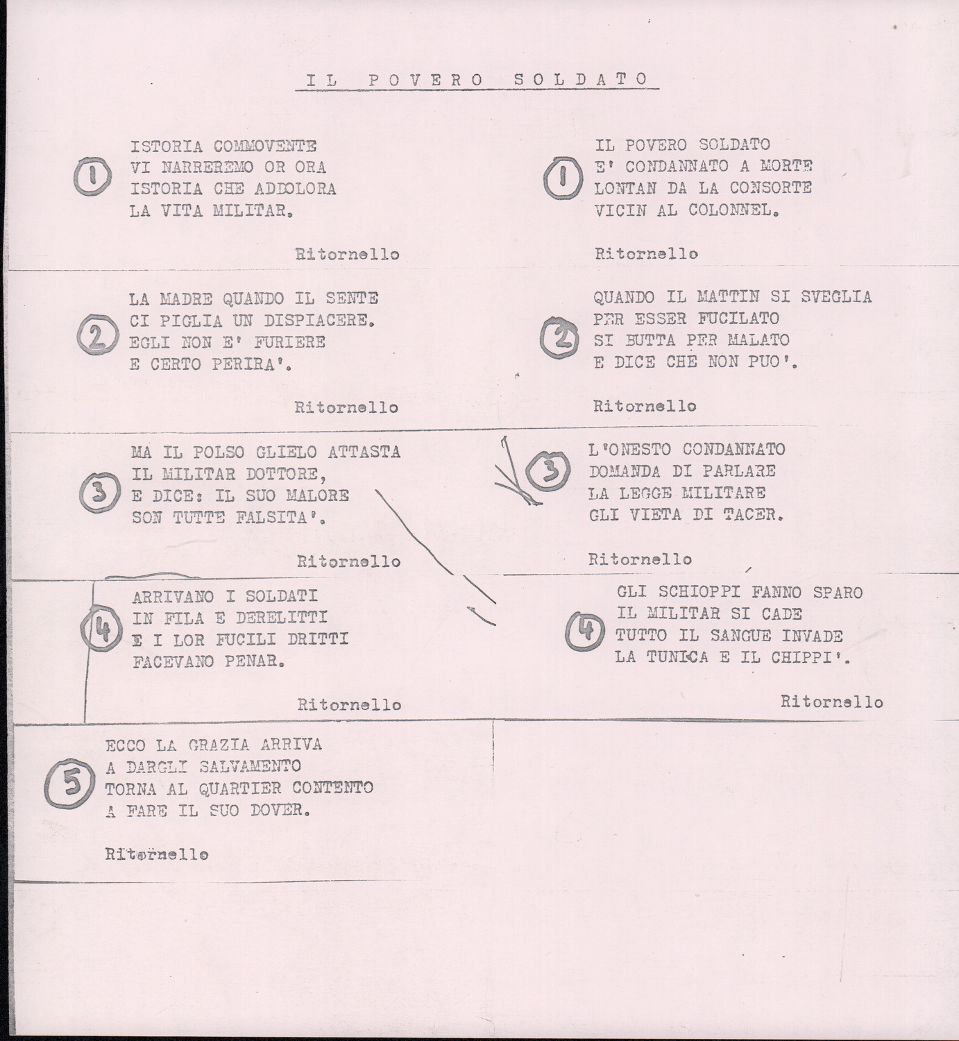 C.4.1.1 - Partiture e testi dei canti I tre Re dell’Oriente, ‘ndormenzete popin, Adeste fideles, Stelutis alpinis, Canto del boschiero, O sanctissima, Cossa gavé voi pare, Dove è la la Gisela, Son senza pan, Senti ‘l martelo, Il cucù, Iande mironai, My Bonnie, El caretér, O cara mama sé bona, Siamo partiti, Varda i mori che bate le ore, Se la te domanda, E tuti i vol la Gigia, L’erba rosa, La moretina, Perché ste còlere, Col ceston, La cartolina, Quando saremo giunti, Vien, vien, bionda d’amor, La banda civica, E l’ò tolta a Matarelo, Bondi y bon an, Come faremo a girare la Francia, Vostu che ti compre, Il povero soldato, Vien moretina, Menelik, Belina come te. Fotocopie degli originali manoscritti dagli armonizzatori, con testi dattiloscritti. 76 cc.