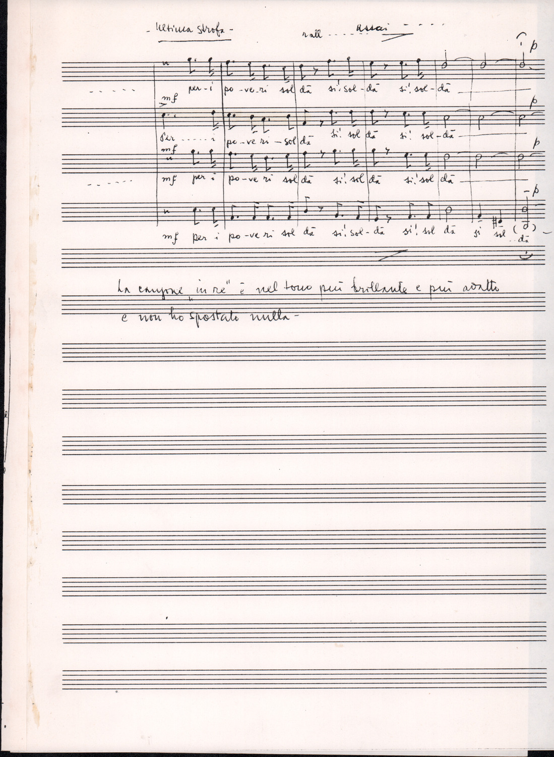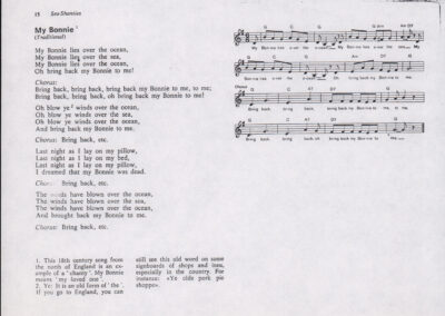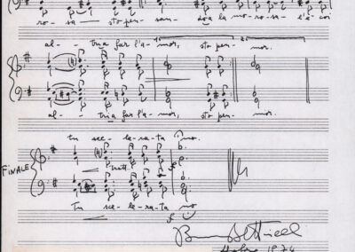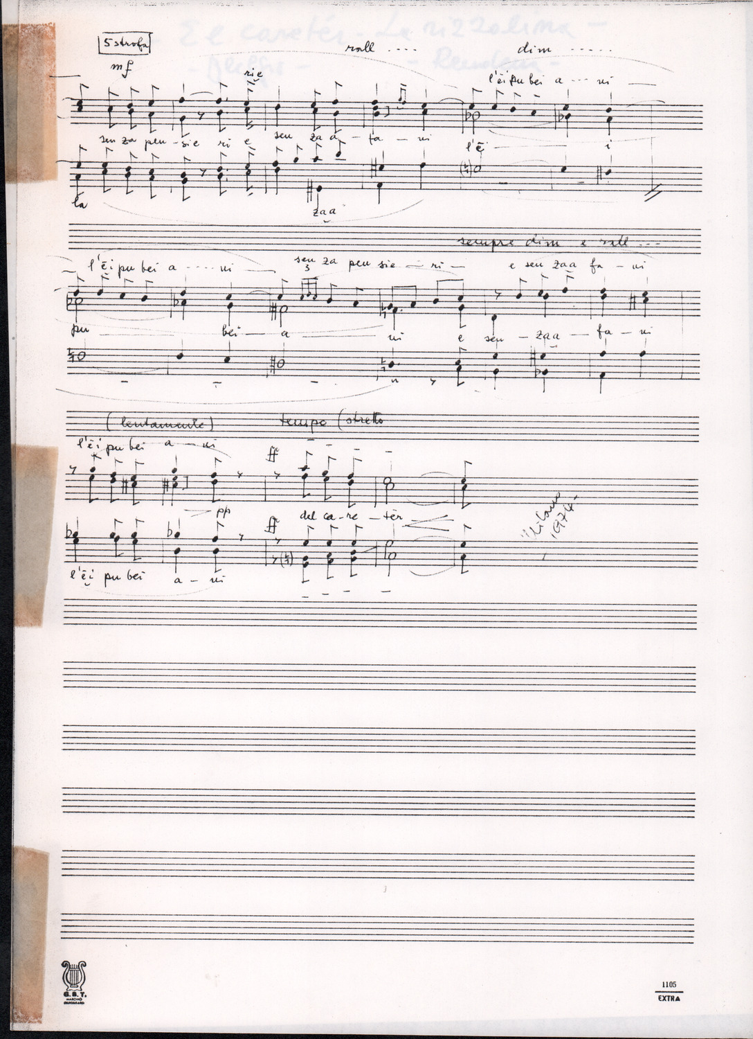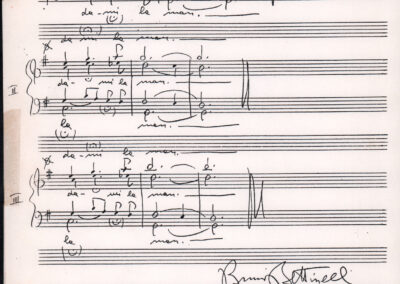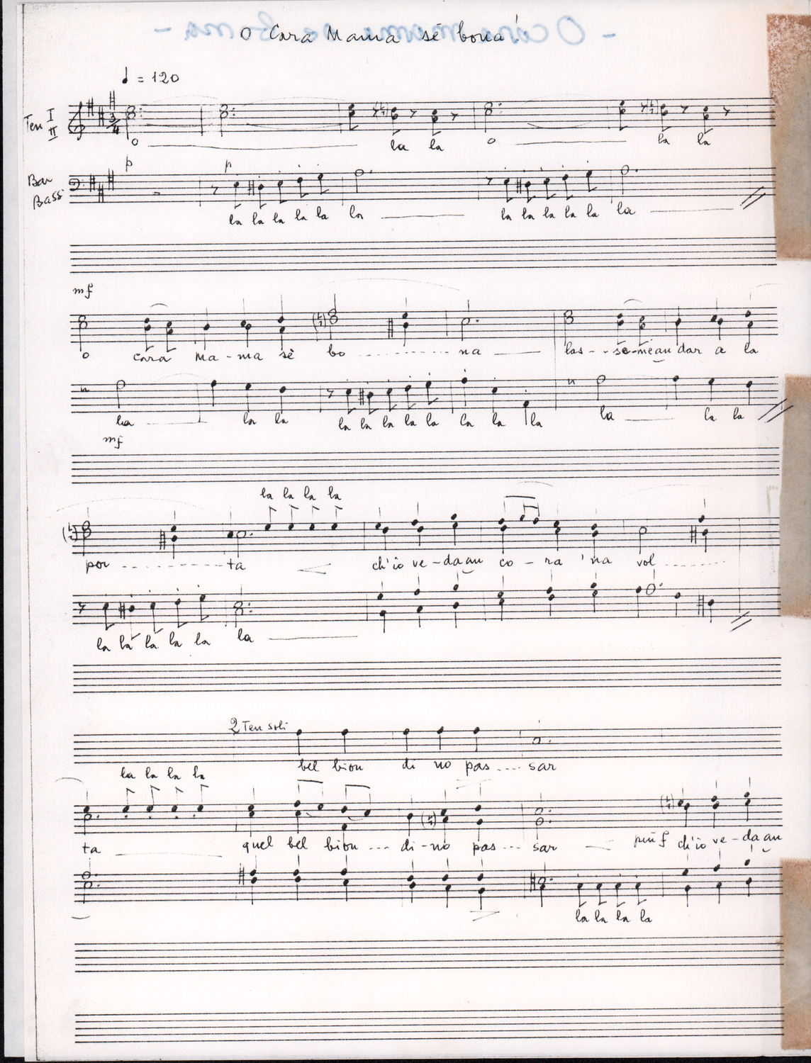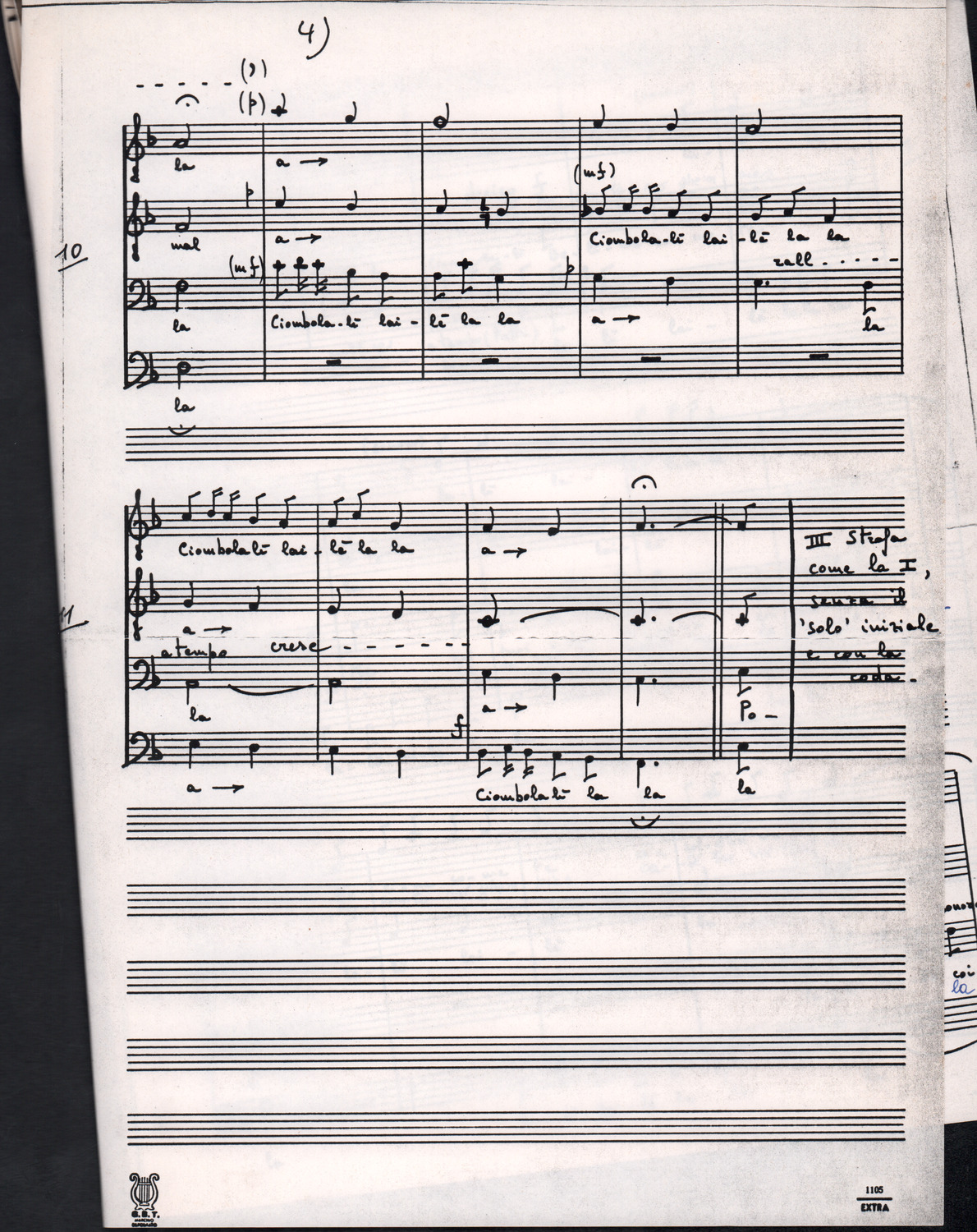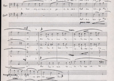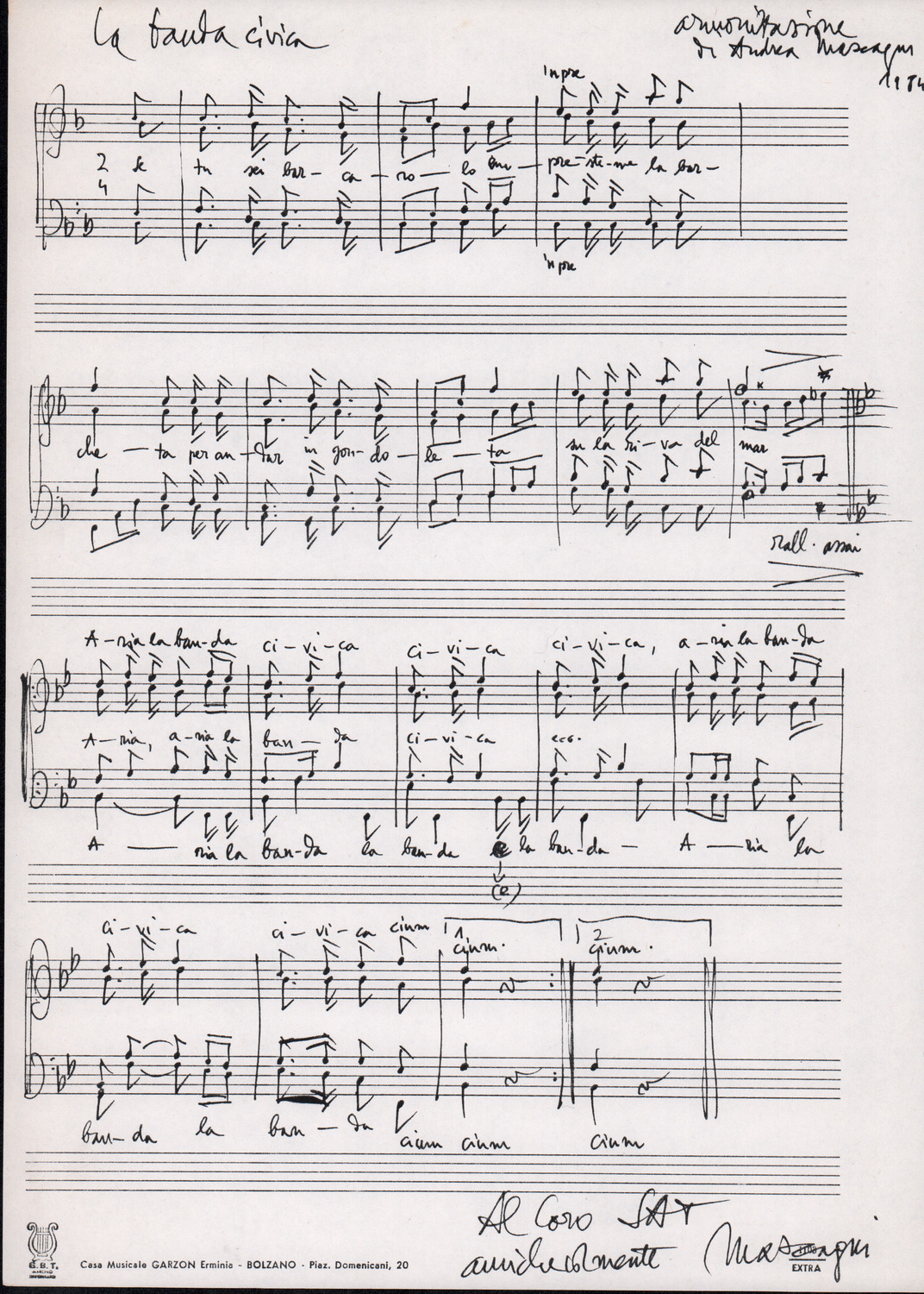 C.4.1.1 - Partiture e testi dei canti I tre Re dell’Oriente, ‘ndormenzete popin, Adeste fideles, Stelutis alpinis, Canto del boschiero, O sanctissima, Cossa gavé voi pare, Dove è la la Gisela, Son senza pan, Senti ‘l martelo, Il cucù, Iande mironai, My Bonnie, El caretér, O cara mama sé bona, Siamo partiti, Varda i mori che bate le ore, Se la te domanda, E tuti i vol la Gigia, L’erba rosa, La moretina, Perché ste còlere, Col ceston, La cartolina, Quando saremo giunti, Vien, vien, bionda d’amor, La banda civica, E l’ò tolta a Matarelo, Bondi y bon an, Come faremo a girare la Francia, Vostu che ti compre, Il povero soldato, Vien moretina, Menelik, Belina come te. Fotocopie degli originali manoscritti dagli armonizzatori, con testi dattiloscritti. 76 cc.