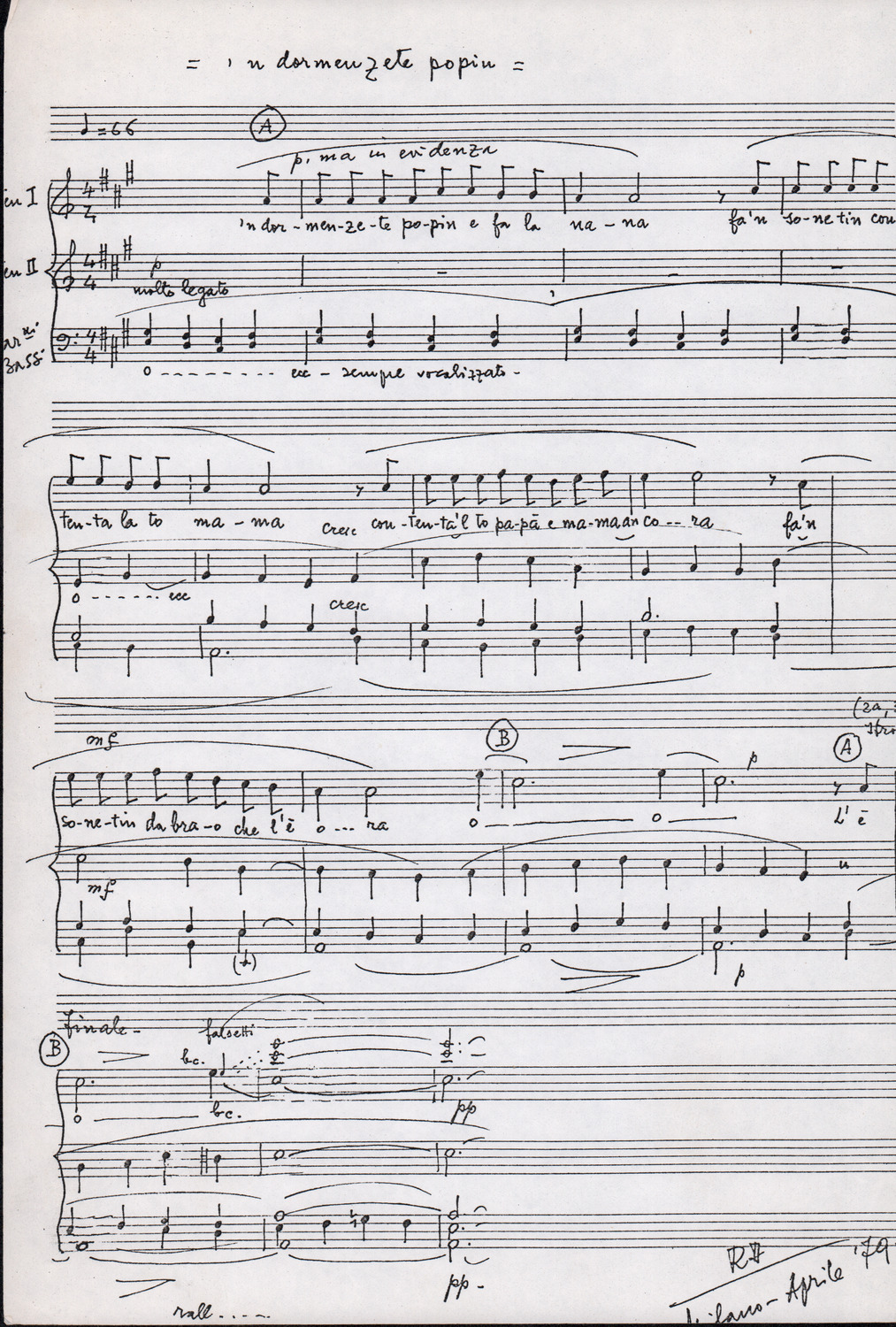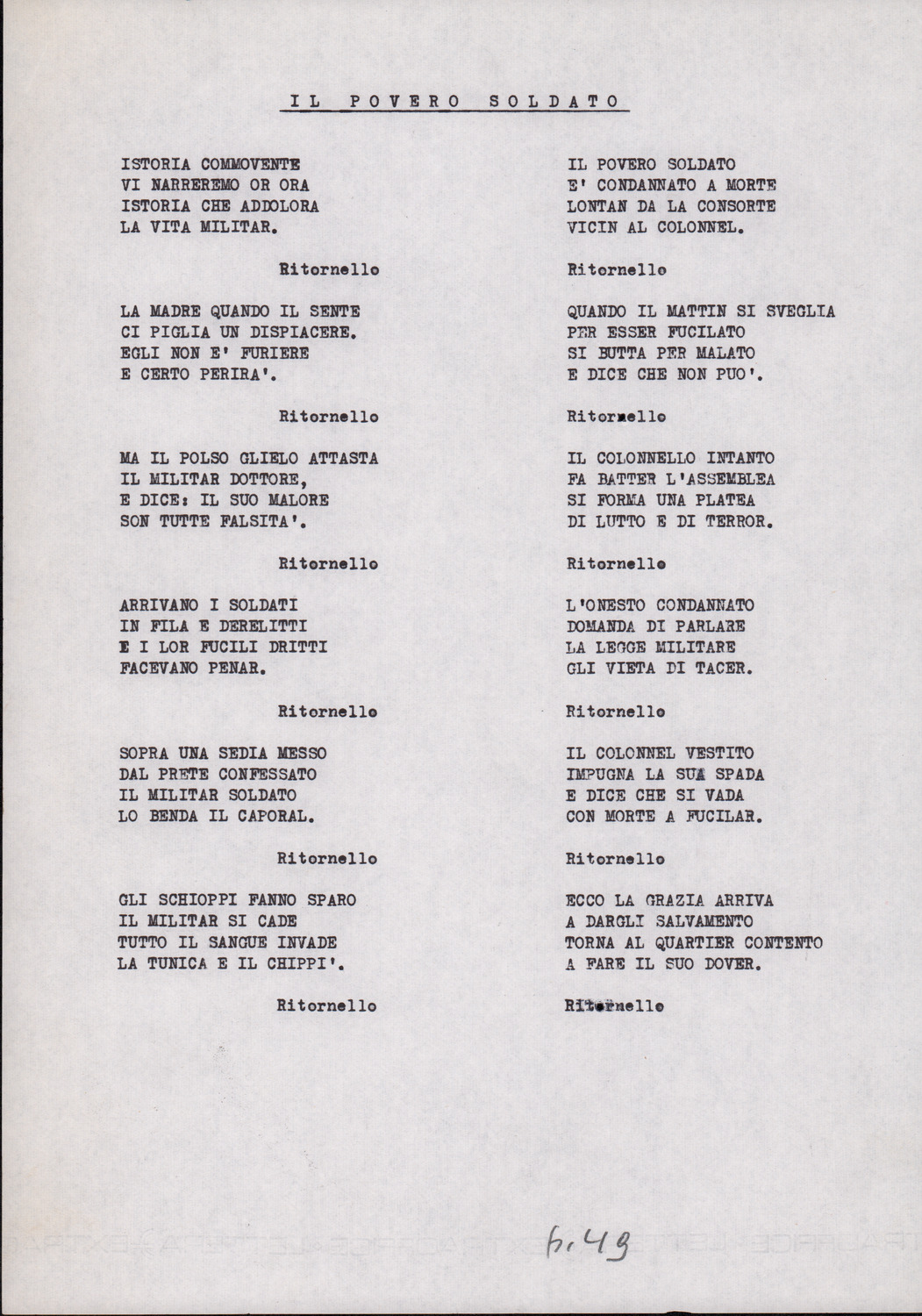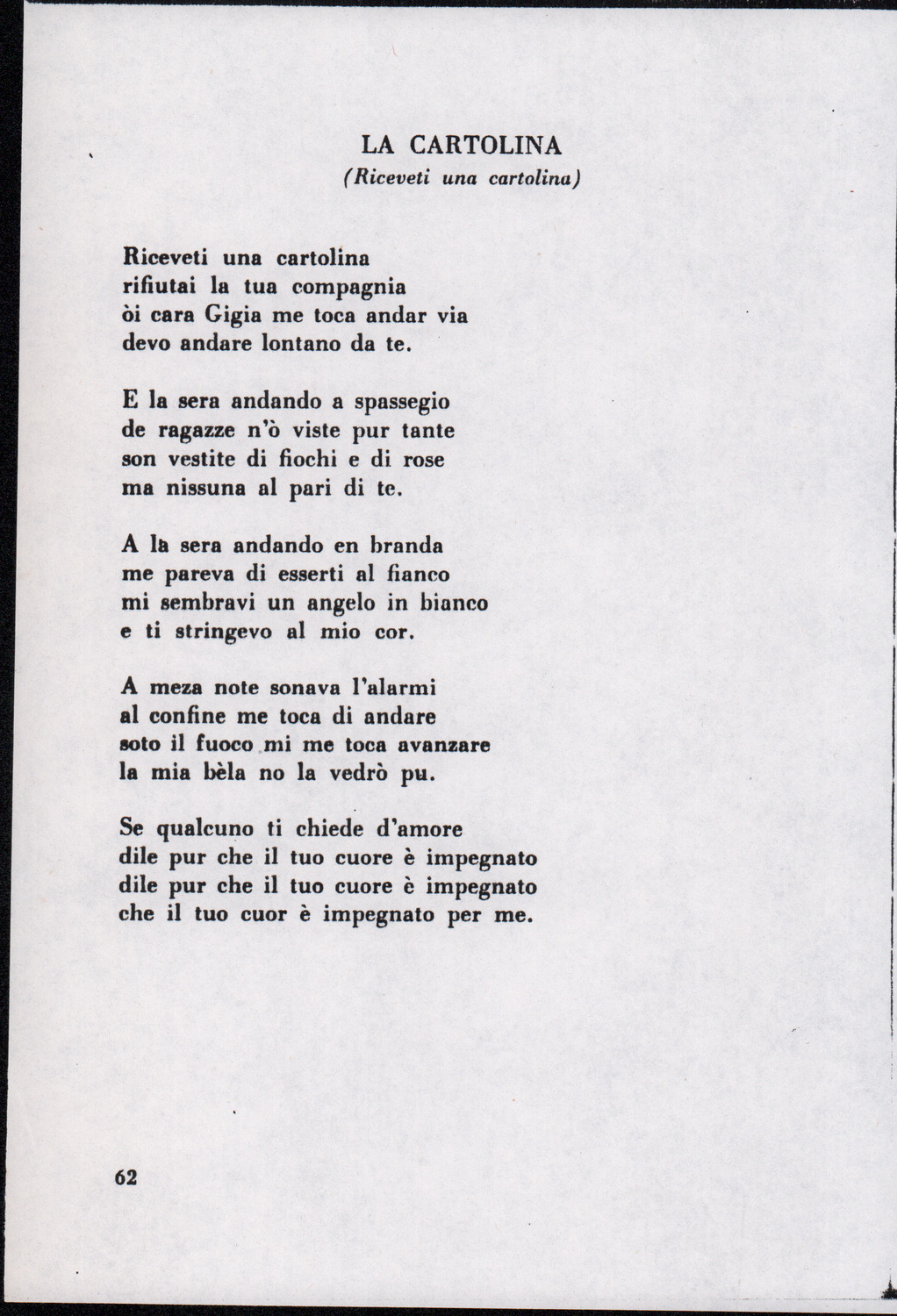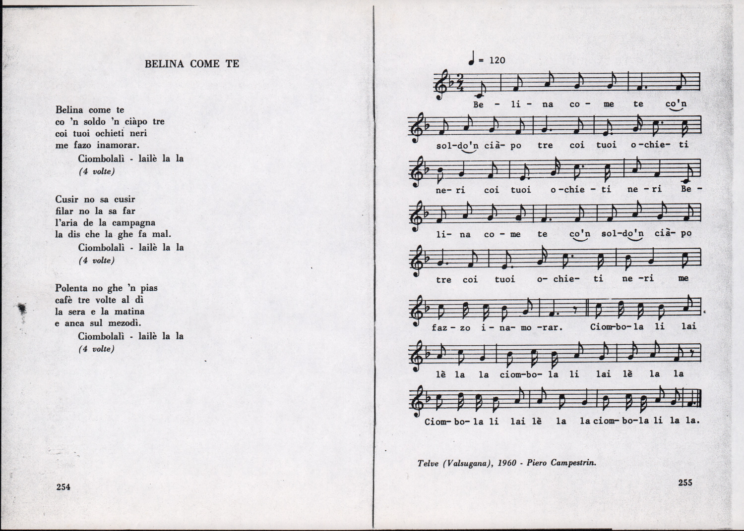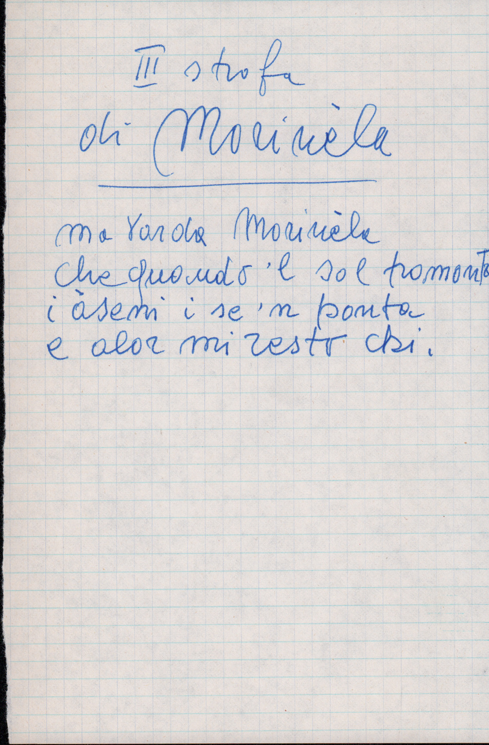 C.4.1.1 - Partiture e testi dei canti I tre Re dell’Oriente, ‘ndormenzete popin, Adeste fideles, Stelutis alpinis, Canto del boschiero, O sanctissima, Cossa gavé voi pare, Dove è la la Gisela, Son senza pan, Senti ‘l martelo, Il cucù, Iande mironai, My Bonnie, El caretér, O cara mama sé bona, Siamo partiti, Varda i mori che bate le ore, Se la te domanda, E tuti i vol la Gigia, L’erba rosa, La moretina, Perché ste còlere, Col ceston, La cartolina, Quando saremo giunti, Vien, vien, bionda d’amor, La banda civica, E l’ò tolta a Matarelo, Bondi y bon an, Come faremo a girare la Francia, Vostu che ti compre, Il povero soldato, Vien moretina, Menelik, Belina come te. Fotocopie degli originali manoscritti dagli armonizzatori, con testi dattiloscritti. 76 cc.