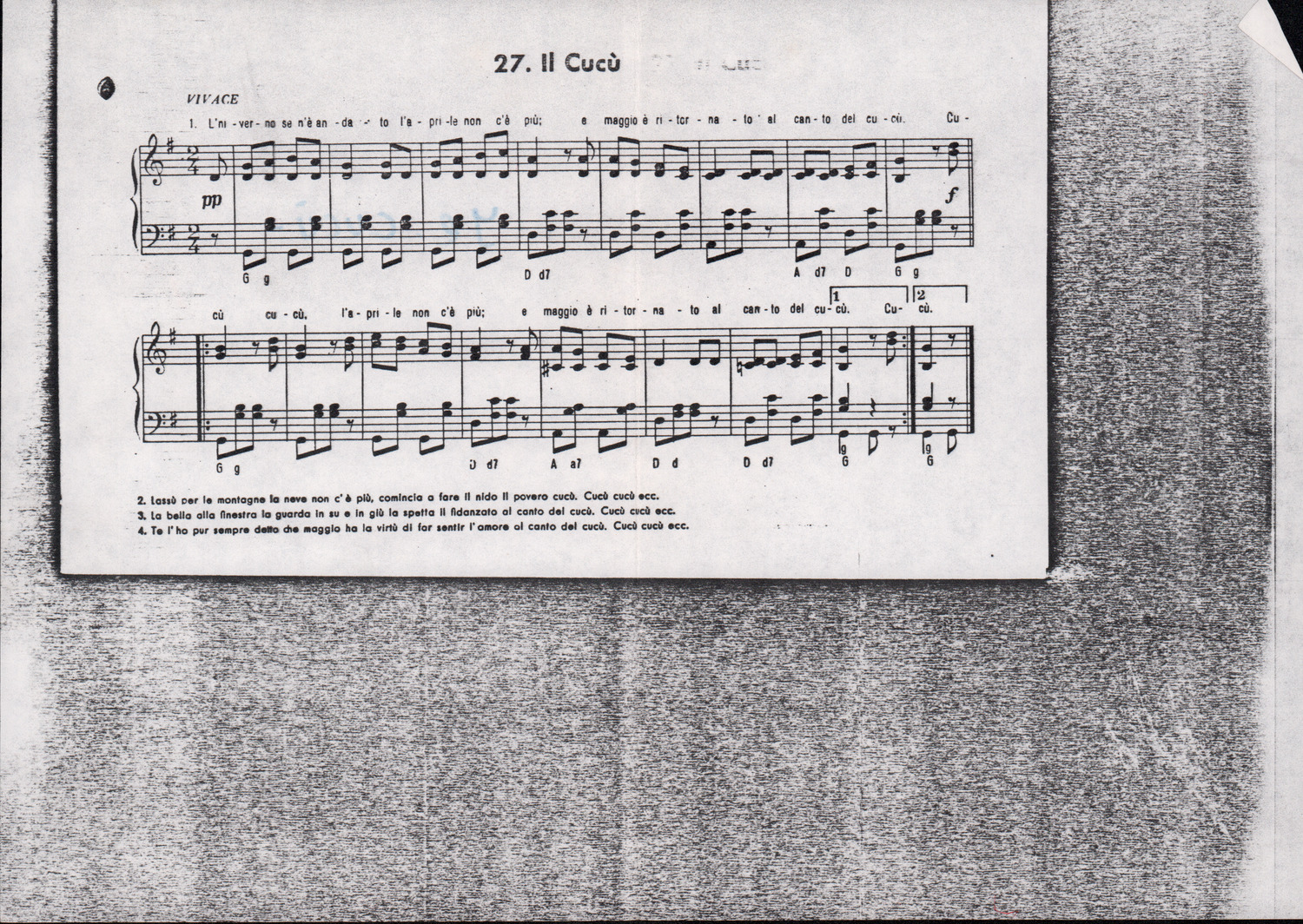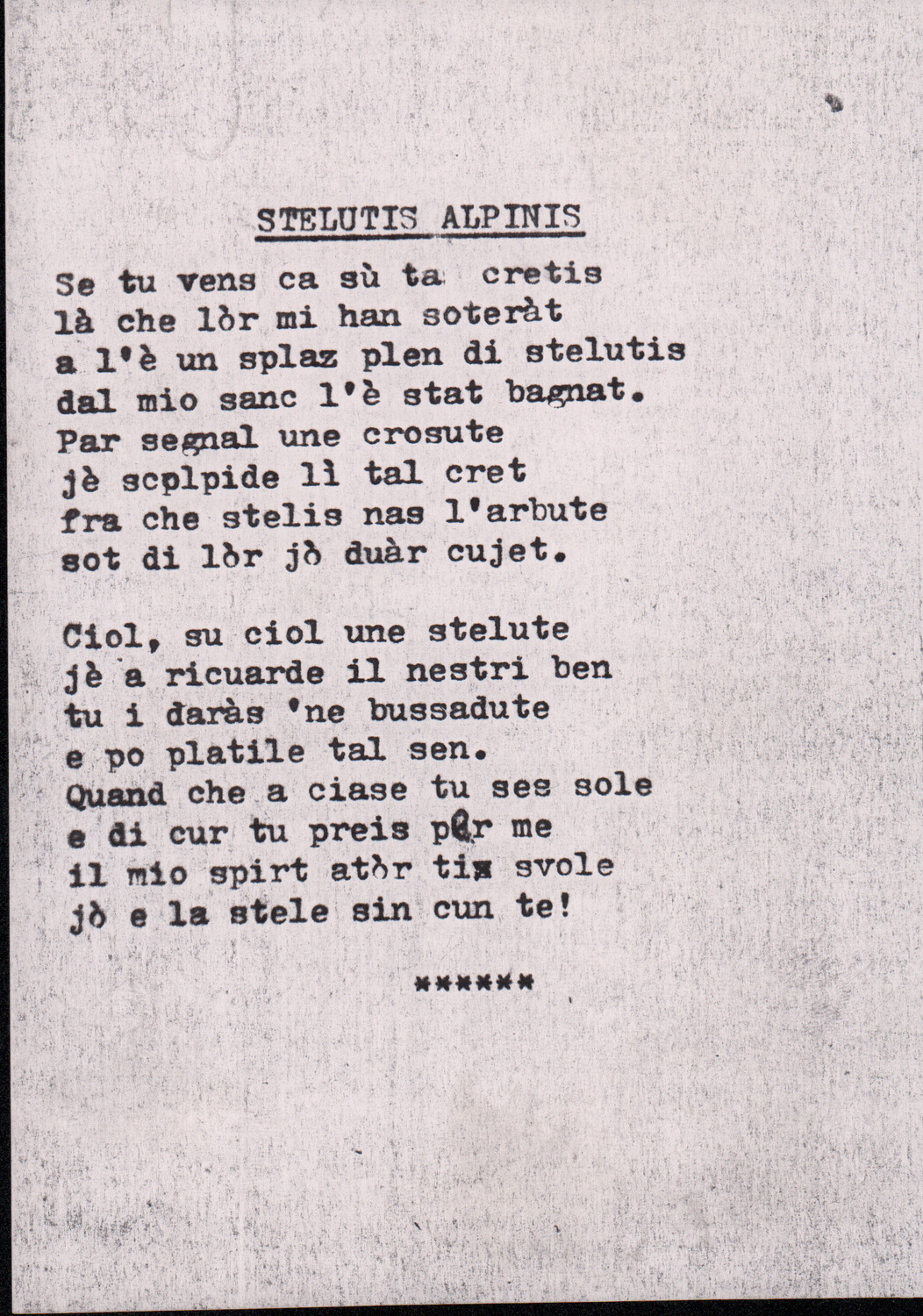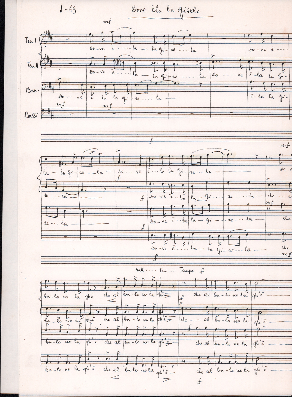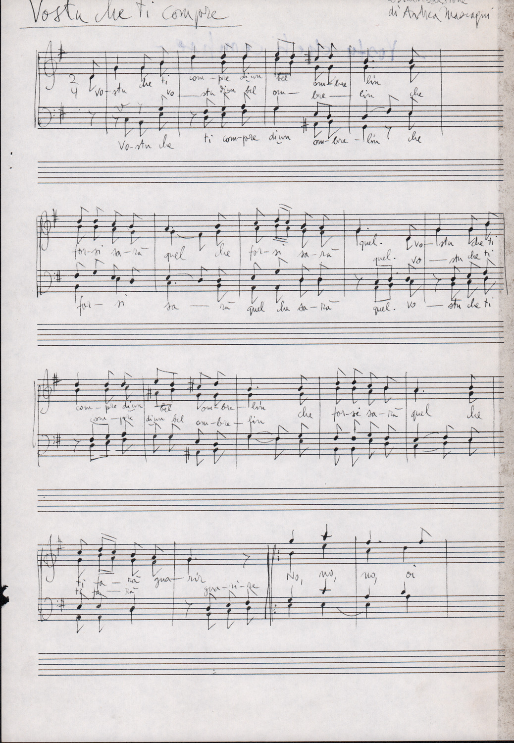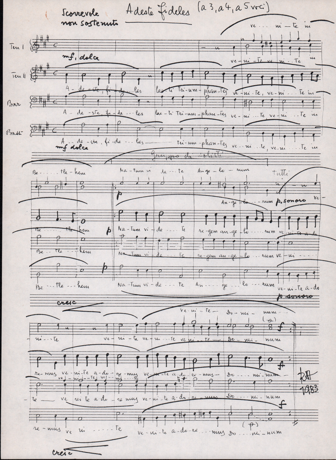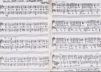 C.4.1.1 - Partiture e testi dei canti I tre Re dell’Oriente, ‘ndormenzete popin, Adeste fideles, Stelutis alpinis, Canto del boschiero, O sanctissima, Cossa gavé voi pare, Dove è la la Gisela, Son senza pan, Senti ‘l martelo, Il cucù, Iande mironai, My Bonnie, El caretér, O cara mama sé bona, Siamo partiti, Varda i mori che bate le ore, Se la te domanda, E tuti i vol la Gigia, L’erba rosa, La moretina, Perché ste còlere, Col ceston, La cartolina, Quando saremo giunti, Vien, vien, bionda d’amor, La banda civica, E l’ò tolta a Matarelo, Bondi y bon an, Come faremo a girare la Francia, Vostu che ti compre, Il povero soldato, Vien moretina, Menelik, Belina come te. Fotocopie degli originali manoscritti dagli armonizzatori, con testi dattiloscritti. 76 cc.