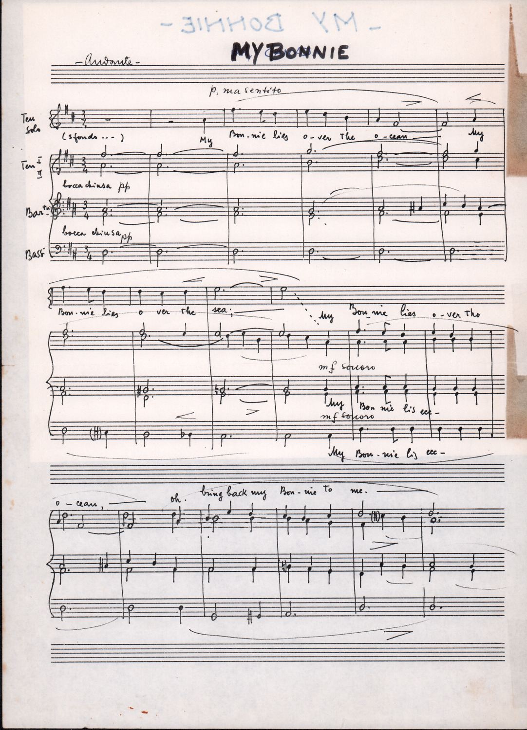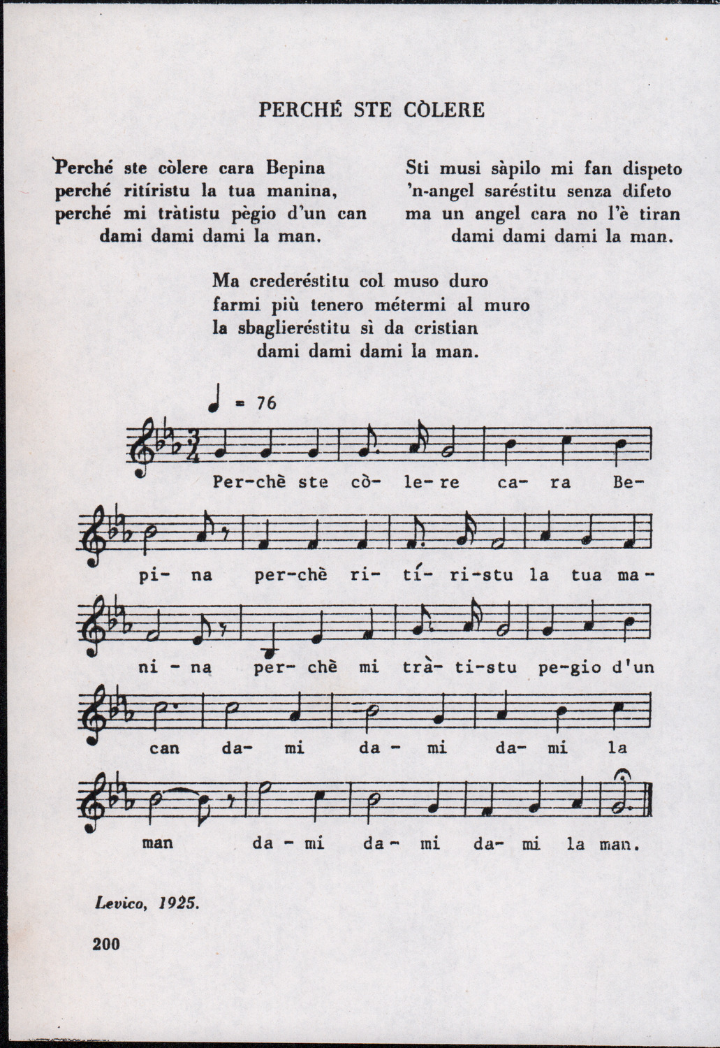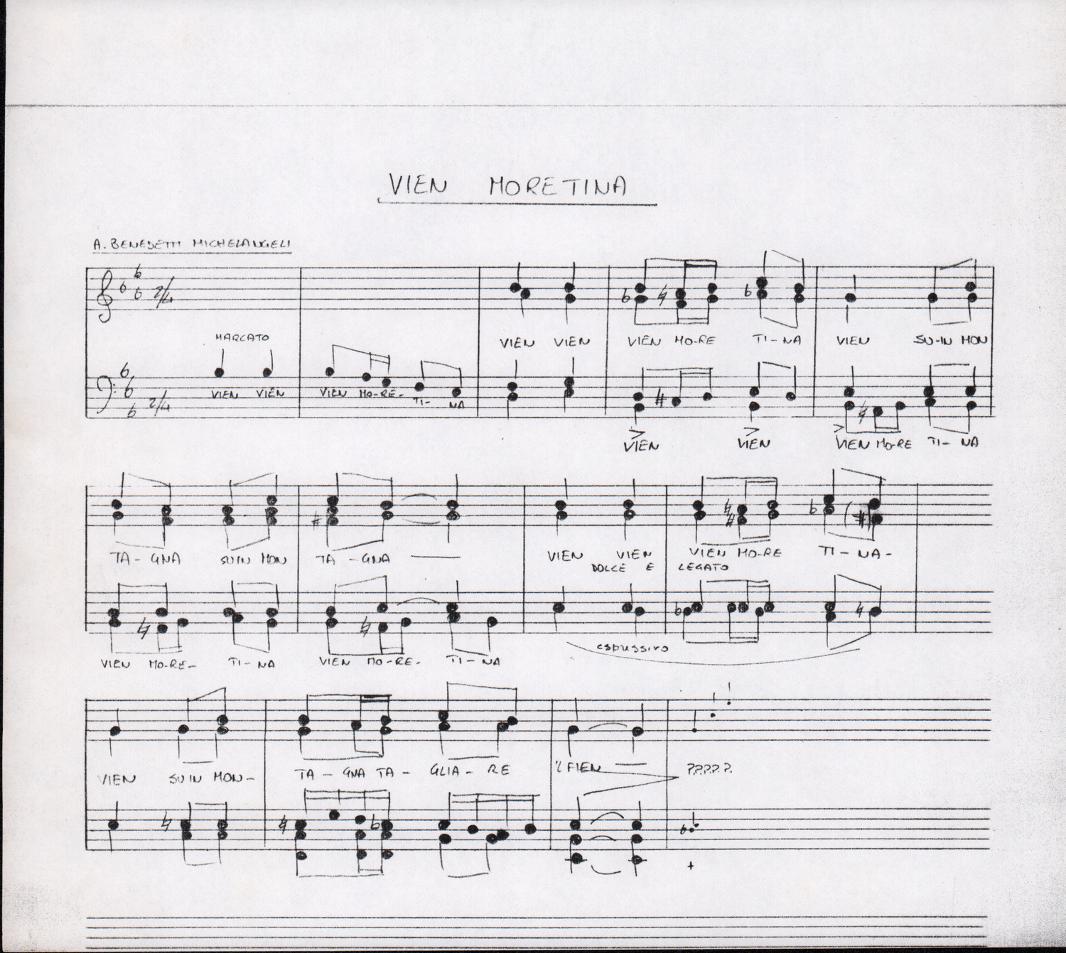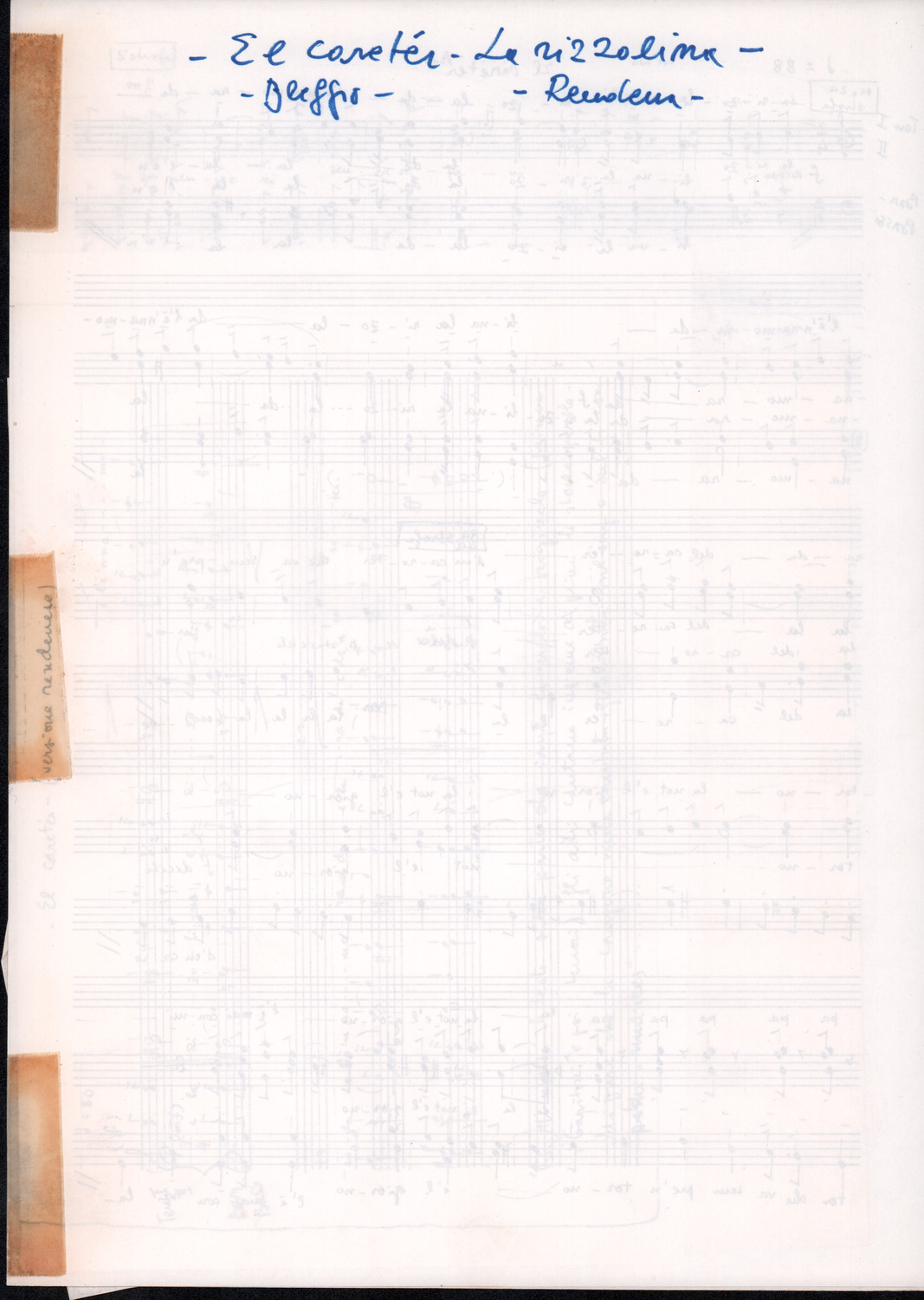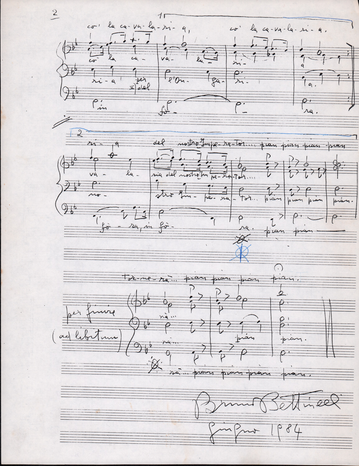 C.4.1.1 - Partiture e testi dei canti I tre Re dell’Oriente, ‘ndormenzete popin, Adeste fideles, Stelutis alpinis, Canto del boschiero, O sanctissima, Cossa gavé voi pare, Dove è la la Gisela, Son senza pan, Senti ‘l martelo, Il cucù, Iande mironai, My Bonnie, El caretér, O cara mama sé bona, Siamo partiti, Varda i mori che bate le ore, Se la te domanda, E tuti i vol la Gigia, L’erba rosa, La moretina, Perché ste còlere, Col ceston, La cartolina, Quando saremo giunti, Vien, vien, bionda d’amor, La banda civica, E l’ò tolta a Matarelo, Bondi y bon an, Come faremo a girare la Francia, Vostu che ti compre, Il povero soldato, Vien moretina, Menelik, Belina come te. Fotocopie degli originali manoscritti dagli armonizzatori, con testi dattiloscritti. 76 cc.