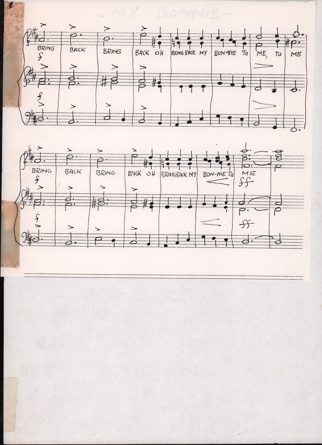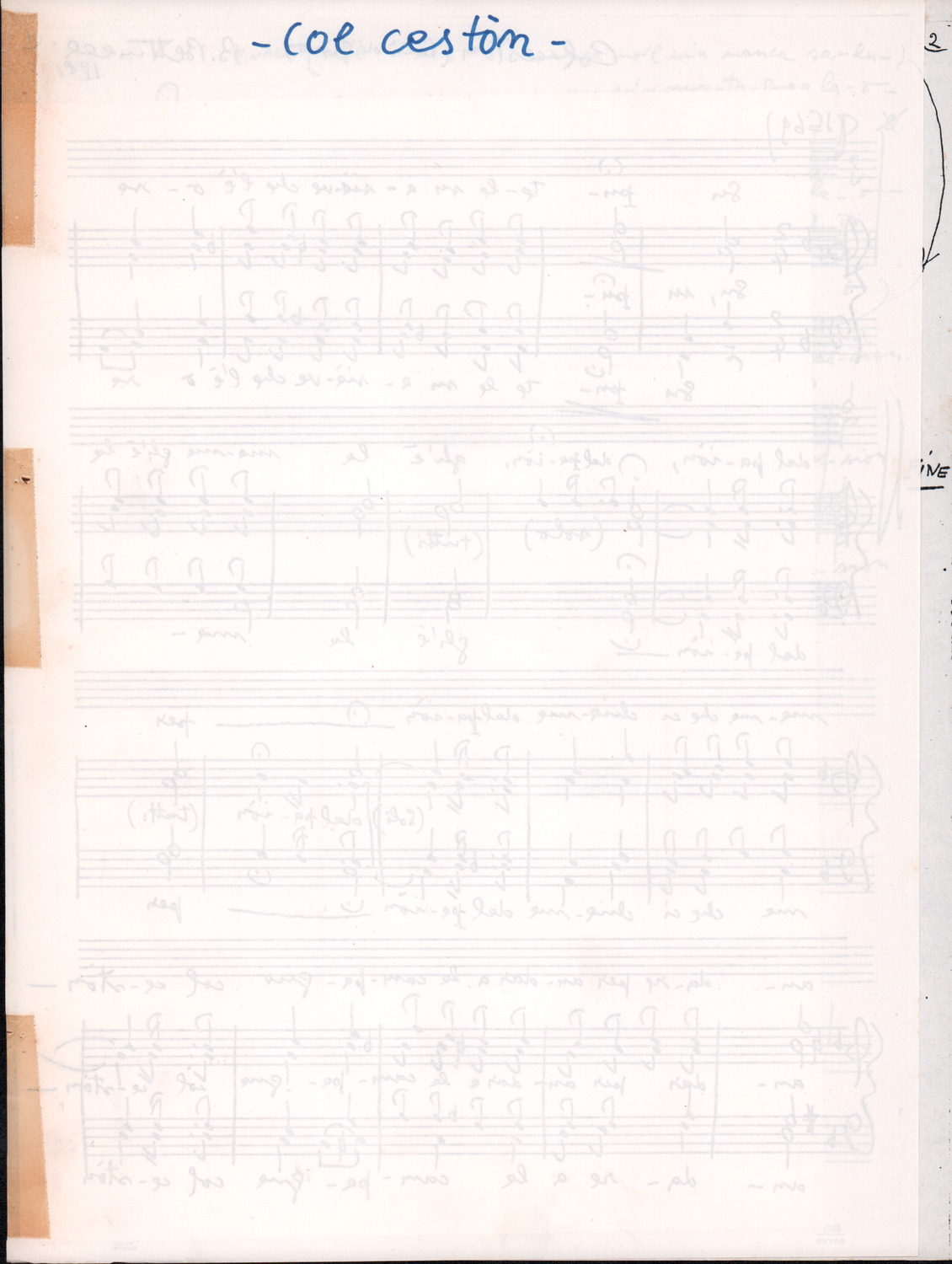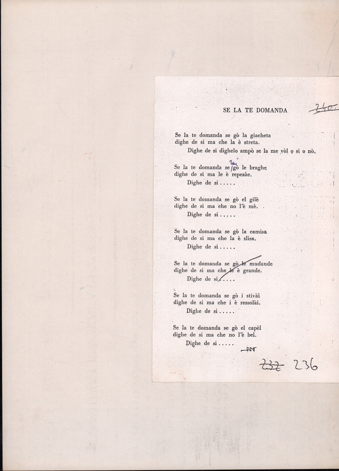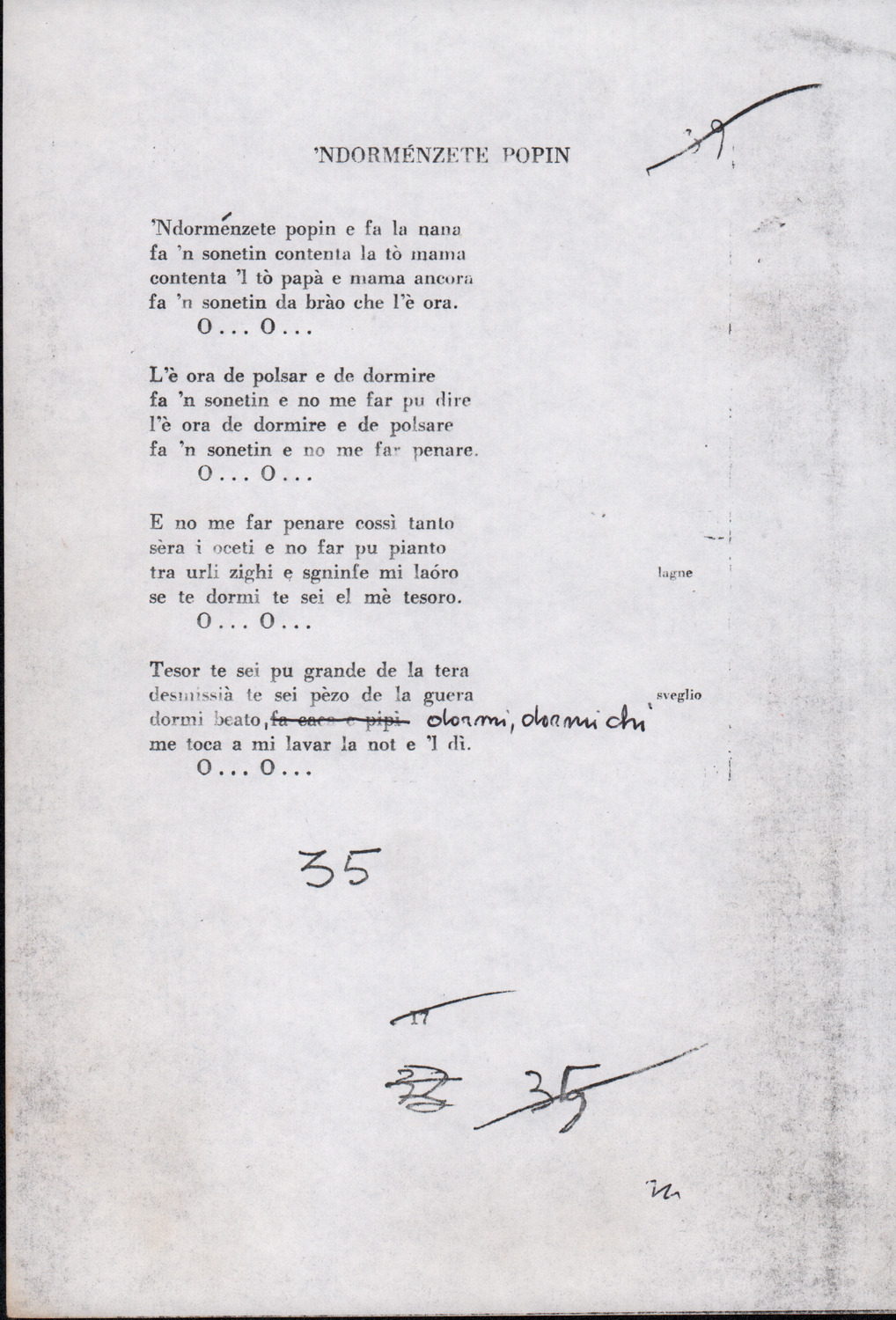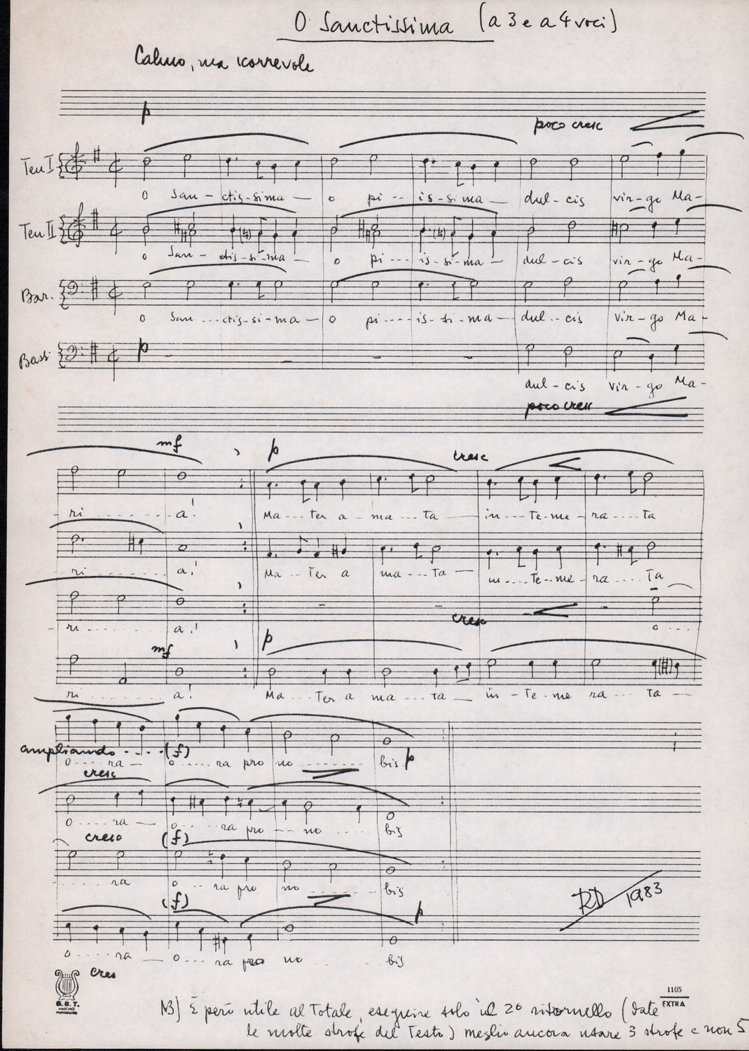 C.4.1.1 - Partiture e testi dei canti I tre Re dell’Oriente, ‘ndormenzete popin, Adeste fideles, Stelutis alpinis, Canto del boschiero, O sanctissima, Cossa gavé voi pare, Dove è la la Gisela, Son senza pan, Senti ‘l martelo, Il cucù, Iande mironai, My Bonnie, El caretér, O cara mama sé bona, Siamo partiti, Varda i mori che bate le ore, Se la te domanda, E tuti i vol la Gigia, L’erba rosa, La moretina, Perché ste còlere, Col ceston, La cartolina, Quando saremo giunti, Vien, vien, bionda d’amor, La banda civica, E l’ò tolta a Matarelo, Bondi y bon an, Come faremo a girare la Francia, Vostu che ti compre, Il povero soldato, Vien moretina, Menelik, Belina come te. Fotocopie degli originali manoscritti dagli armonizzatori, con testi dattiloscritti. 76 cc.