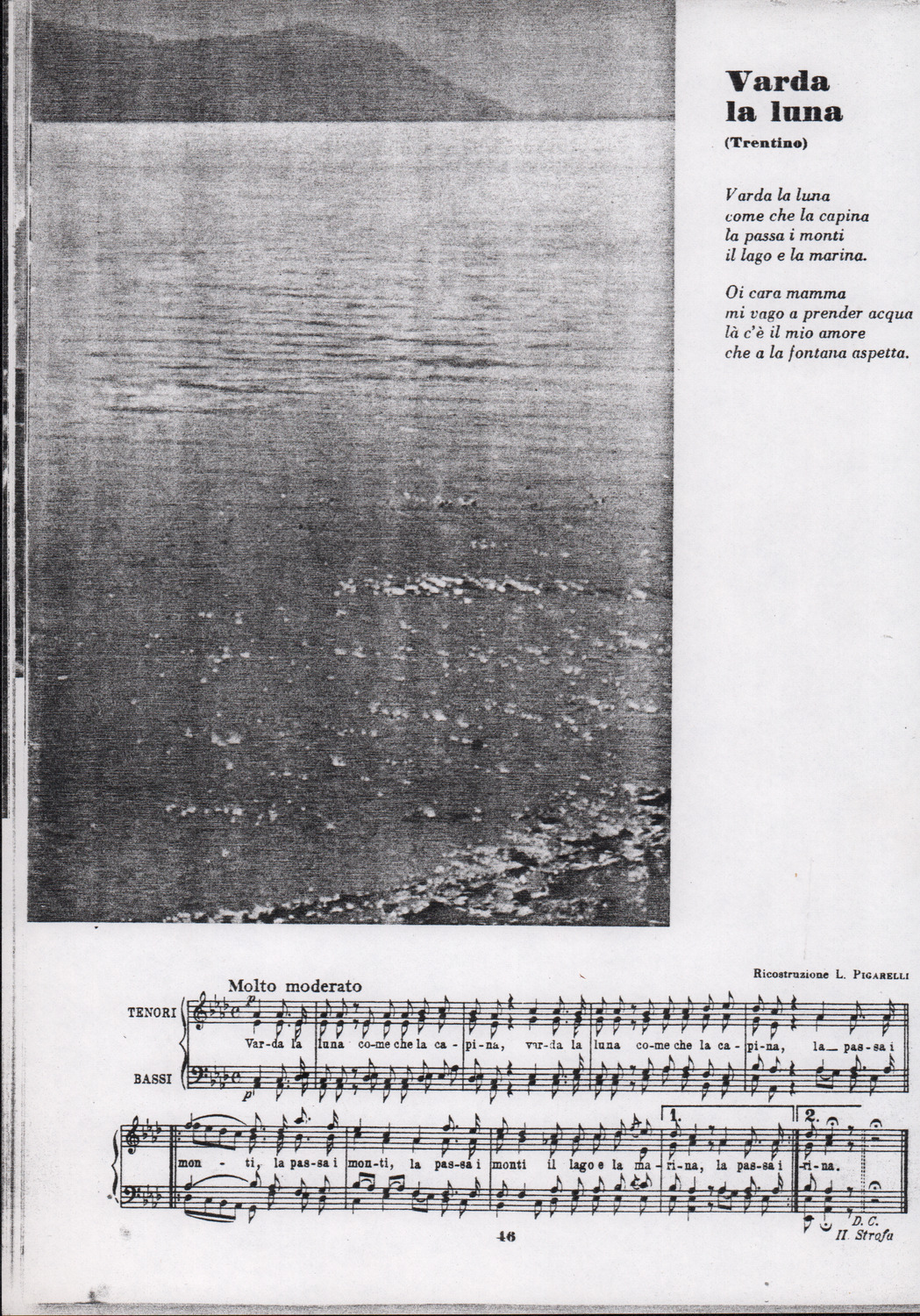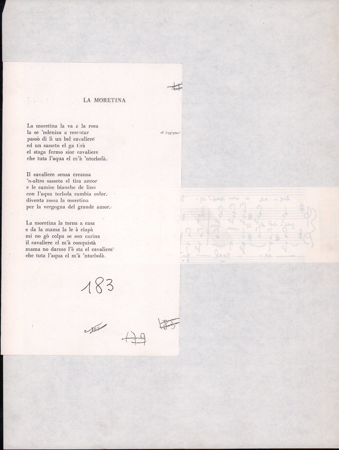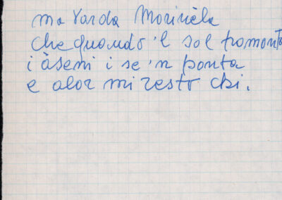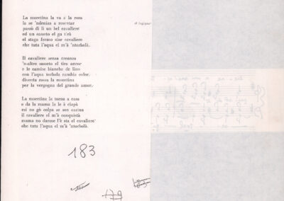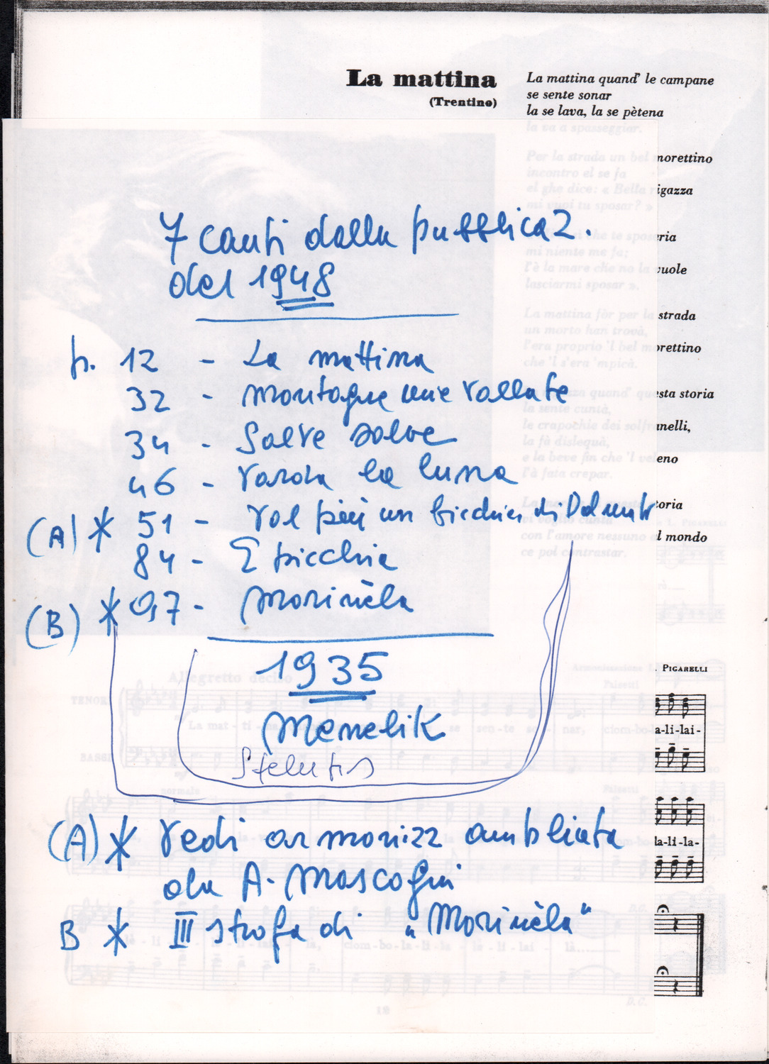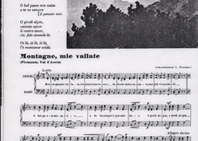 C.4.1.2 - Partiture e testi dei canti La mattina, Montagne mie vallate, Salve, salve la diva parola, Varda la luna, Val più un bicchier di Dalmato, E picchia, picchia a la porticella…, Morinèla. Fotocopie dalla seconda edizione dei Canti della montagna, 1948. Allegate 2 note manoscritte di Silvio Pedrotti. 8 cc.