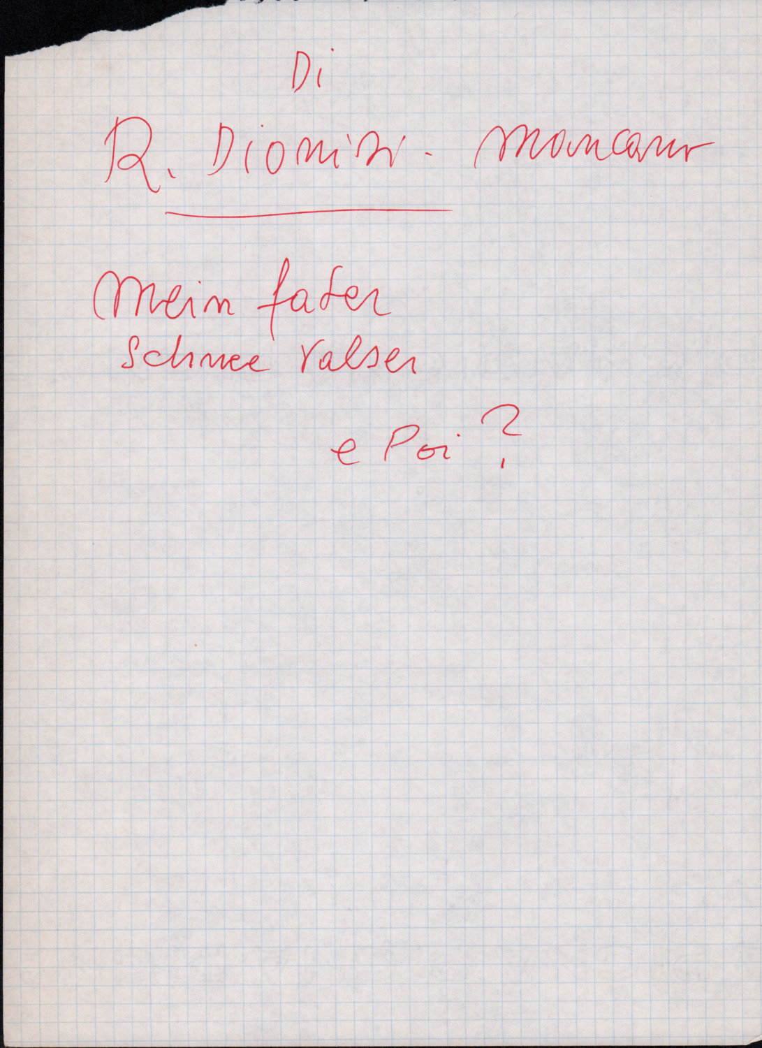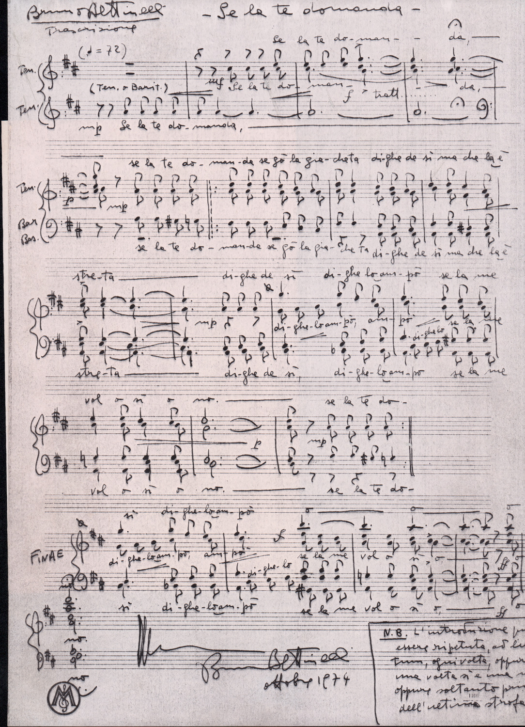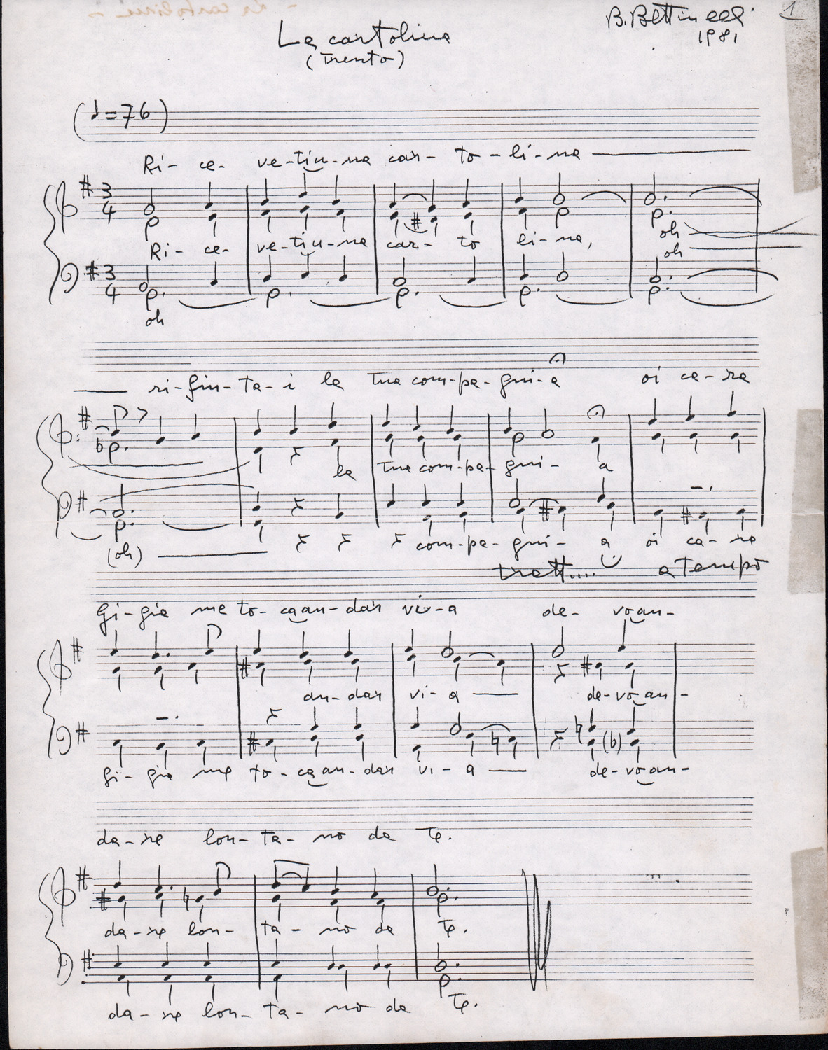 C.4.1.4 - Nota di Silvio Pedrotti relativa a partiture mancanti di Renato Dionisi. 1 c.
