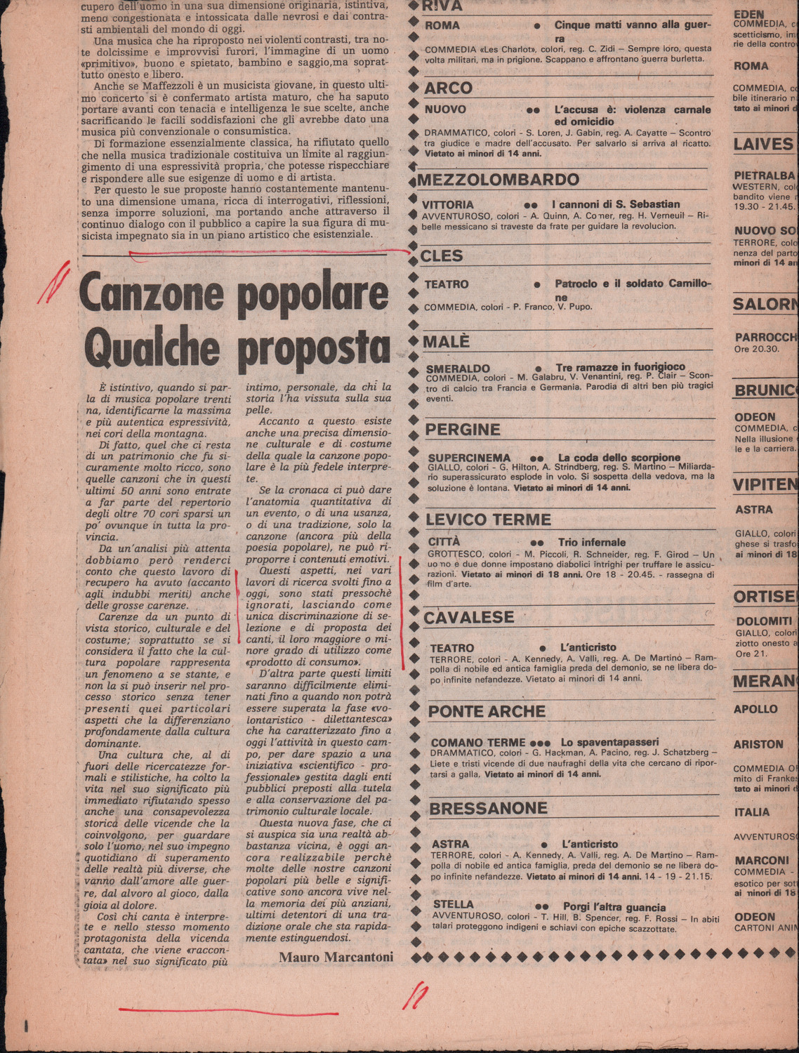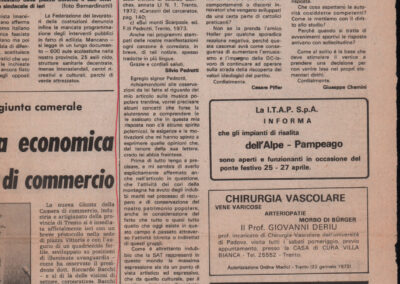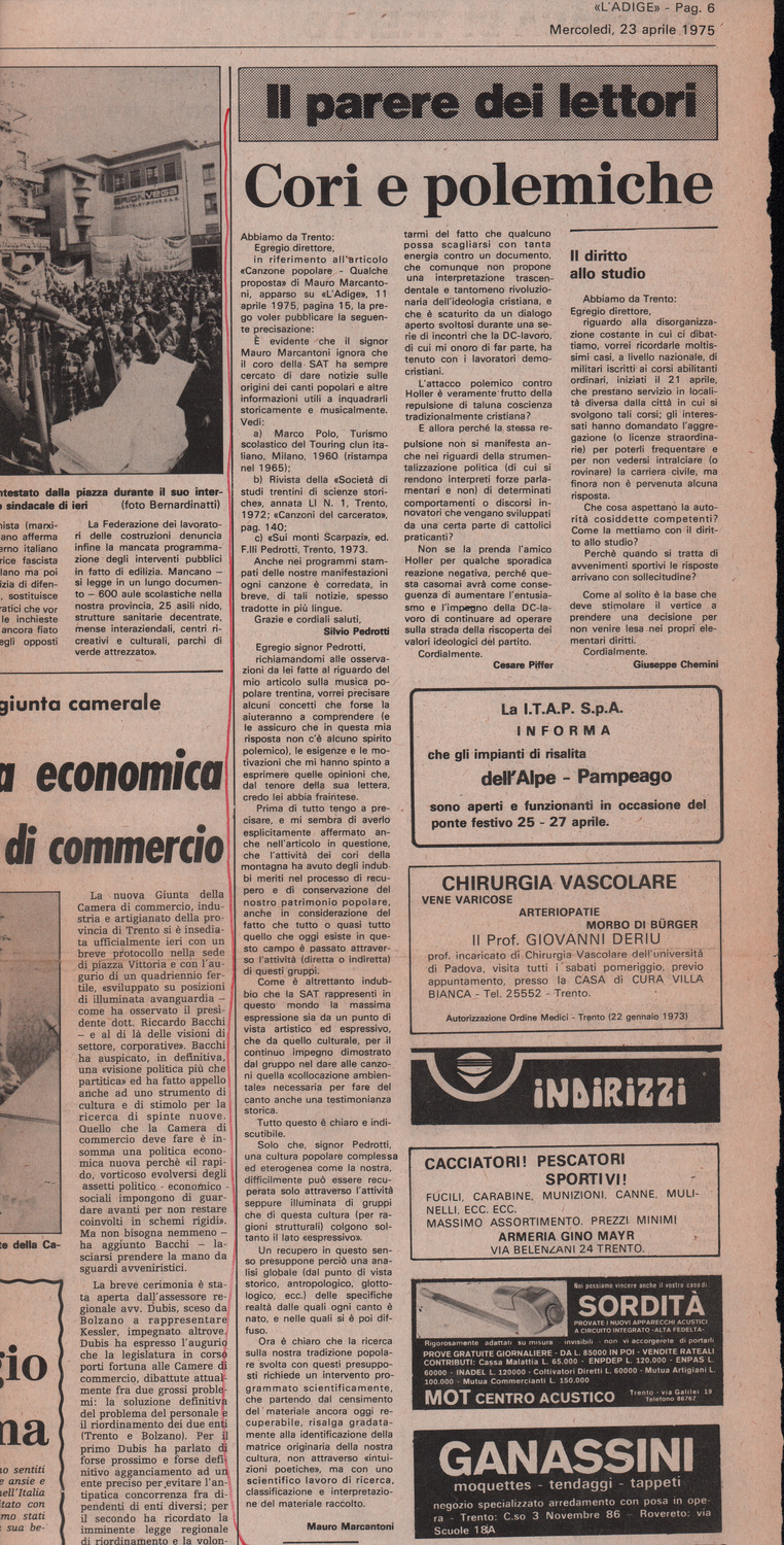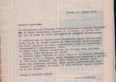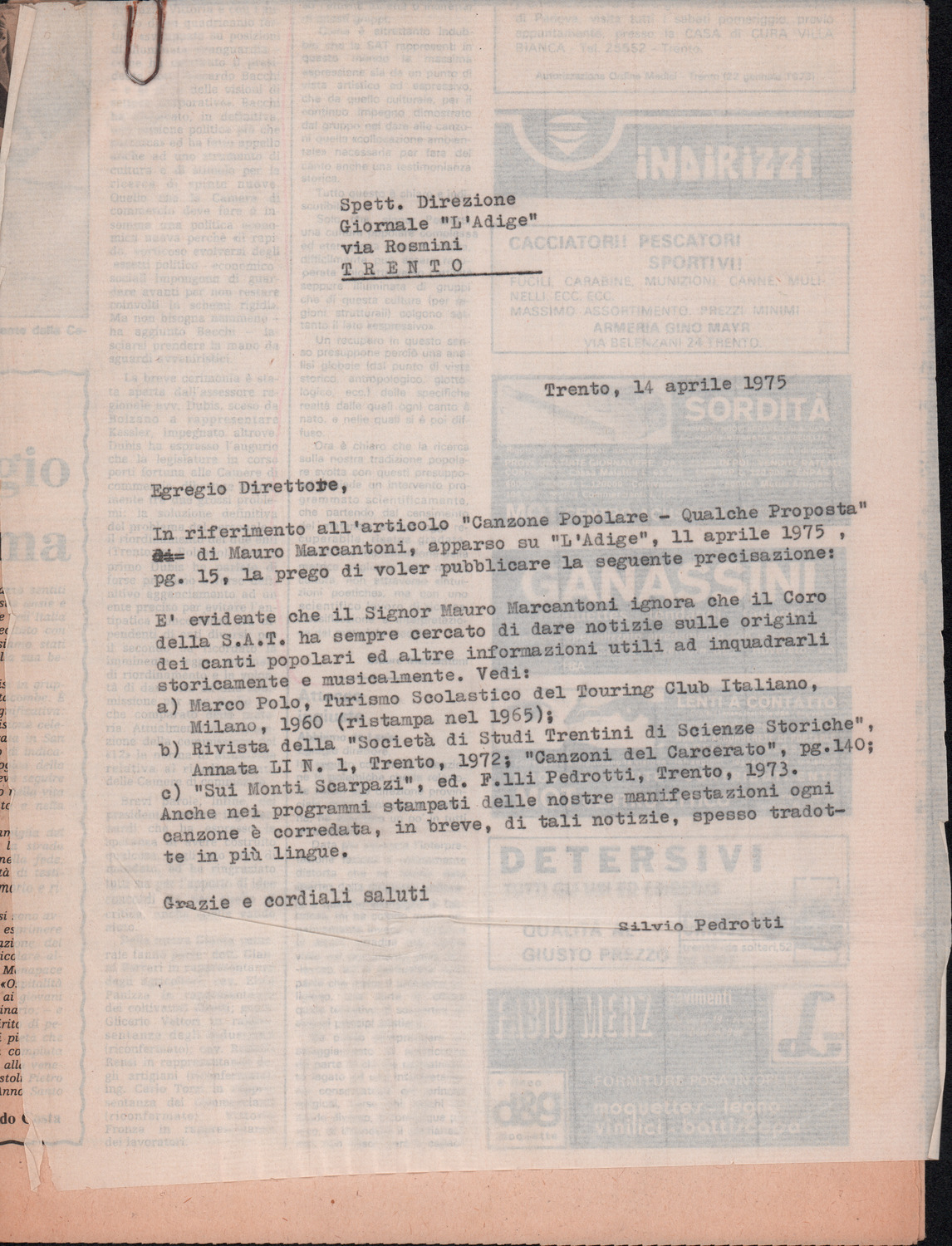 D.2.2.1 - Silvio Pedrotti alla Direzione del quotidiano «L’Adige». Trento, 1975 aprile 14. Allegati 2 ritagli di giornale dal quotidiano «L’Adige», 11 aprile 1975 e 23 aprile 1975. 1 c. e 2 ritagli di giornale.