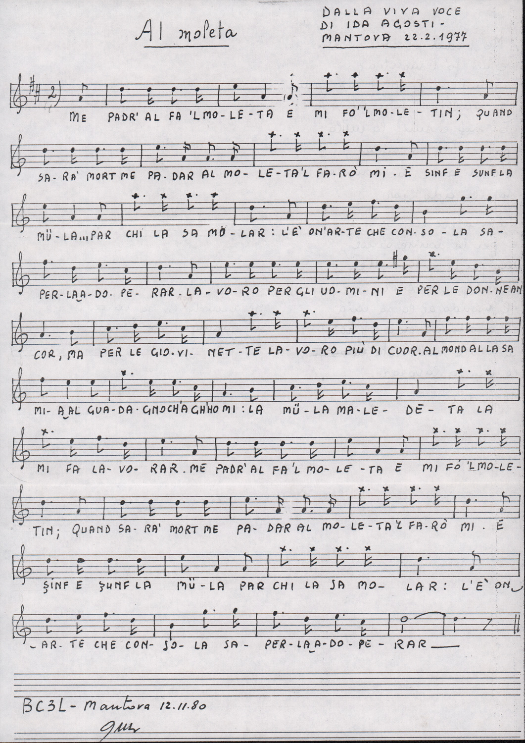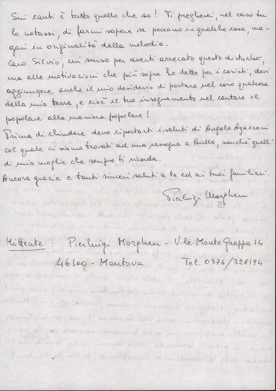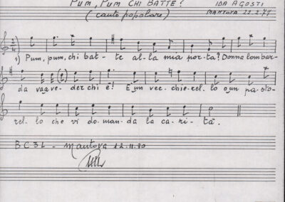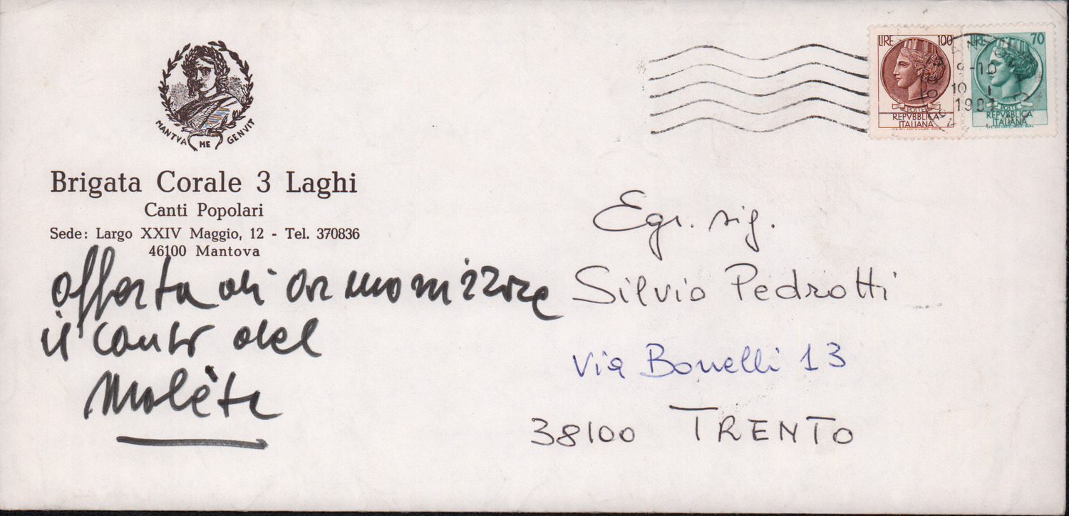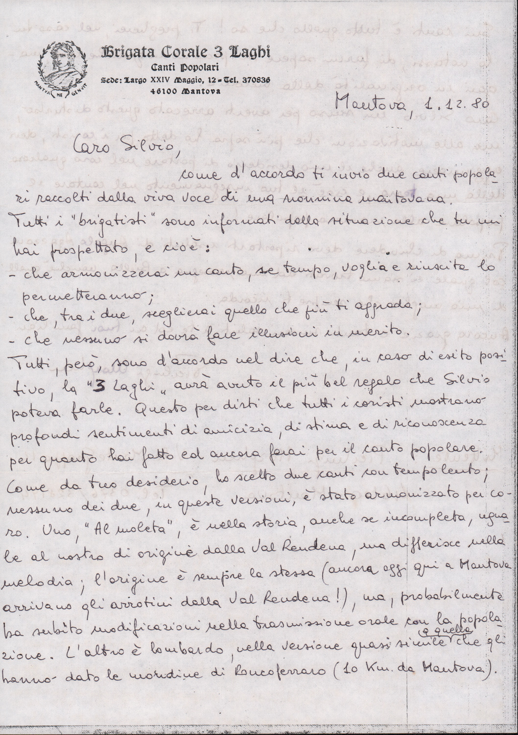 D.2.2.10 - Pier Luigi Morghen a Silvio Pedrotti. Mantova, 1980 dicembre 1. Allegati spartiti manoscritti dei canti El moleta, Pum Pum chi batte e testo del canto Dona Lombarda. 4 cc.