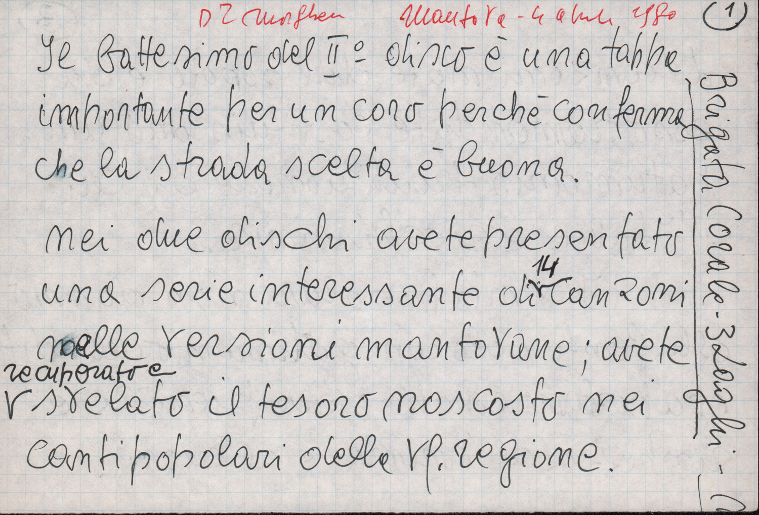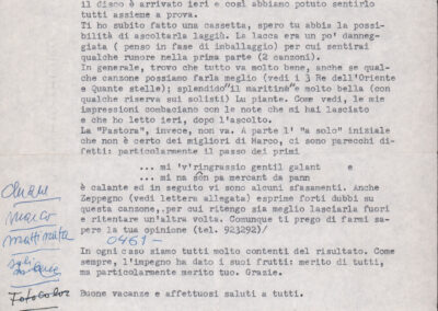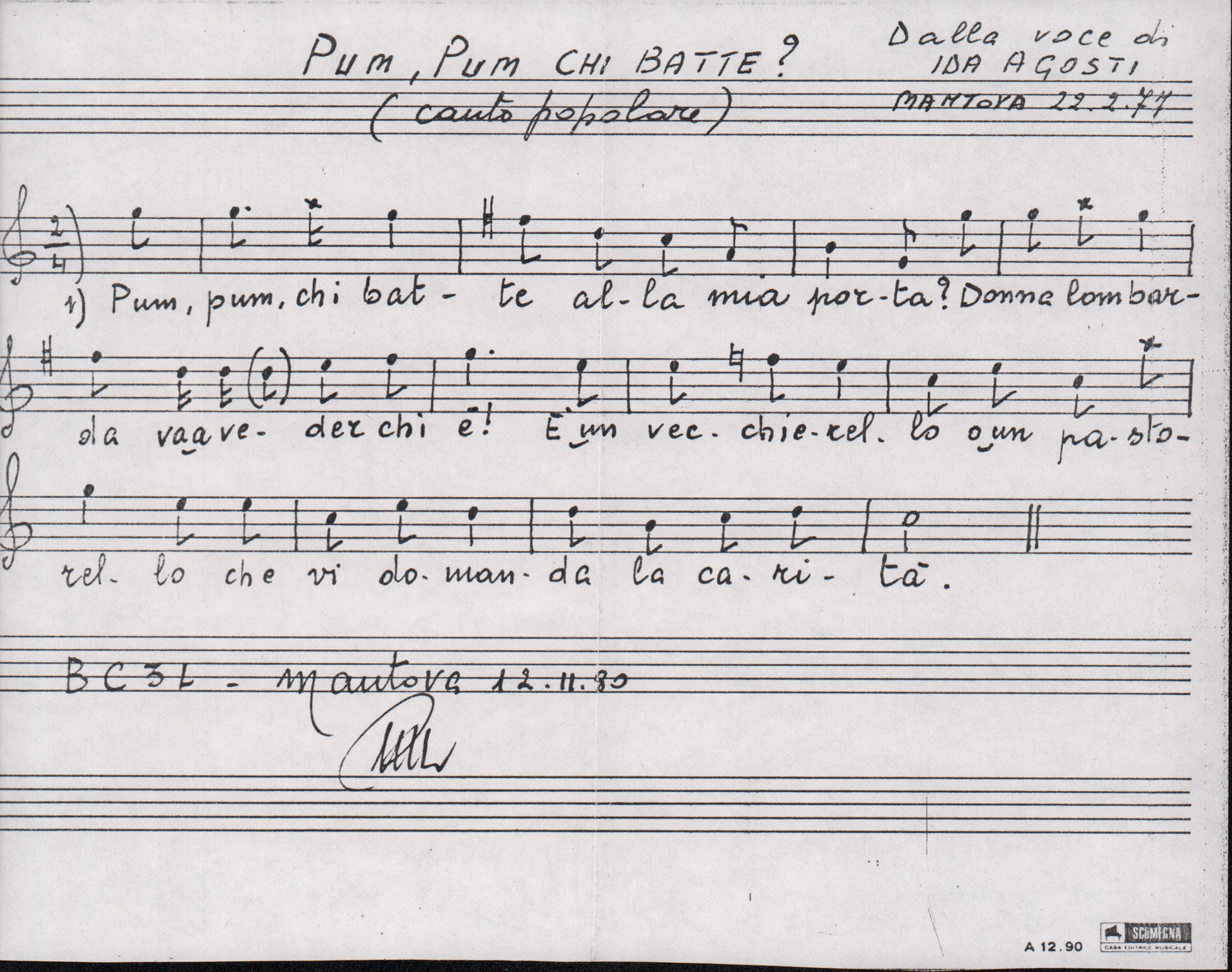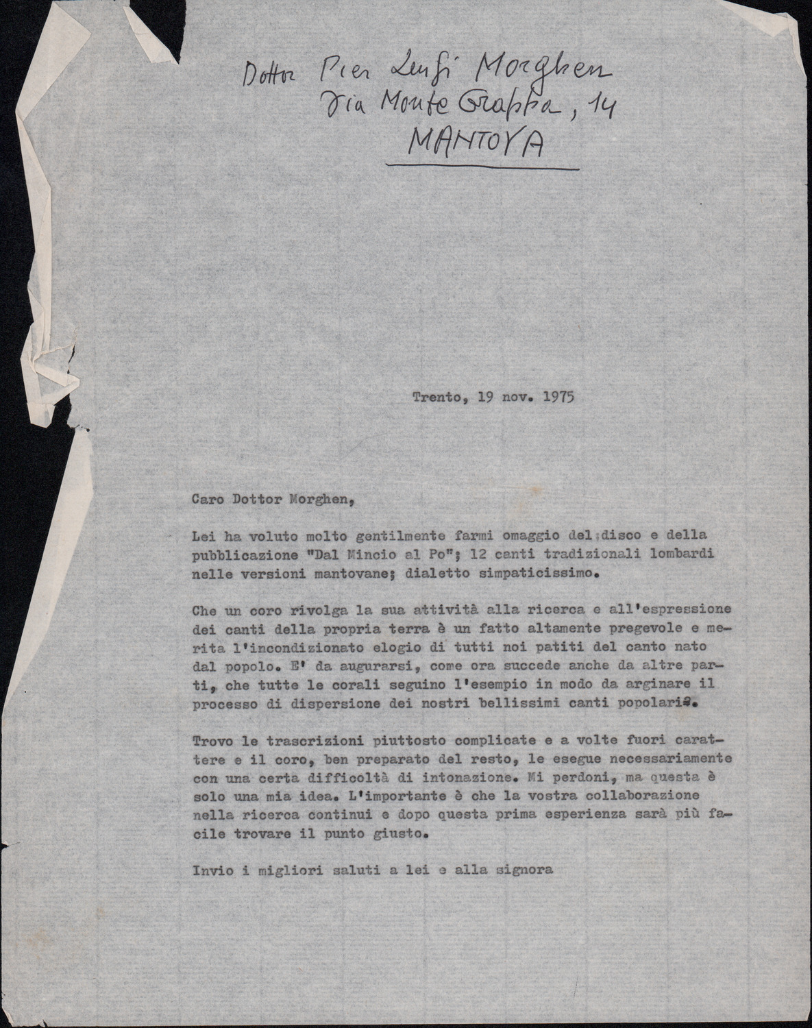 D.2.2.10 - Pier Luigi Morghen a Silvio Pedrotti. Mantova, 1980 dicembre 1. Allegati spartiti manoscritti dei canti El moleta, Pum Pum chi batte e testo del canto Dona Lombarda. 4 cc.