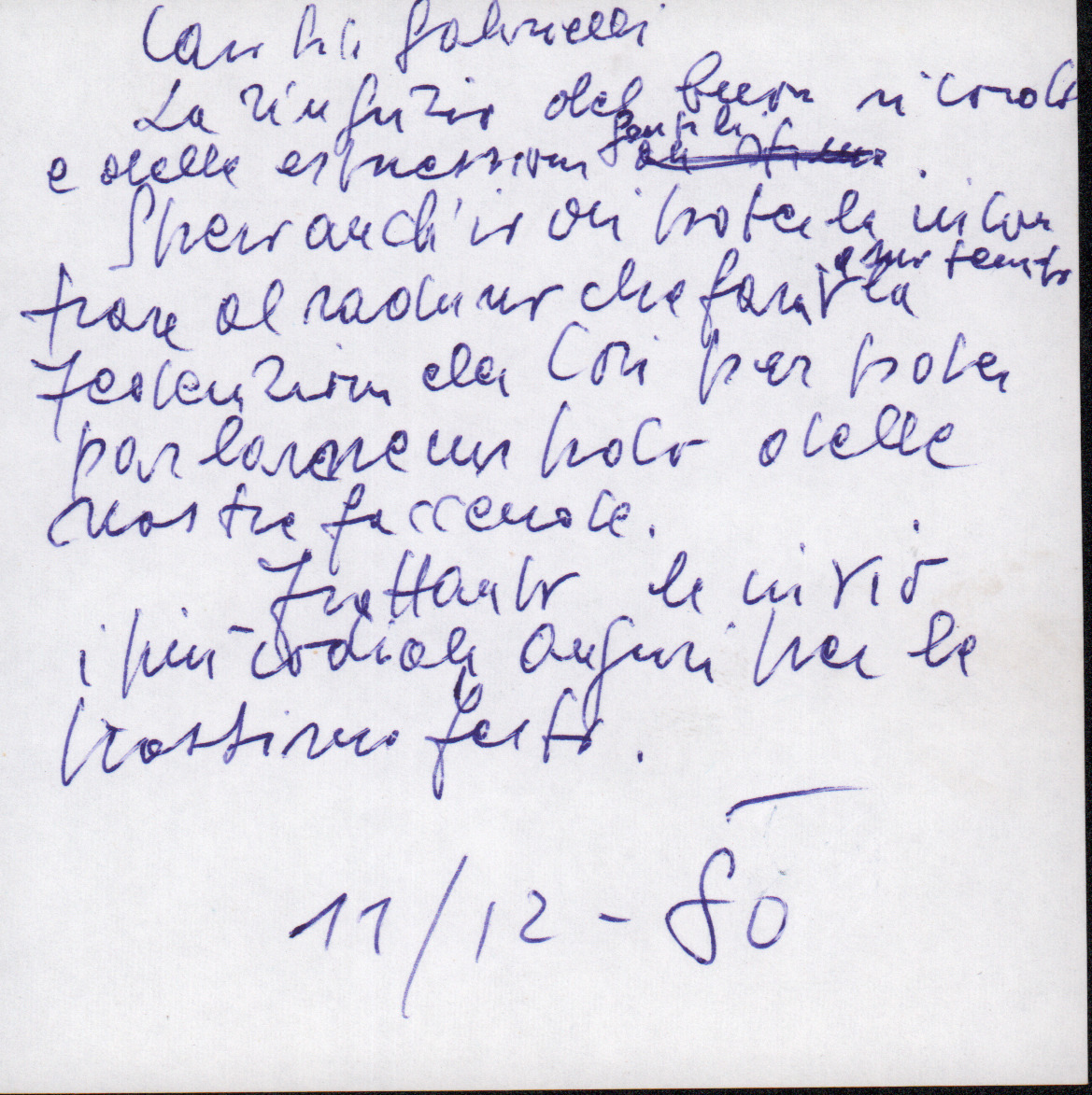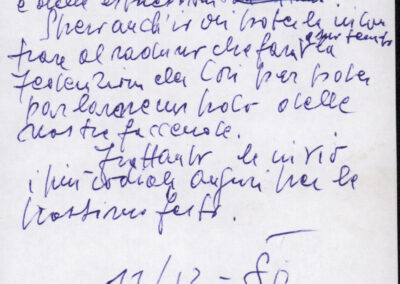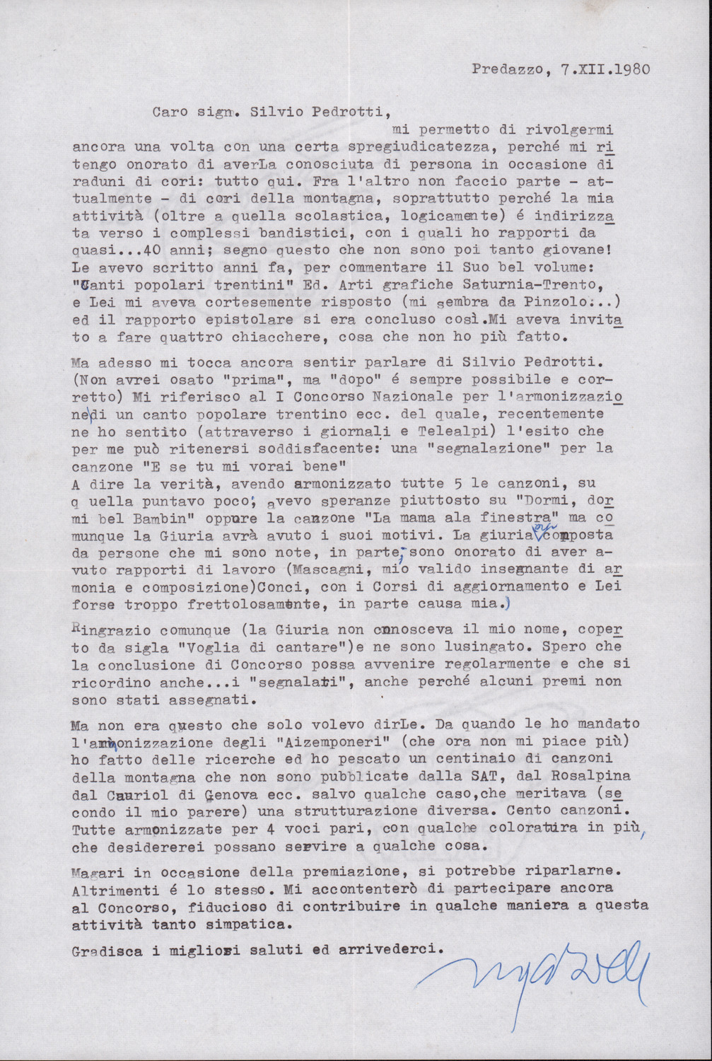 D.2.2.11 - Silvio Nicolò Gabrielli a Silvio Pedrotti. Predazzo, 1980 dicembre 7. Allegata brutta copia della risposta di Silvio Pedrotti, 11 dicembre 1980. 2 cc.