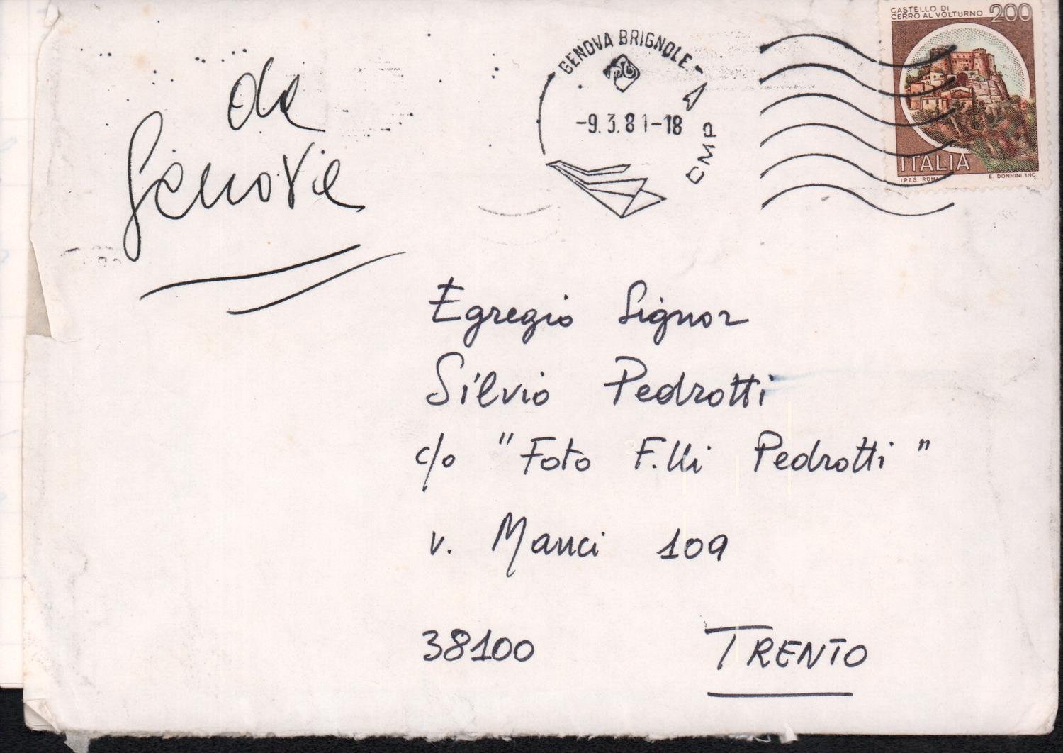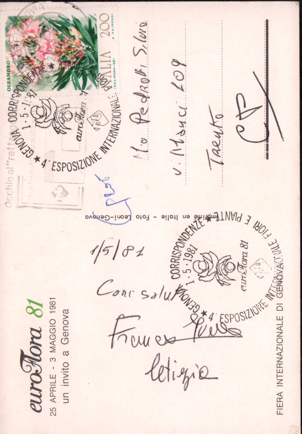 D.2.2.14 - Franco a Silvio Pedrotti. Genova, 1981 maggio 1. 1 cartolina.