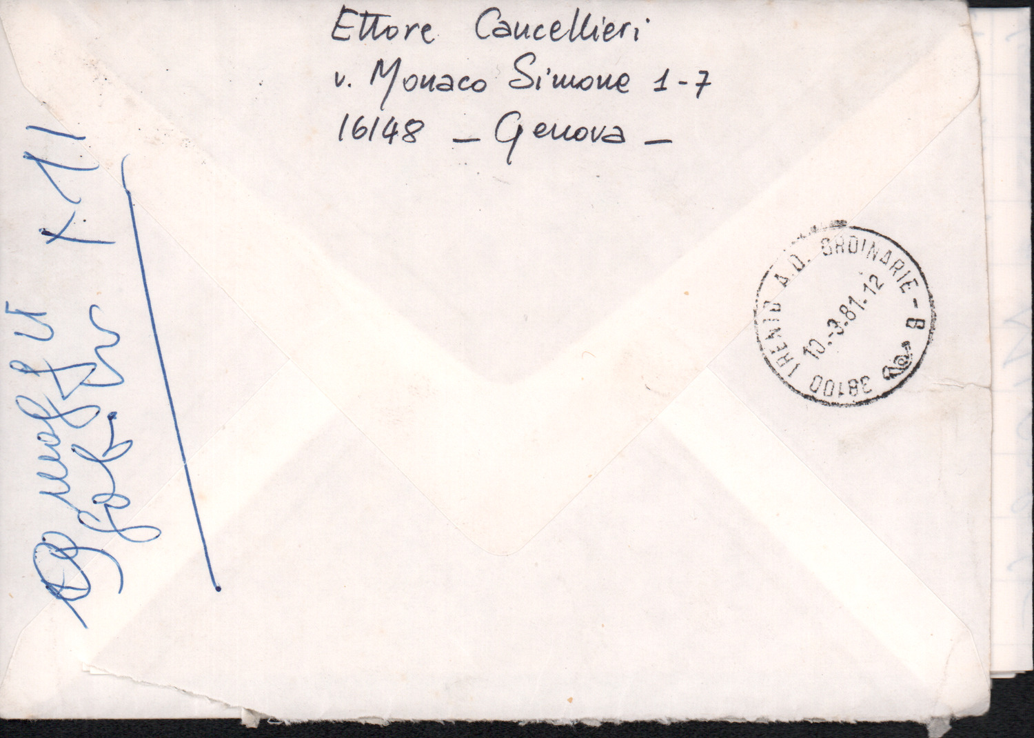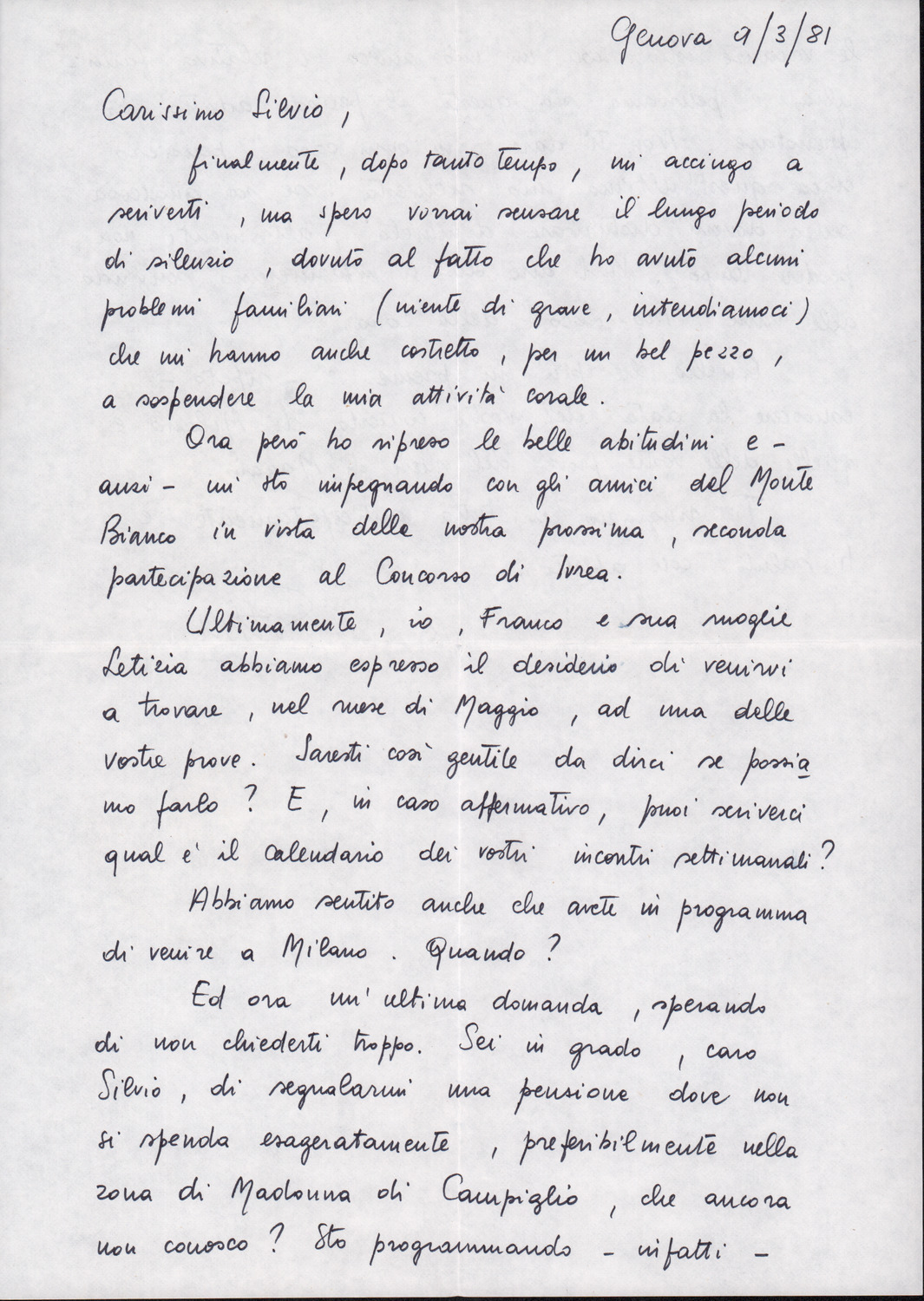 D.2.2.12 - Ettore Cancellieri a Silvio Pedrotti. Genova, 1981 marzo 9. Allegata lettera di risposta di Silvio Pedrotti in brutta copia. 2 cc.