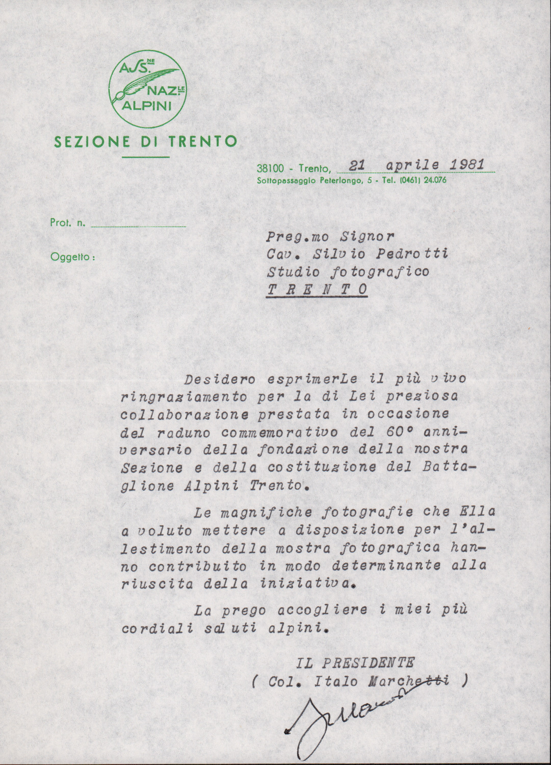 D.2.2.3 - Italo Marchetti a Silvio Pedrotti. Trento, 1981 aprile 21. 1 c.