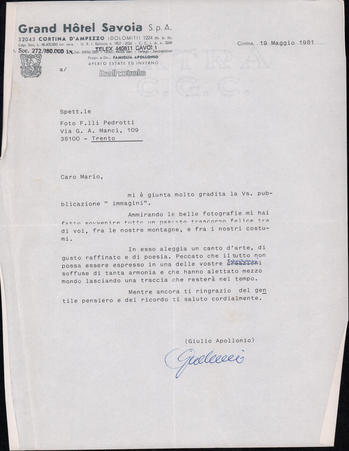 D.2.2.16 - Guido Apollonio a Silvio Pedrotti. Cortina d’Ampezzo, 1981 maggio 19. 1 c.