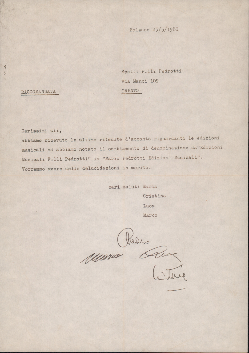 D.2.2.17 - Maria, Cristina, Luca e Marco Pedrotti a Silvio Pedrotti. Bolzano, 1981 maggio 25. 1 c.