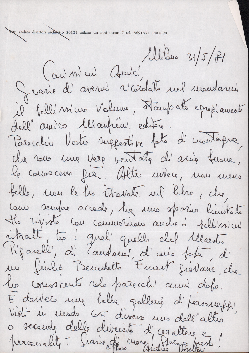 D.2.2.18 - Andrea Disertori a Silvio Pedrotti. Milano, 1981 maggio 31. 1 c.