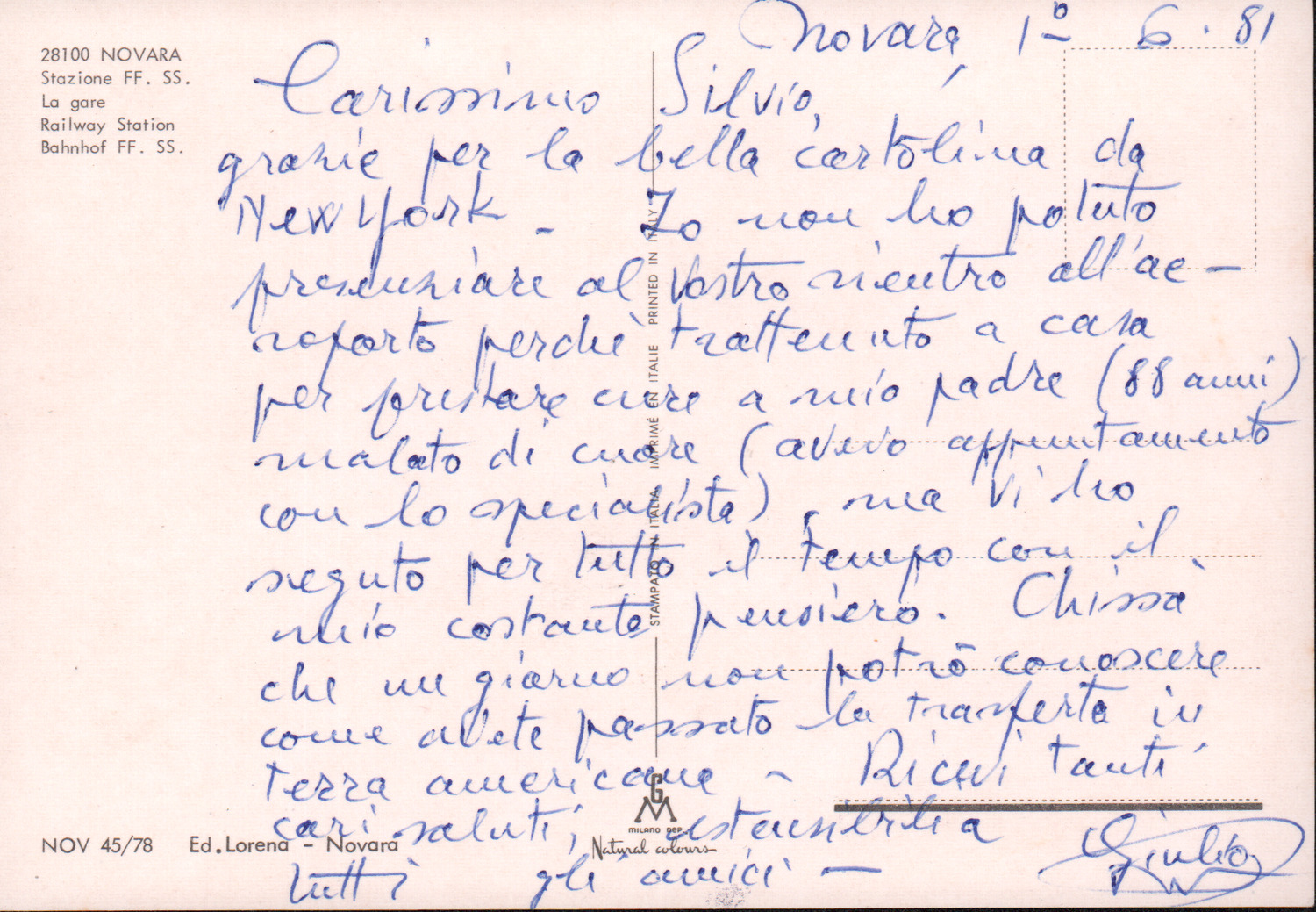 D.2.2.19 - Giulio a Silvio Pedrotti. Novara, 1981 giugno 1. 1 cartolina.