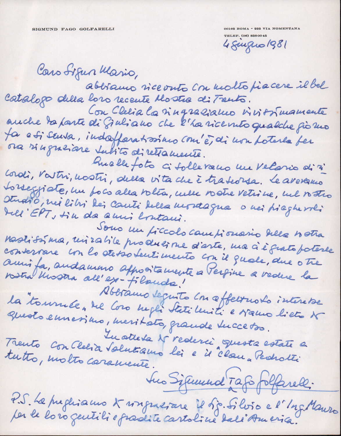 D.2.2.20 - Sigmund Fago Golfarelli a Mario Pedrotti. Roma, 1981 giugno 4. 1 c.