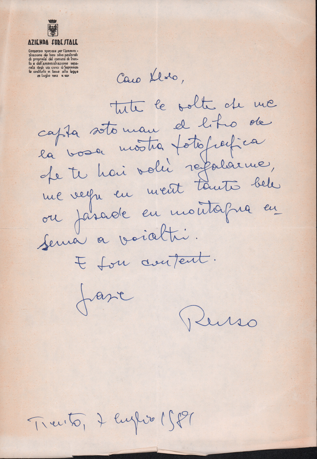 D.2.2.22 - Renzo a Silvio Pedrotti. Trento, 1981 luglio 7. 1 c.
