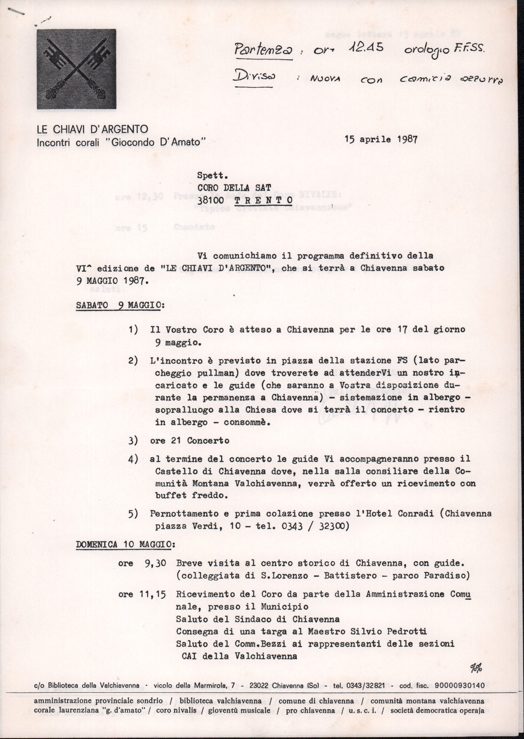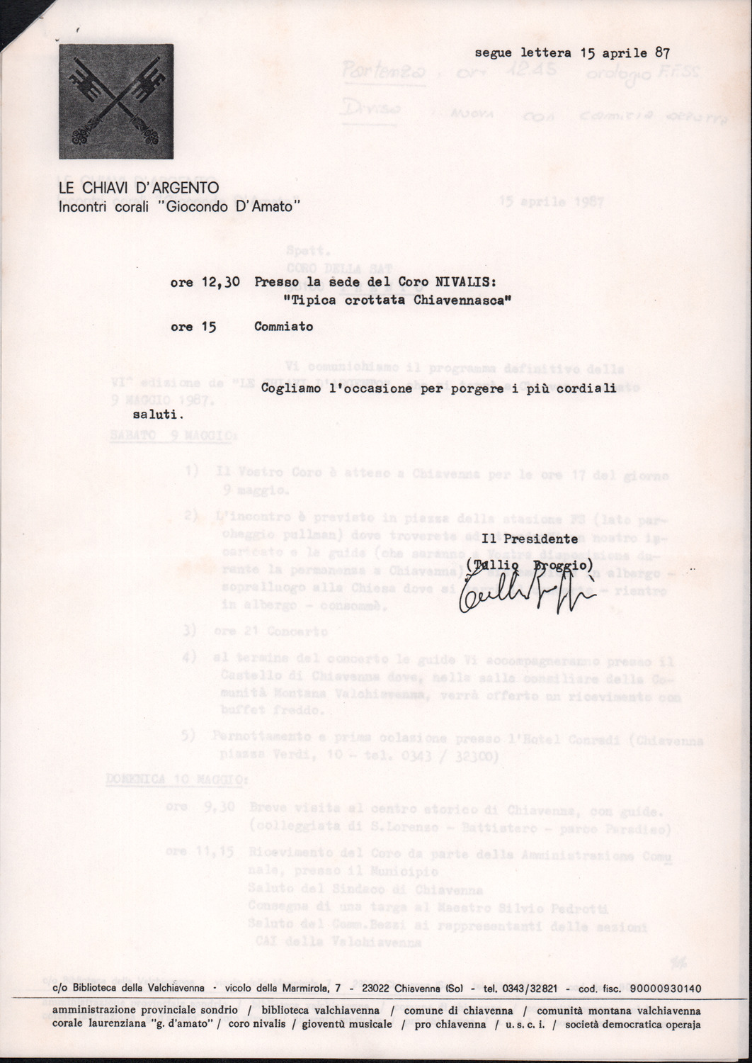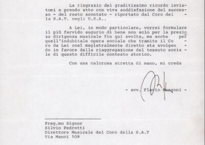 D.2.2.35 - Tullio Broggio al Coro della SAT. Chiavenna, 1987 aprile 15. 2 cc. dattiloscritte.