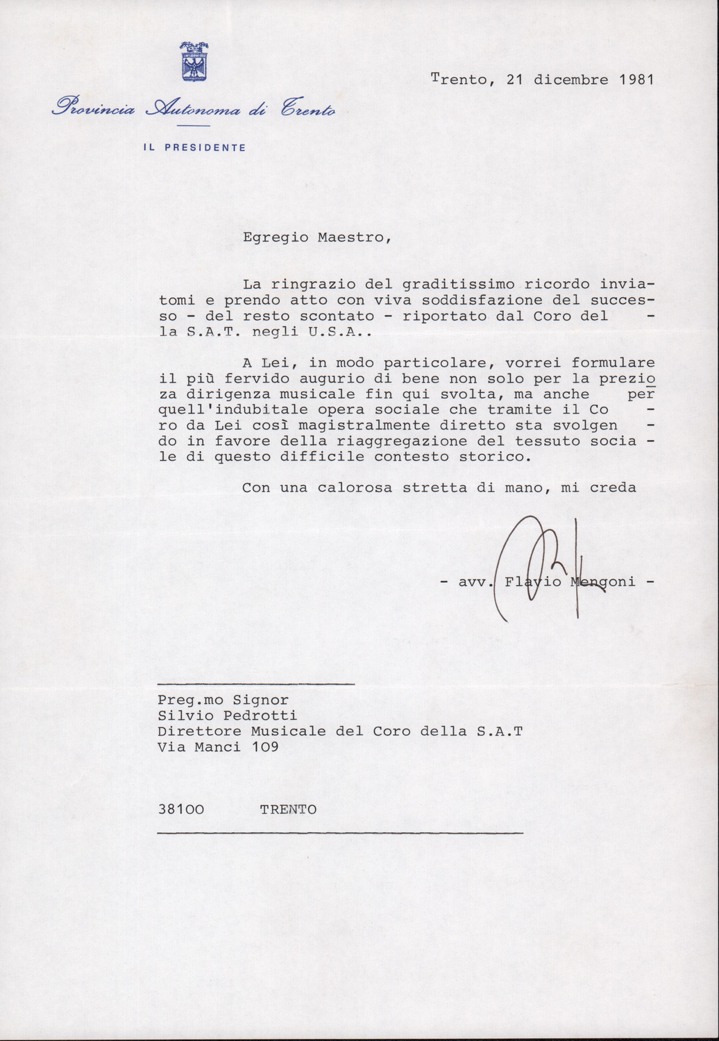 D.2.2.25 - Flavio Mengoni a Silvio Pedrotti. Trento, 1981 dicembre 21. 1 c.