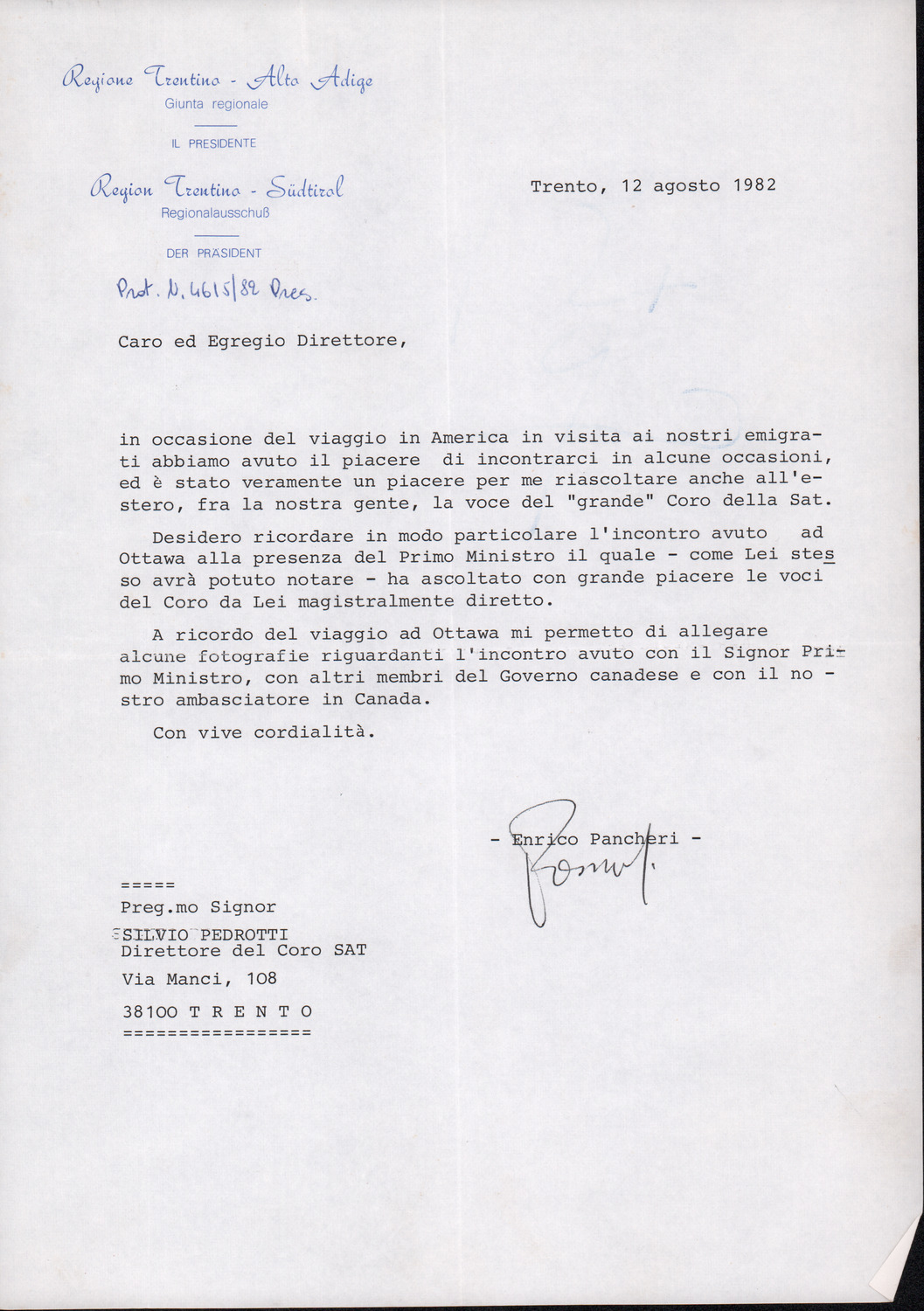 D.2.2.26 - Enrico Pancheri a Silvio Pedrotti. Trento, 1982 agosto 12. 1 c.