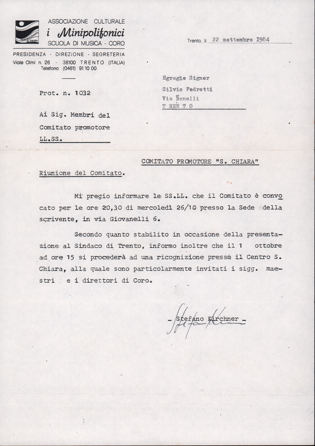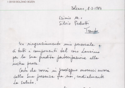 D.2.2.29 - Stefano Kirchner a Silvio Pedrotti. 1984 settembre 22. 1 c.
