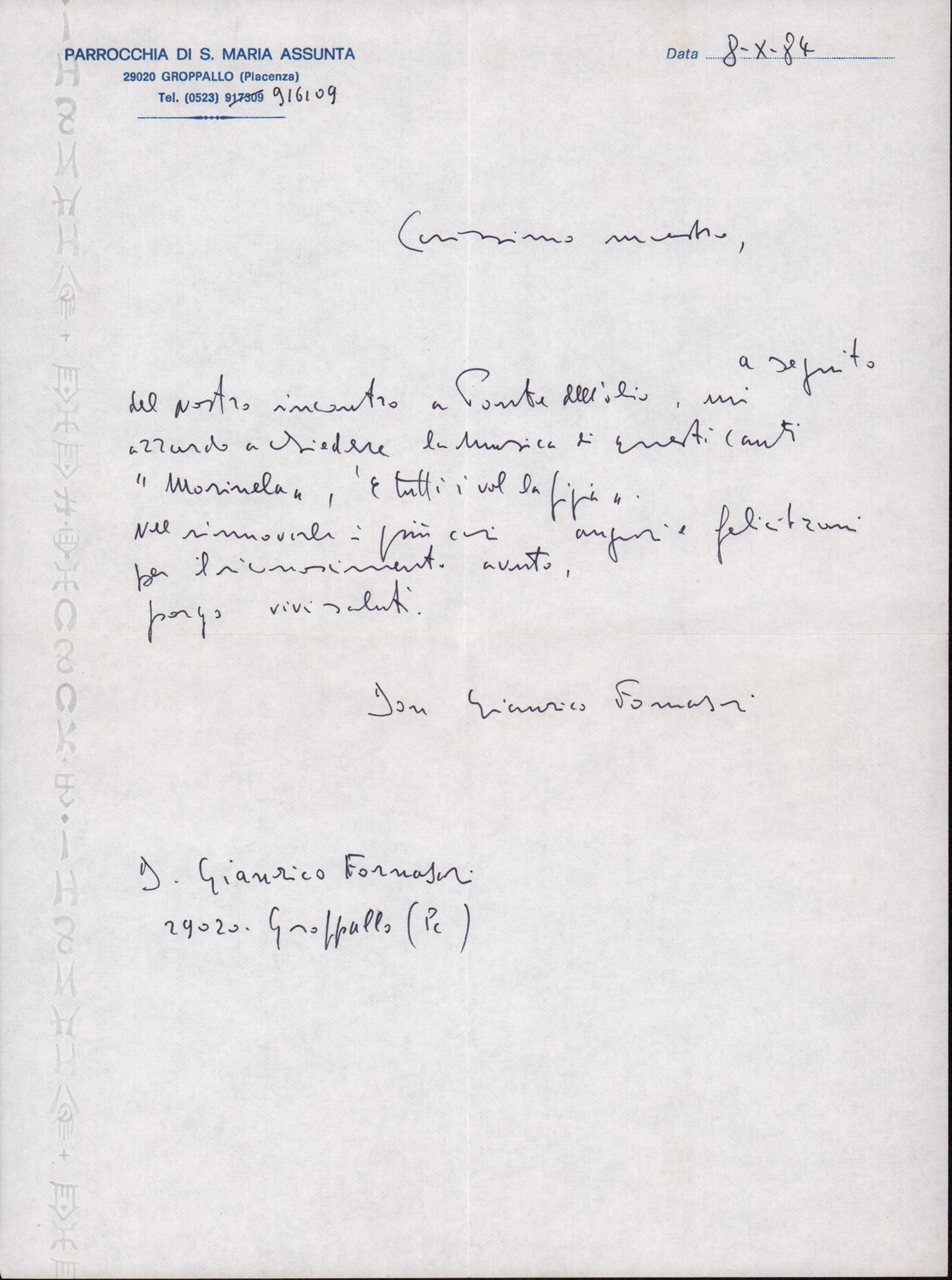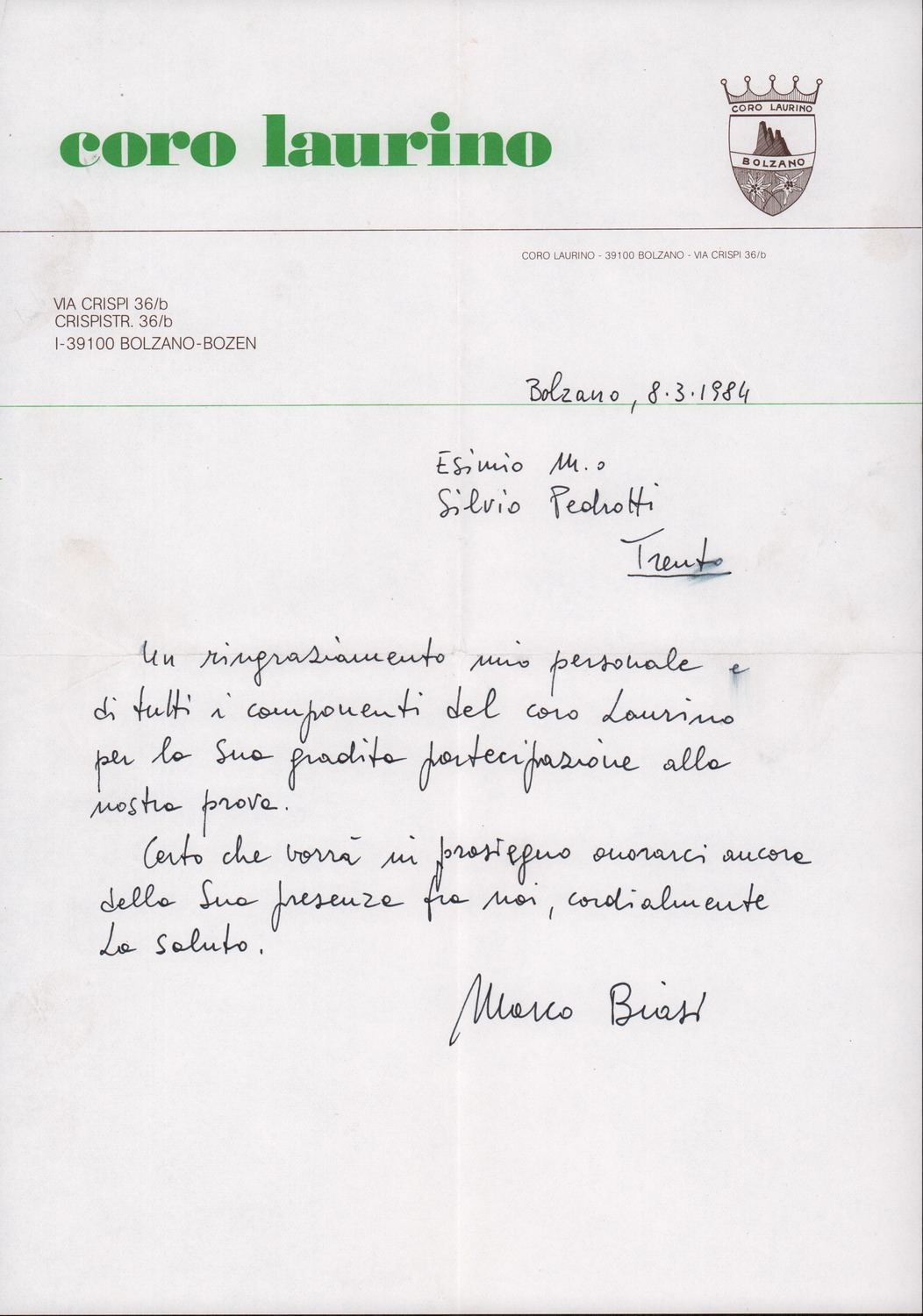D.2.2.28 - Marco Biasi a Silvio Pedrotti. Bolzano, 1984, marzo 8. 1 c.