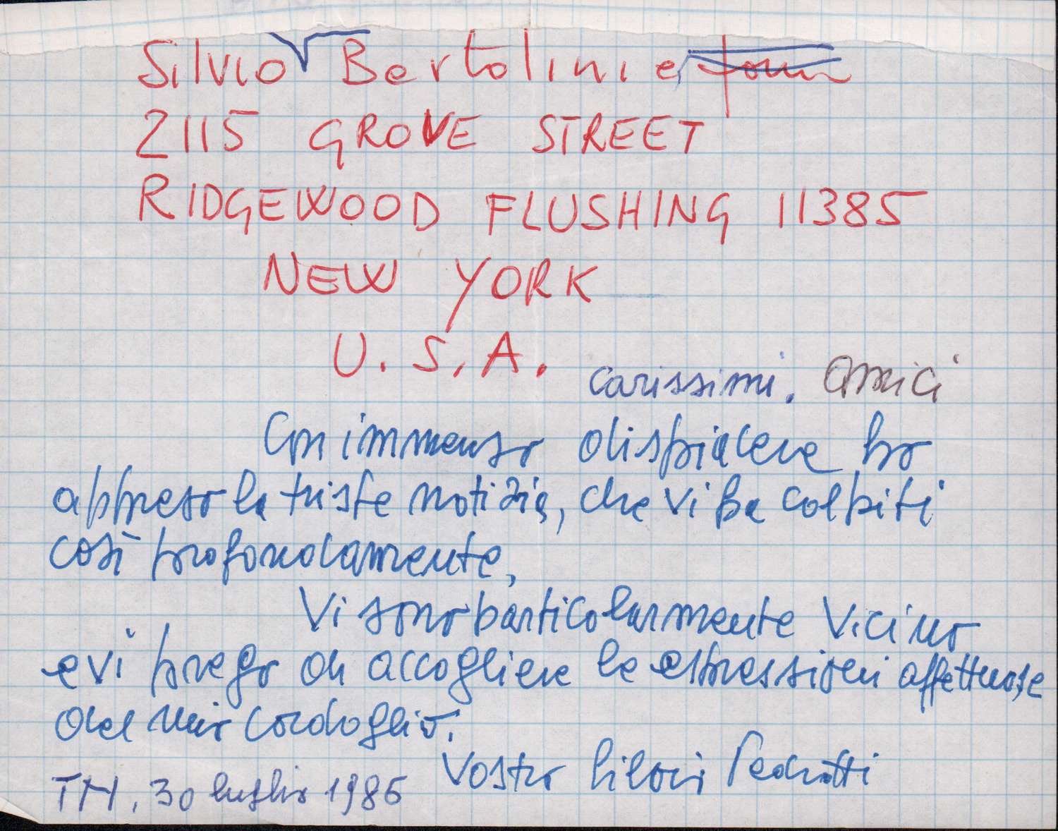 D.2.2.32 - Silvio Pedrotti a Silvio Bertolini. Trento, 1986 luglio 30. 1 c.