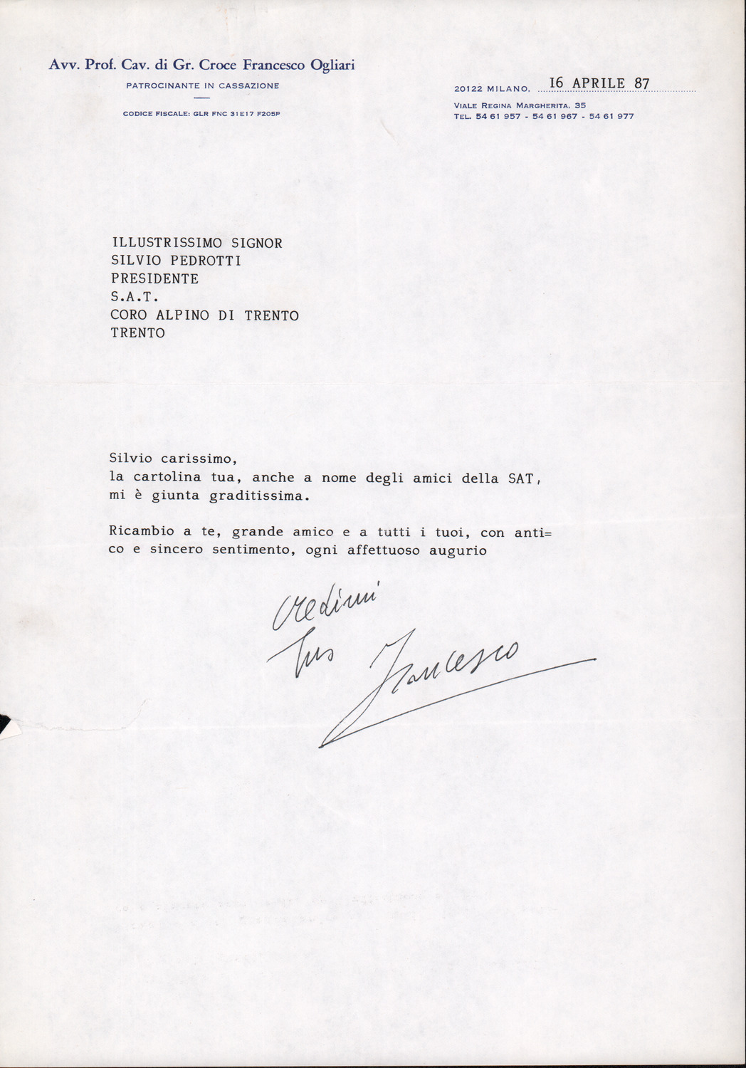 D.2.2.36 - Francesco Ogliari a Silvio Pedrotti. Milano, 1987 aprile 16. 1 c.