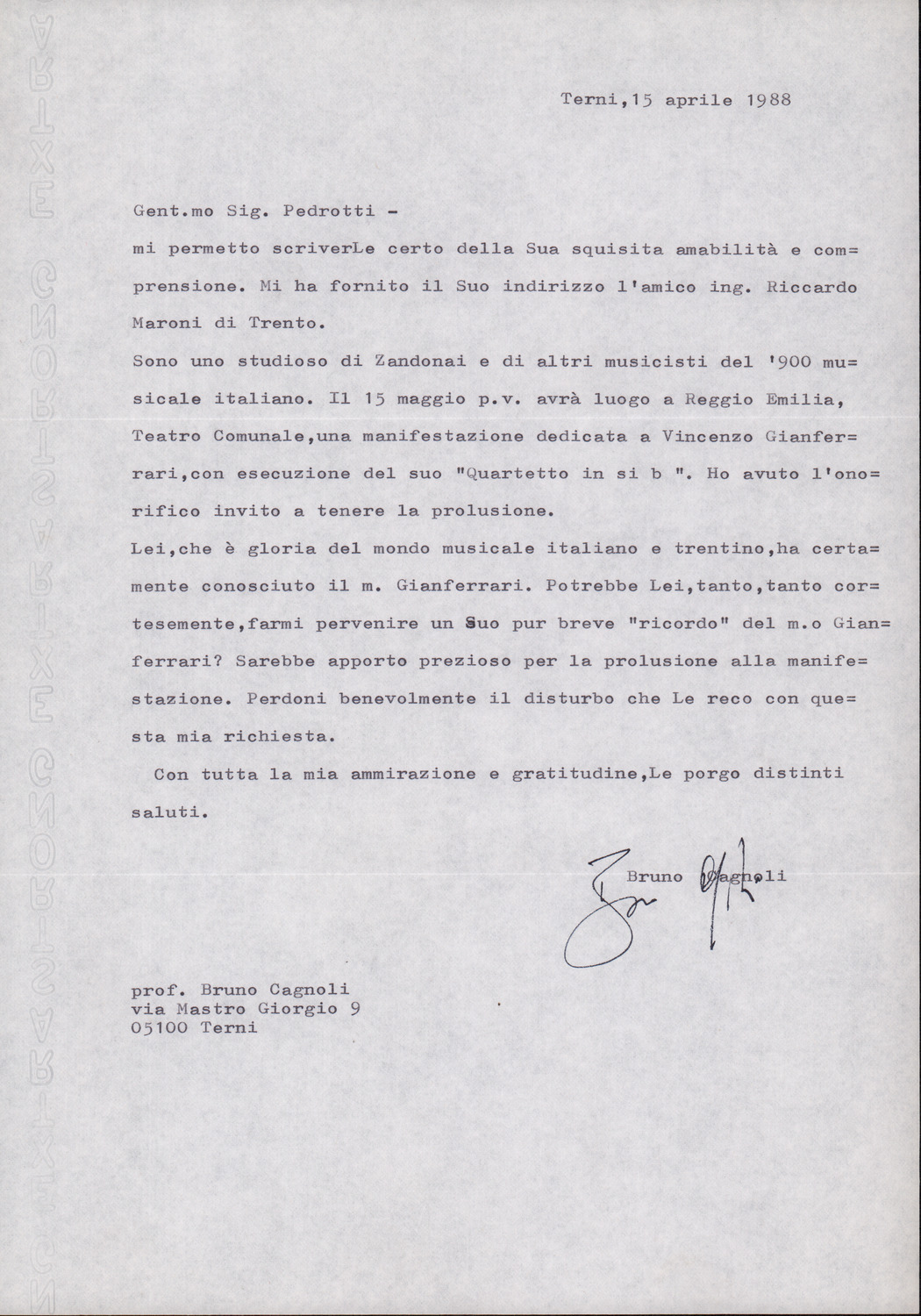 D.2.2.38 - Bruno Cagnoli a Silvio Pedrotti. Terni, 1988 aprile 15. 1 c.