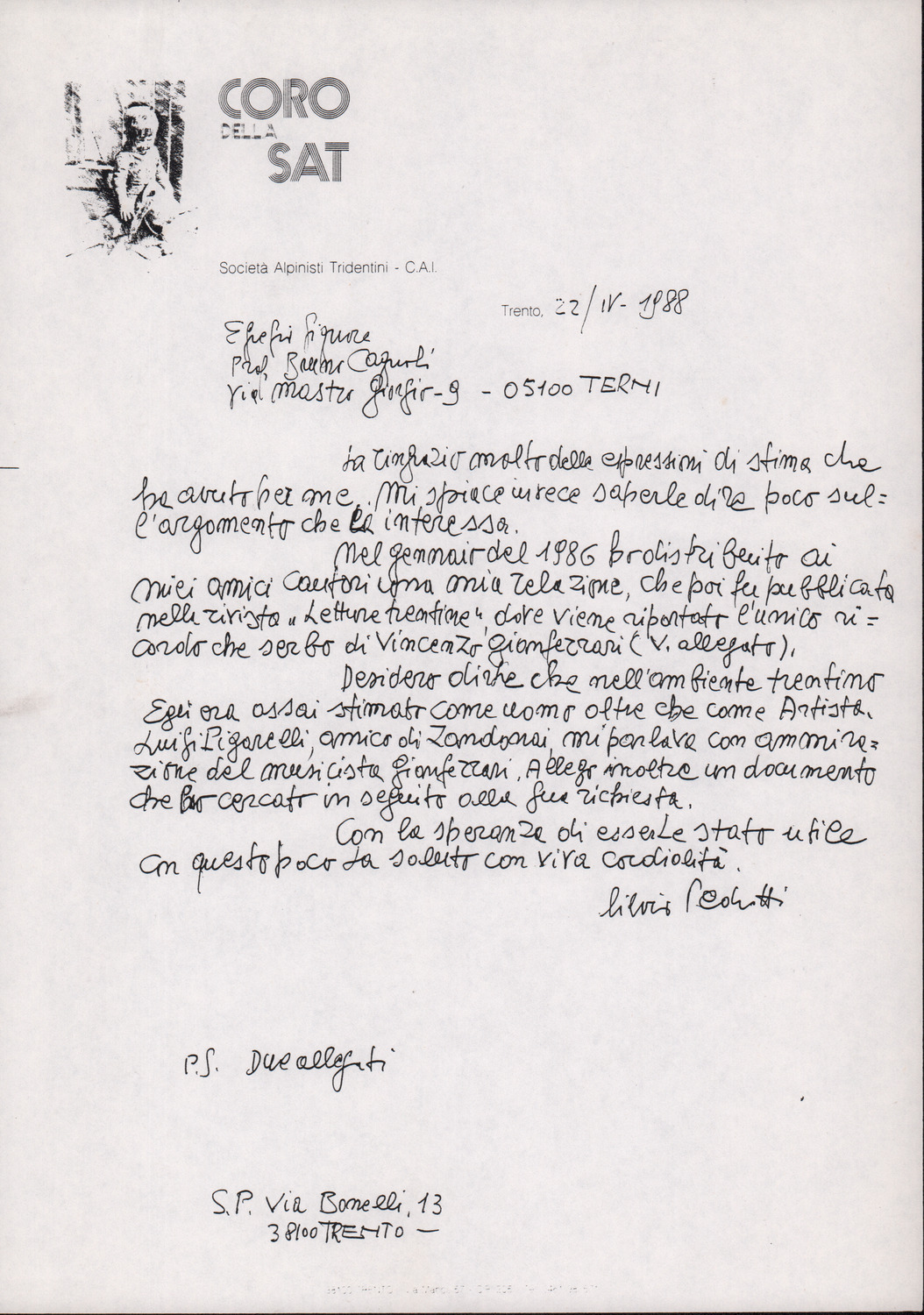 D.2.2.39 - Silvio Pedrotti a Bruno Cagnoli. Trento, 1988 aprile 22. 1 c.