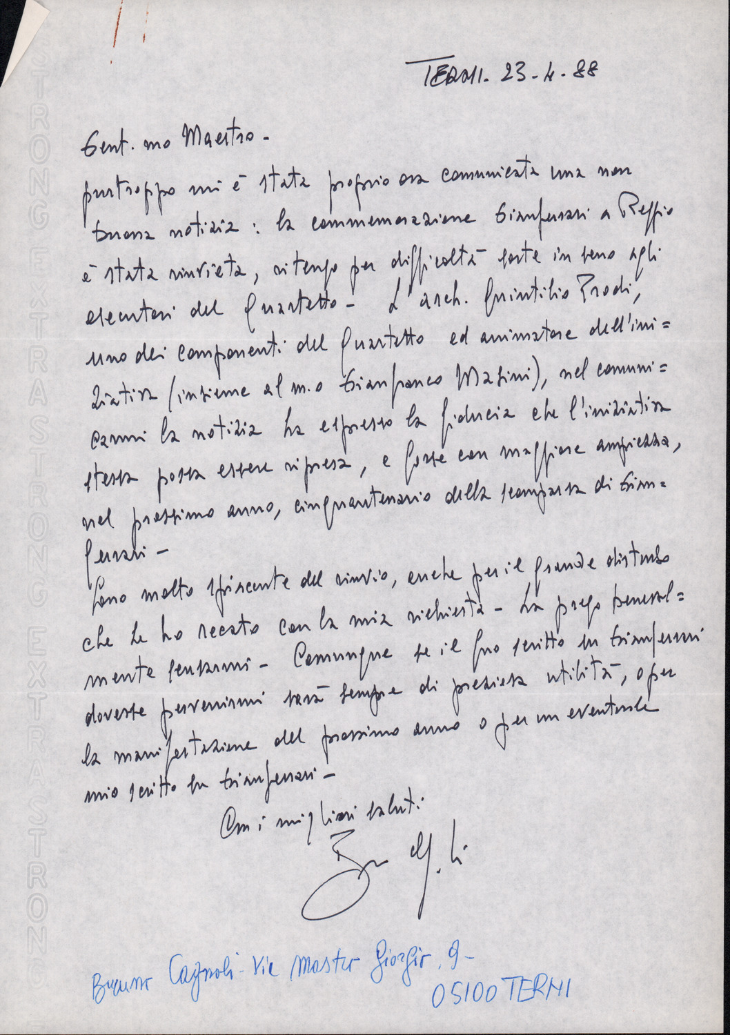 D.2.2.40 - Bruno Cagnoli a Silvio Pedrotti. Terni, 1988 aprile 23. 1 c.