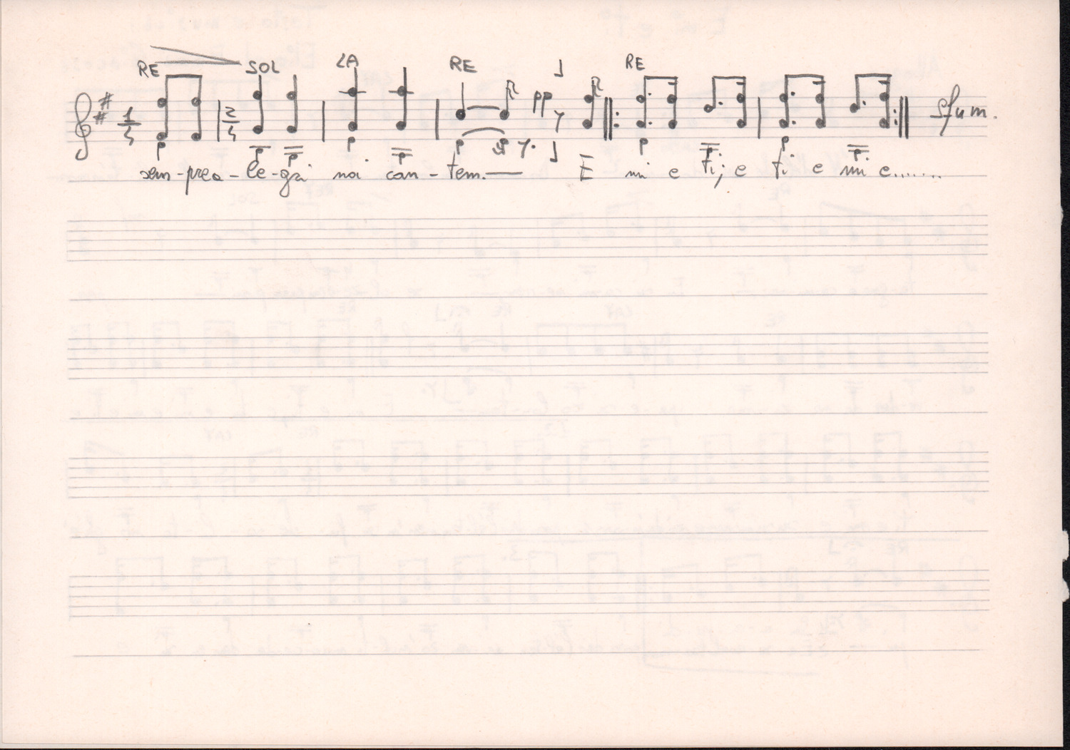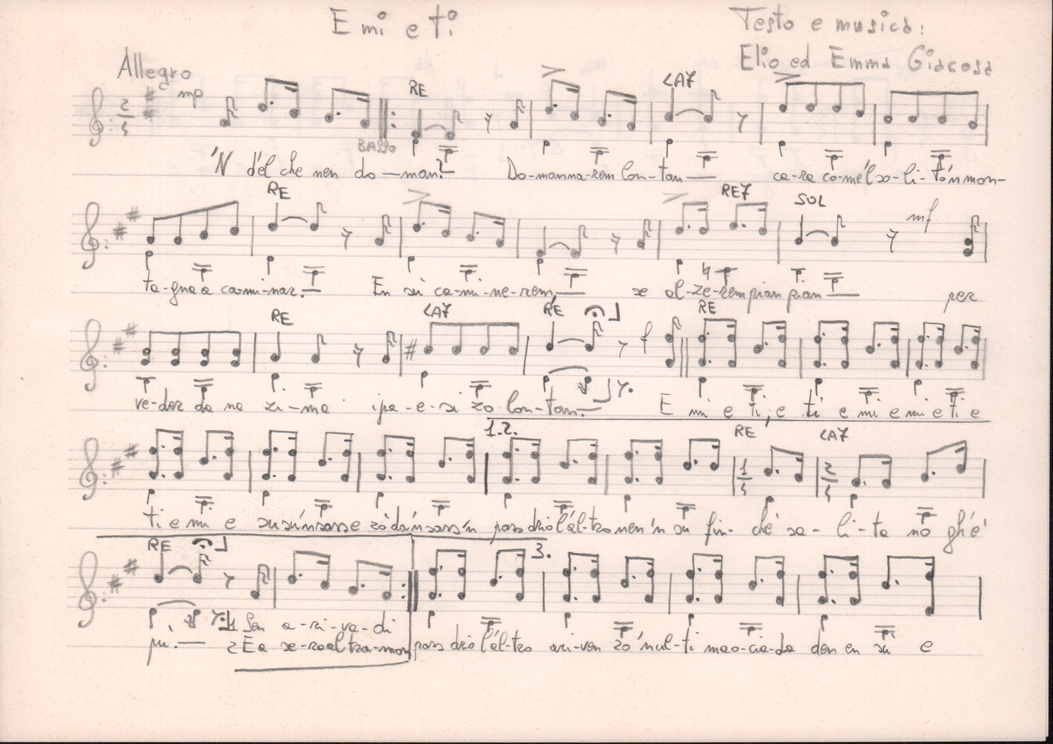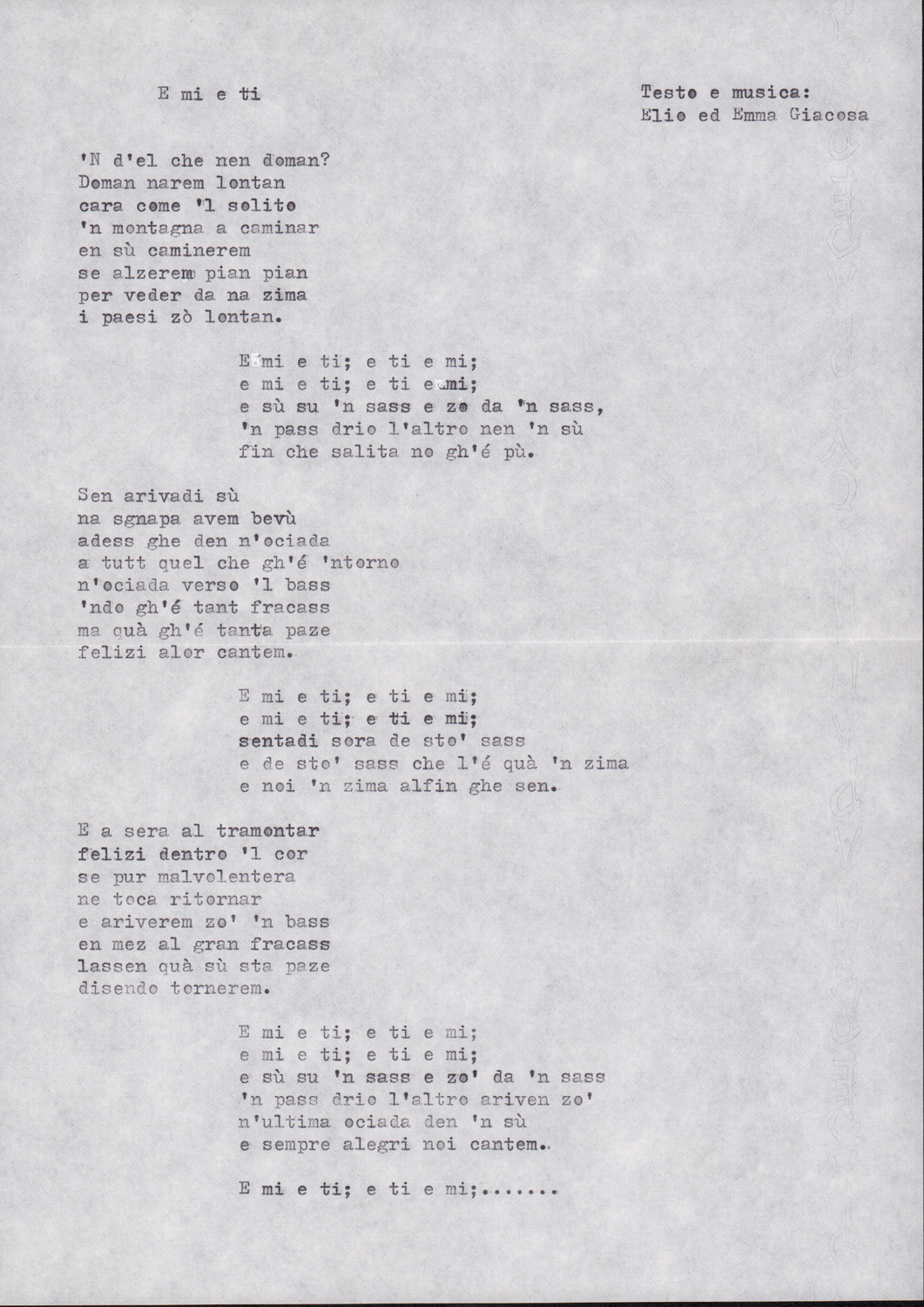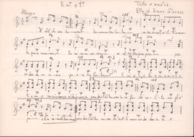 D.2.2.45 - Testo dattiloscritto e spartito manoscritto su foglio con pentagramma del canto E mi e ti (di Elio ed Emma Giacosa). 3 cc. inserite in 1 busta.