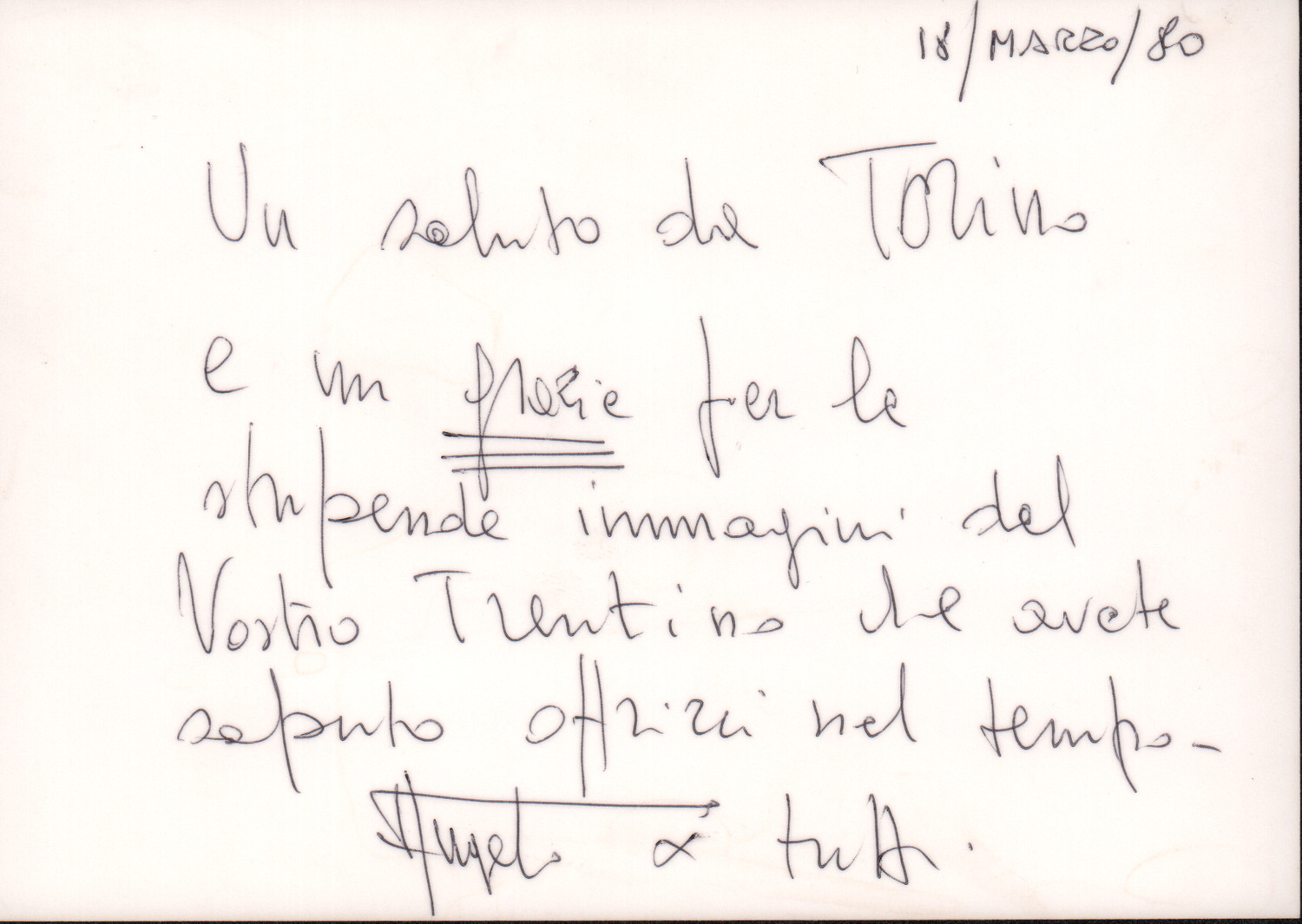 D.2.2.5 - Angelo Agazzani a Silvio Pedrotti. Torino, 1980 marzo 18. 1 cartolina.
