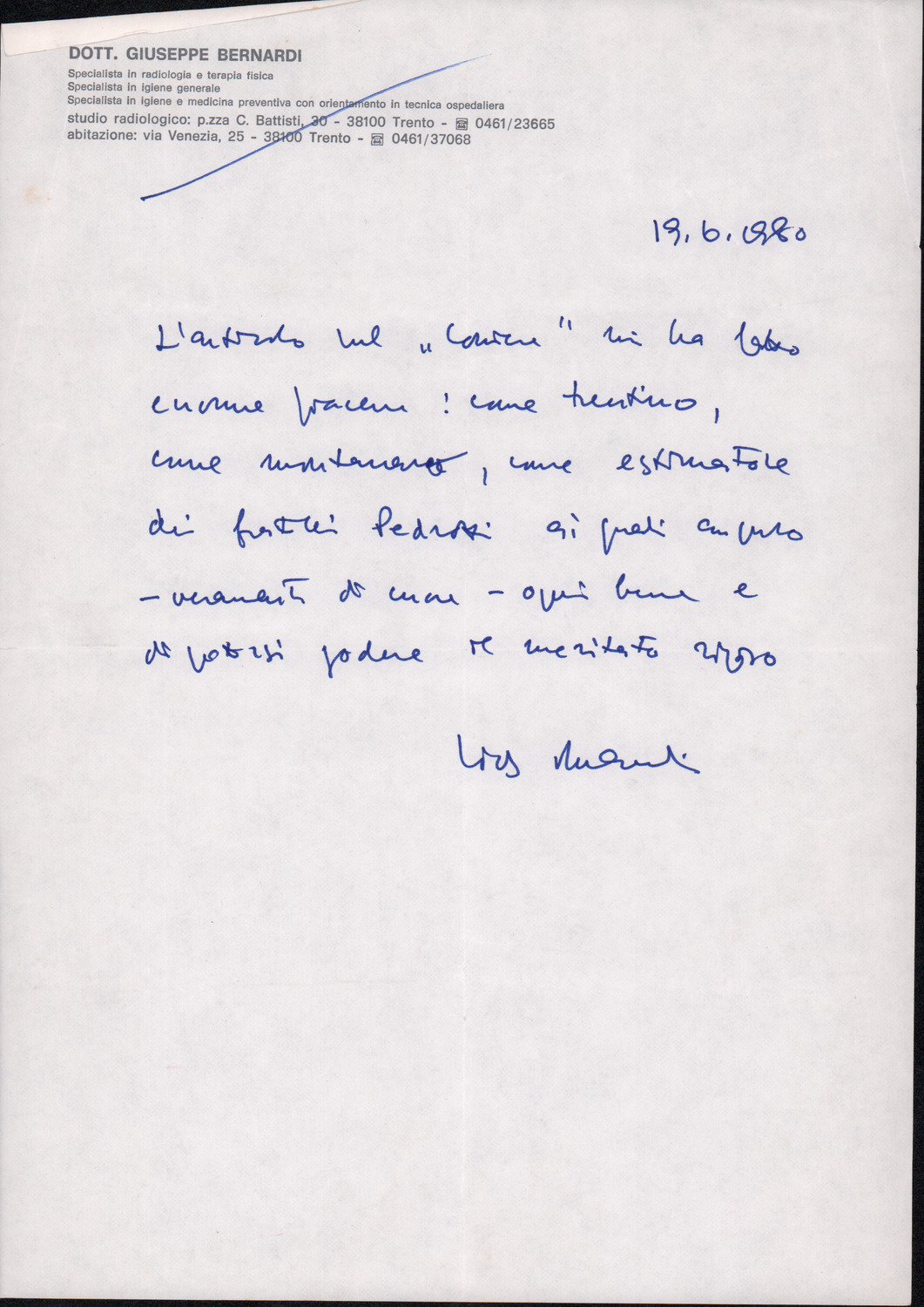 D.2.2.7 - Giuseppe Bernardi a Silvio Pedrotti. 1980, giugno 19. 1 c.