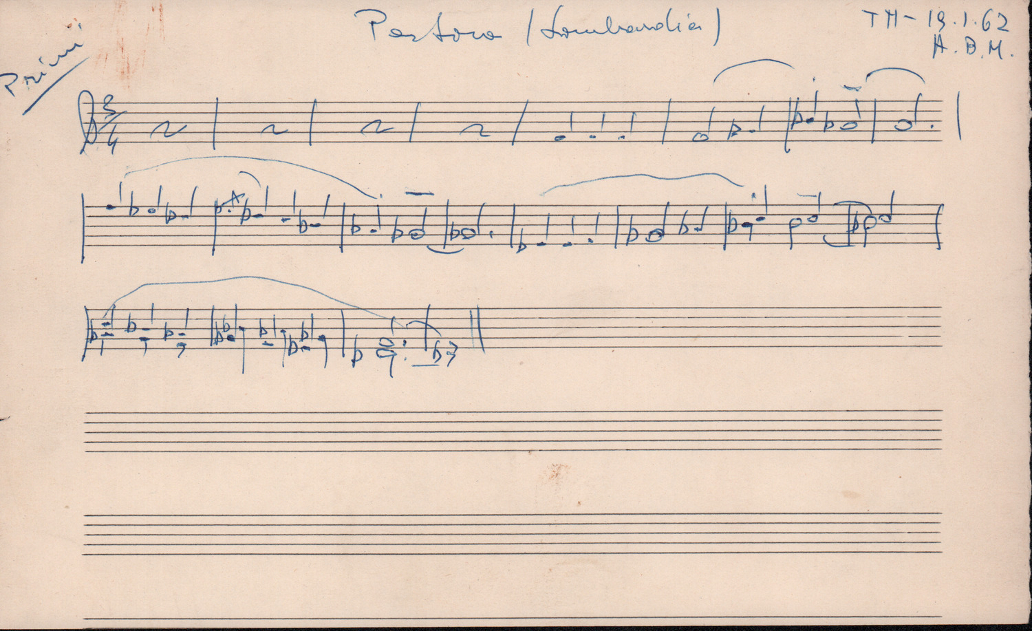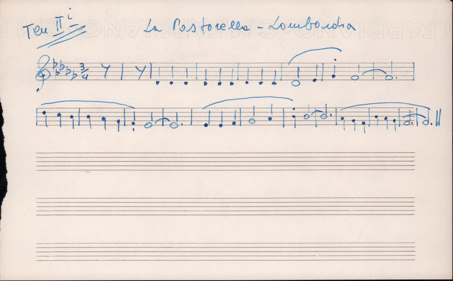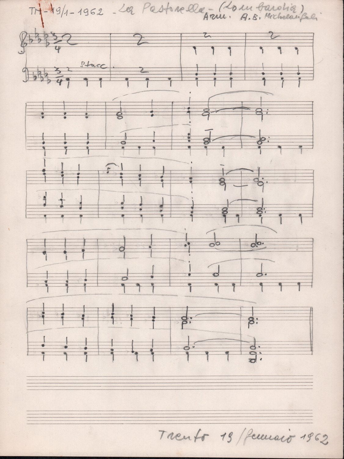 D.3.1.1 - Spartiti del canto Che fai bela pastora, originali manoscritti di Arturo Benendetti Michelangeli datati Trento, 19 gennaio 1962, e fotocopie. 12 cc.