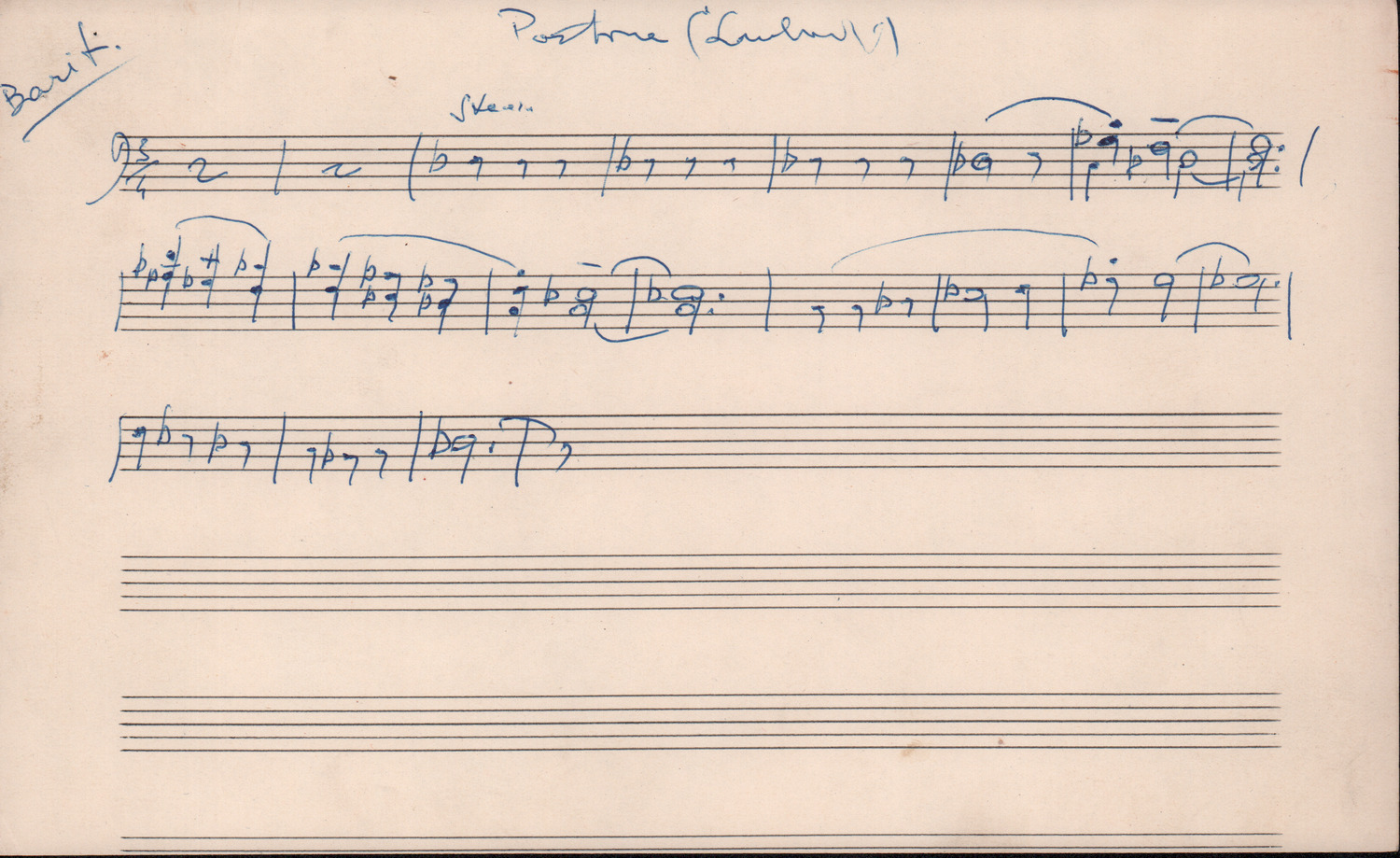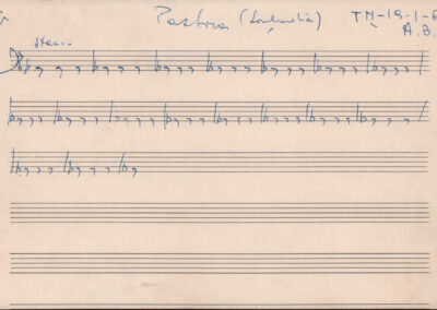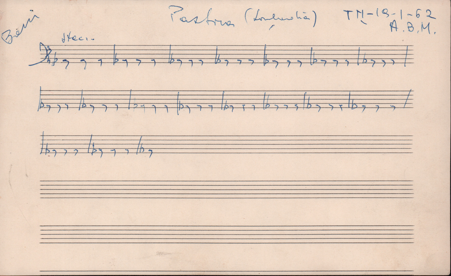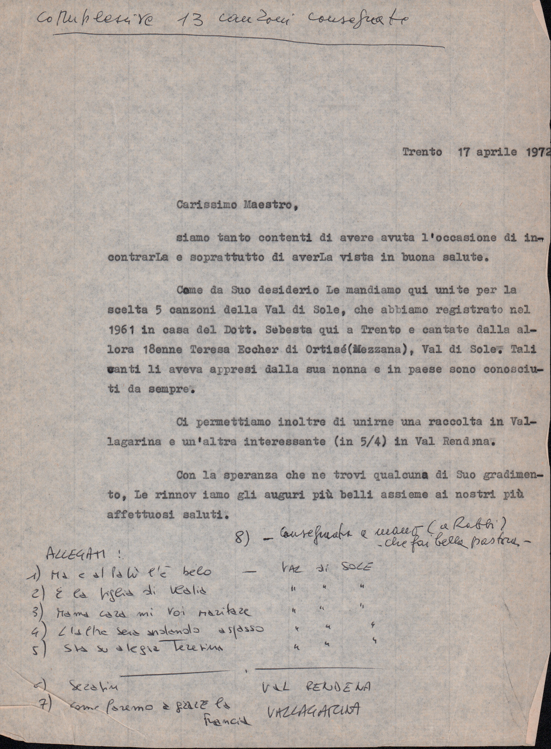 D.3.1.1 - Spartiti del canto Che fai bela pastora, originali manoscritti di Arturo Benendetti Michelangeli datati Trento, 19 gennaio 1962, e fotocopie. 12 cc.