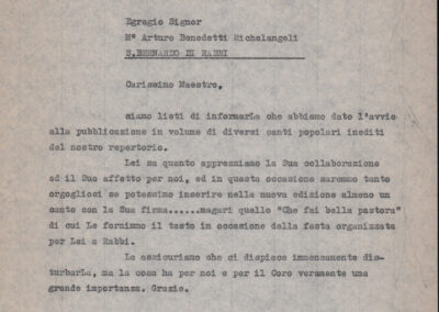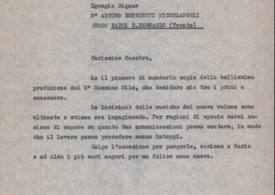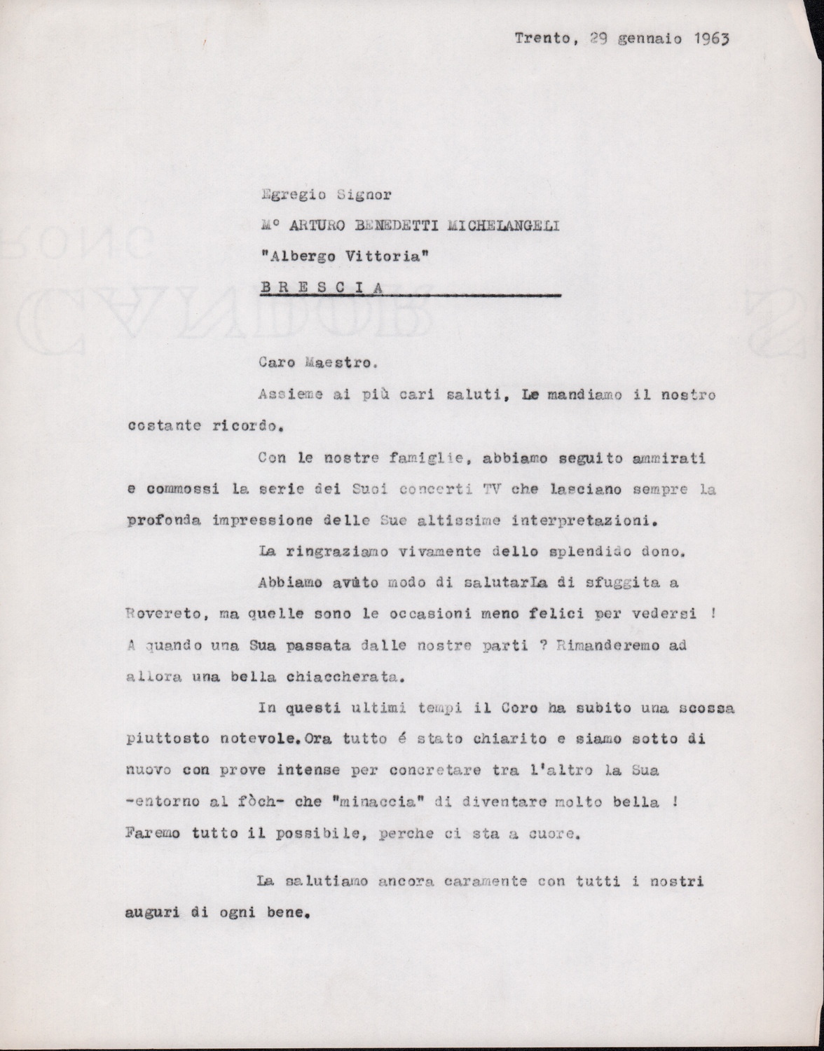 D.3.1.2 - I fratelli Pedrotti ad Arturo Benedetti Michelangeli. Trento, 1963 gennaio 29. 1 c. dattiloscritta.