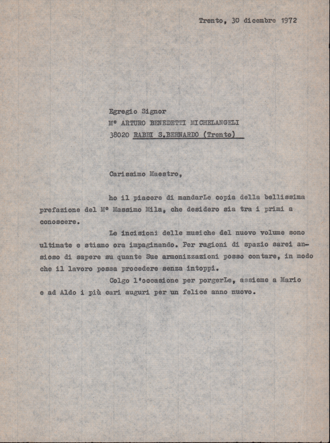D.3.1.10 - Silvio Pedrotti ad Arturo Benedetti Michelangeli. Trento, 1972 dicembre 30. 1 c. dattiloscritta.
