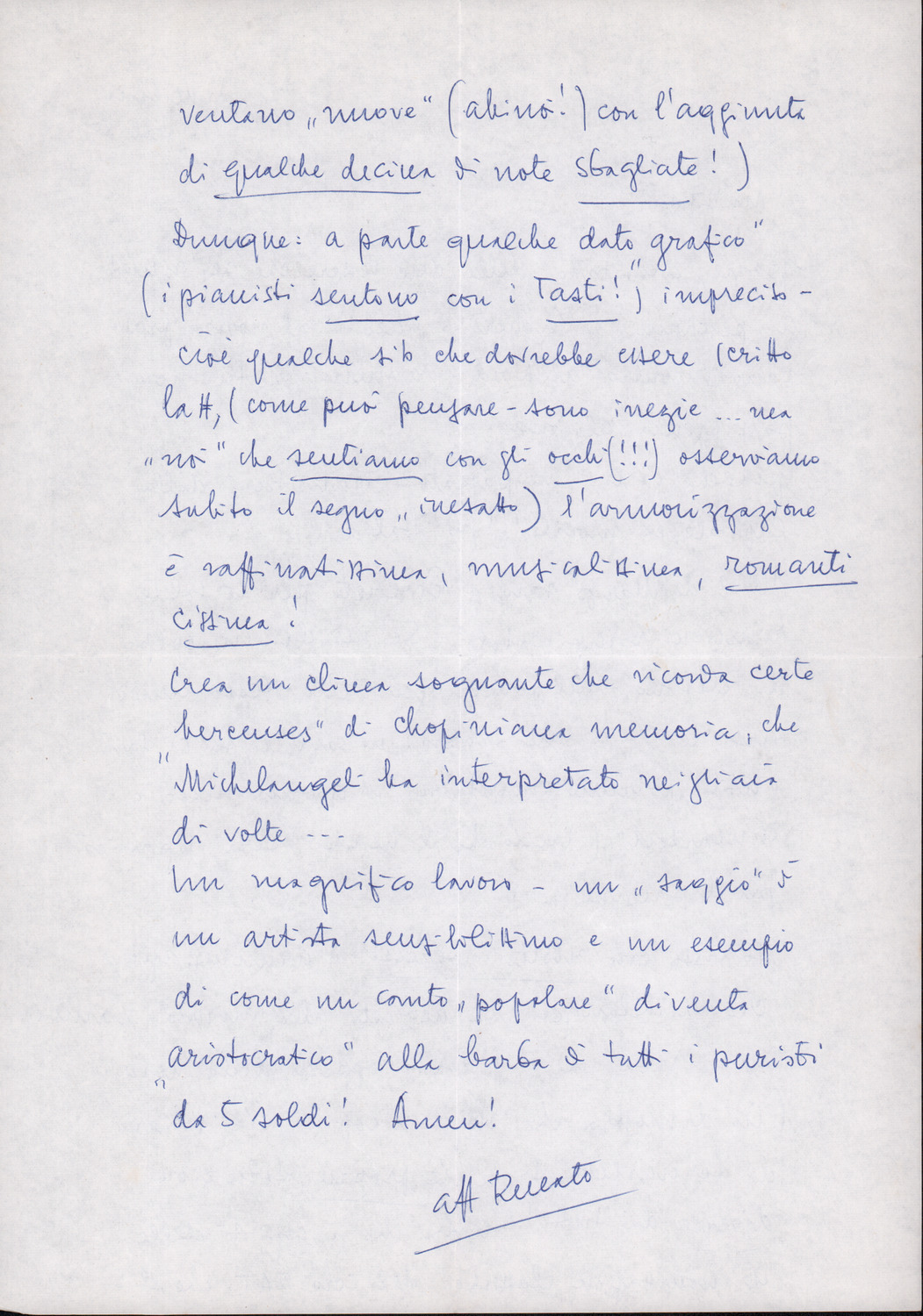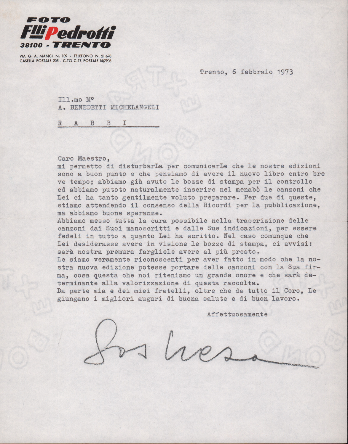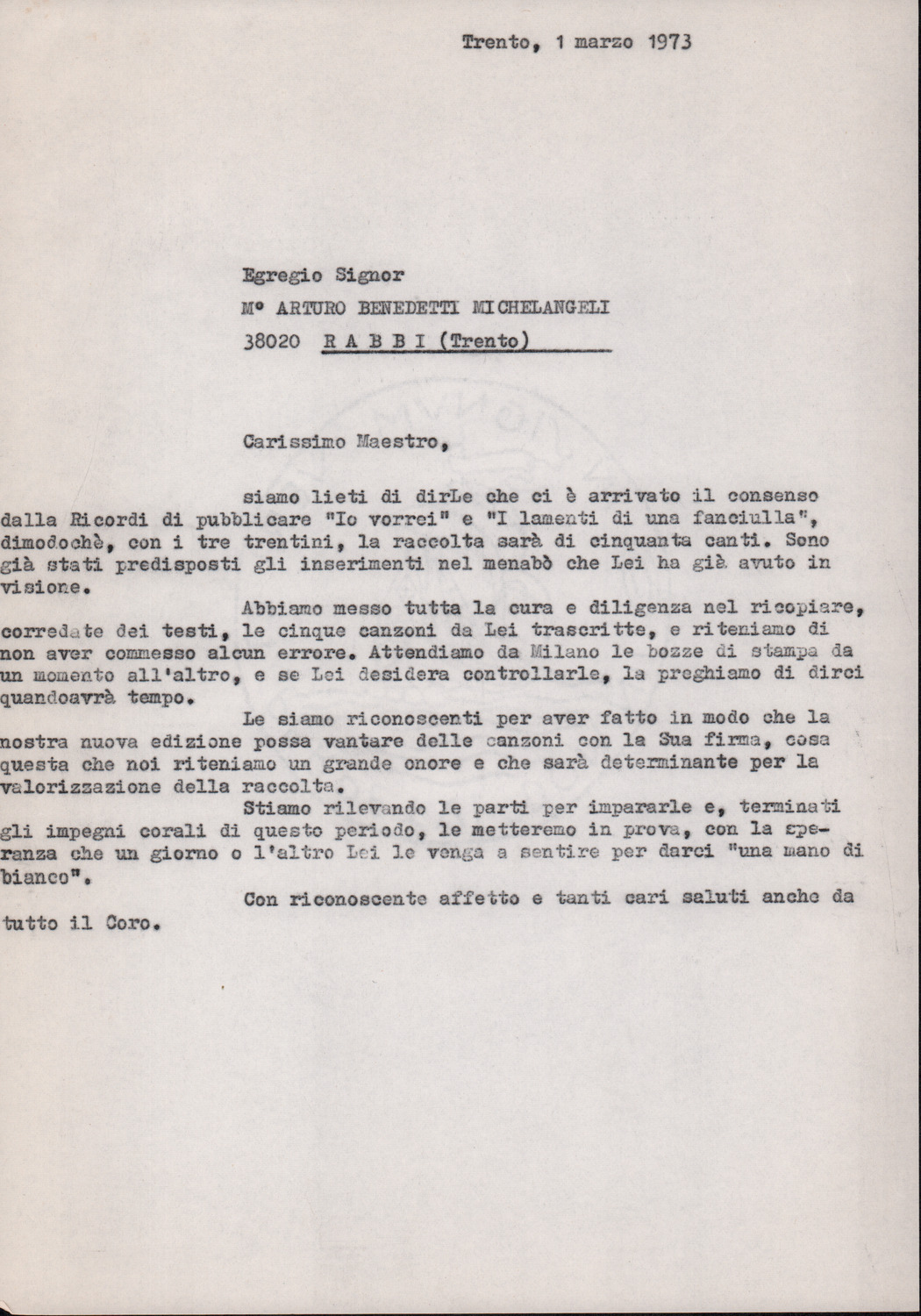 D.3.1.12 - I fratelli Pedrotti ad Arturo Benedetti Michelangeli. Trento, 1973 marzo 1. 1 c. dattiloscritta.