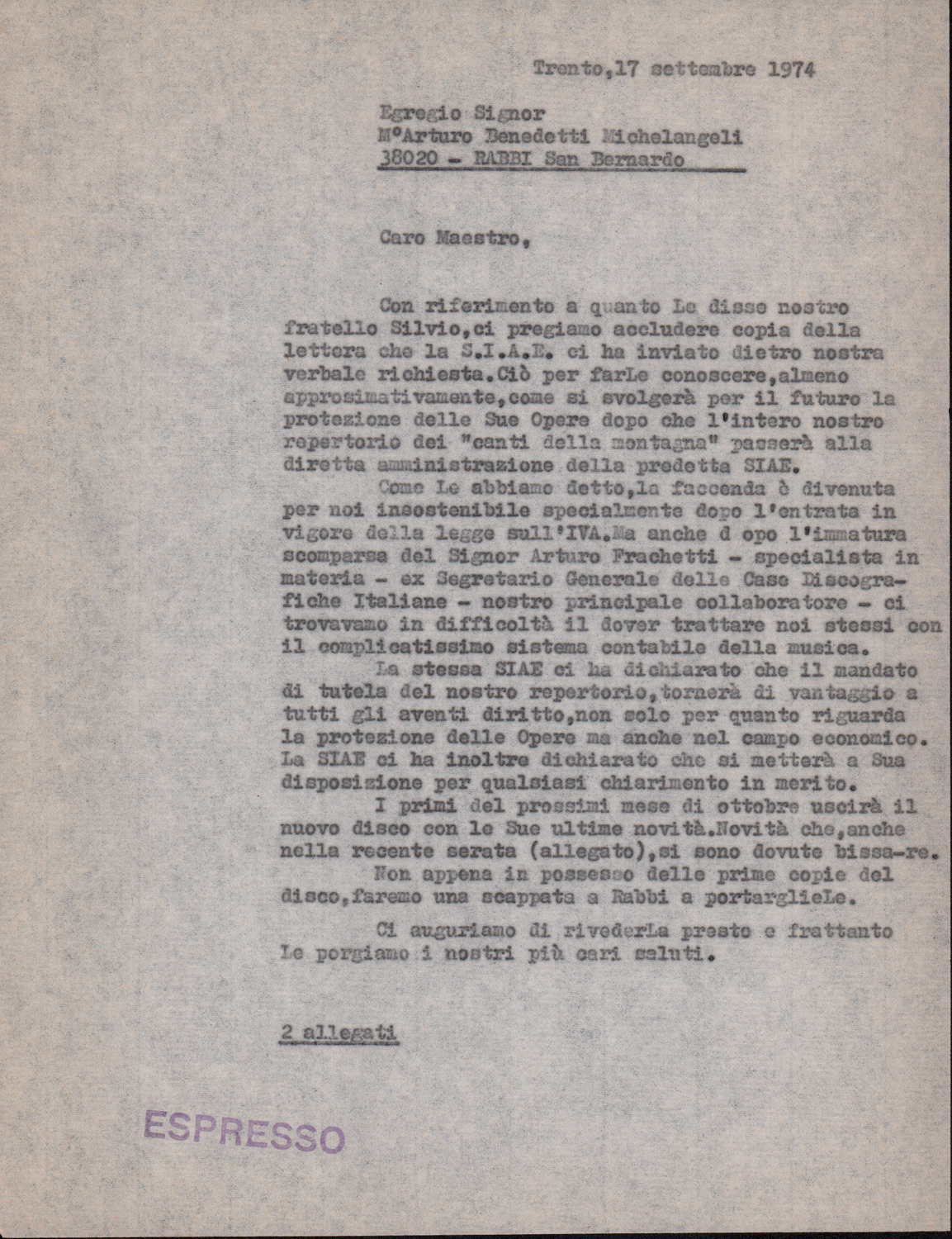 D.3.1.13 - Mario e Aldo Pedrotti ad Arturo Benedetti Michelangeli. Trento, 1974 settembre 17. 1 c. dattiloscritta.
